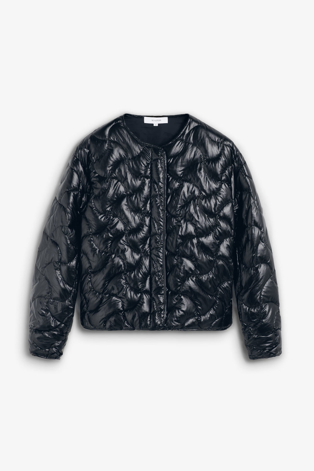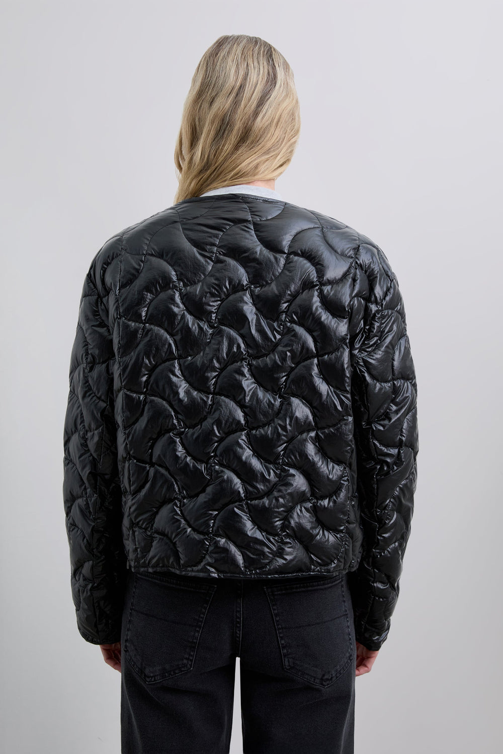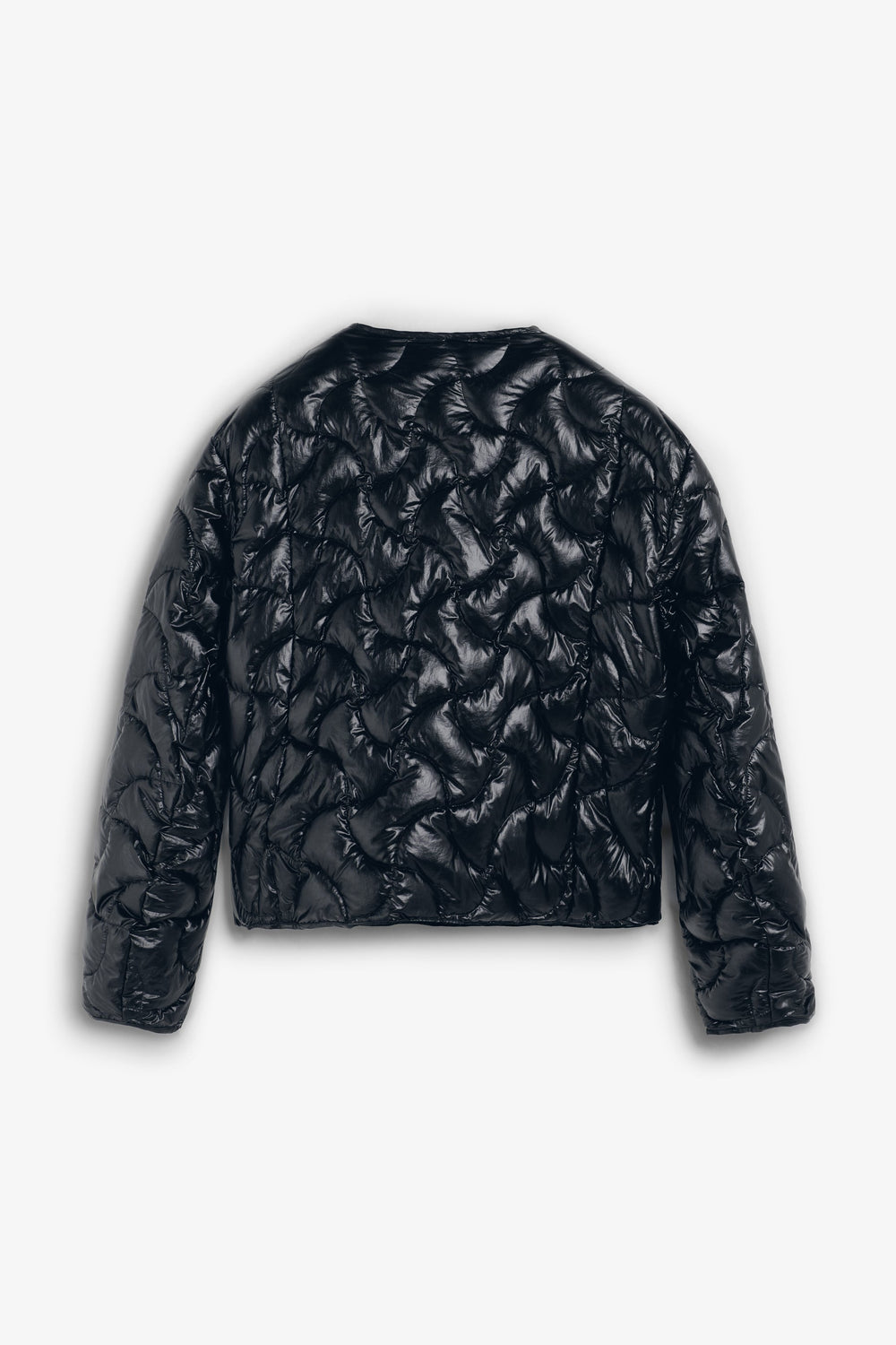 Chaqueta acolchada de corte regular. Cuello redondo. Manga larga. Cierre de botones a presión y cremallera en la parte delantera. Bajo redondeado. Detalle de ribete alrededor de las mangas, los bolsillos y el bajo.