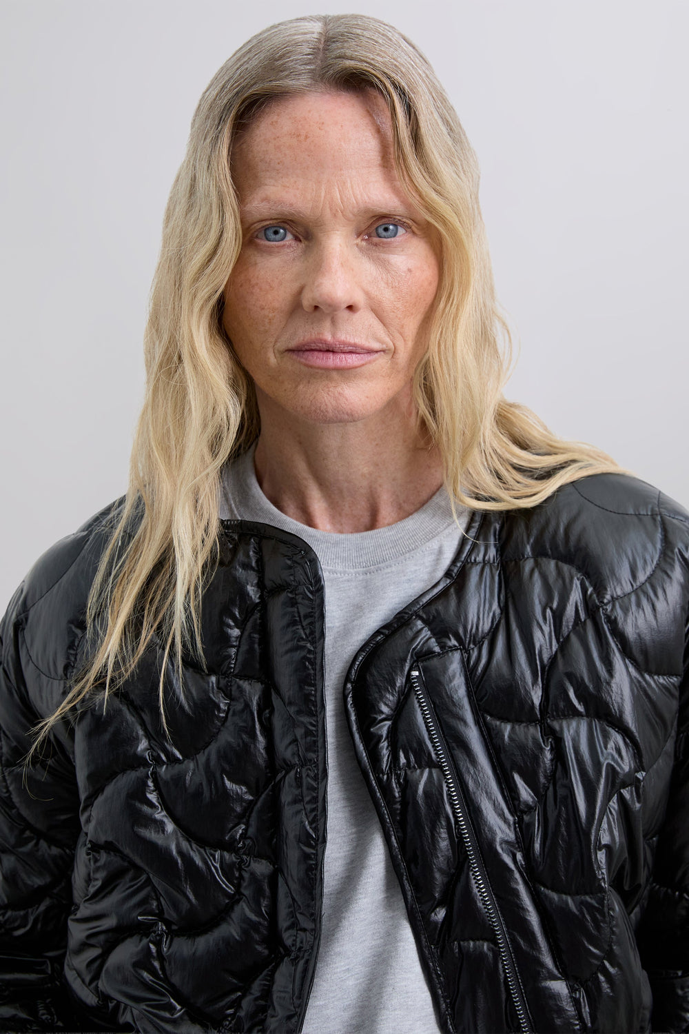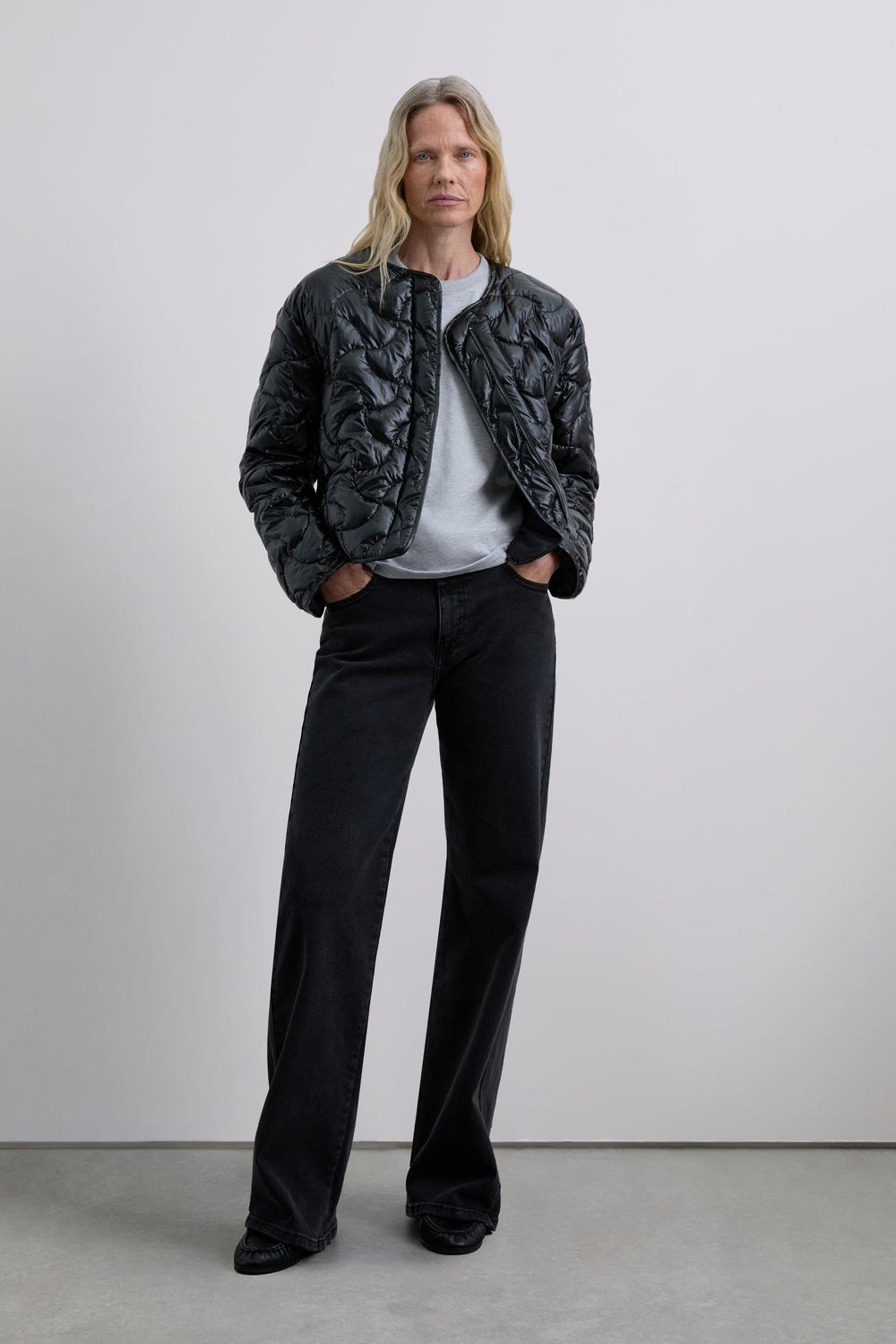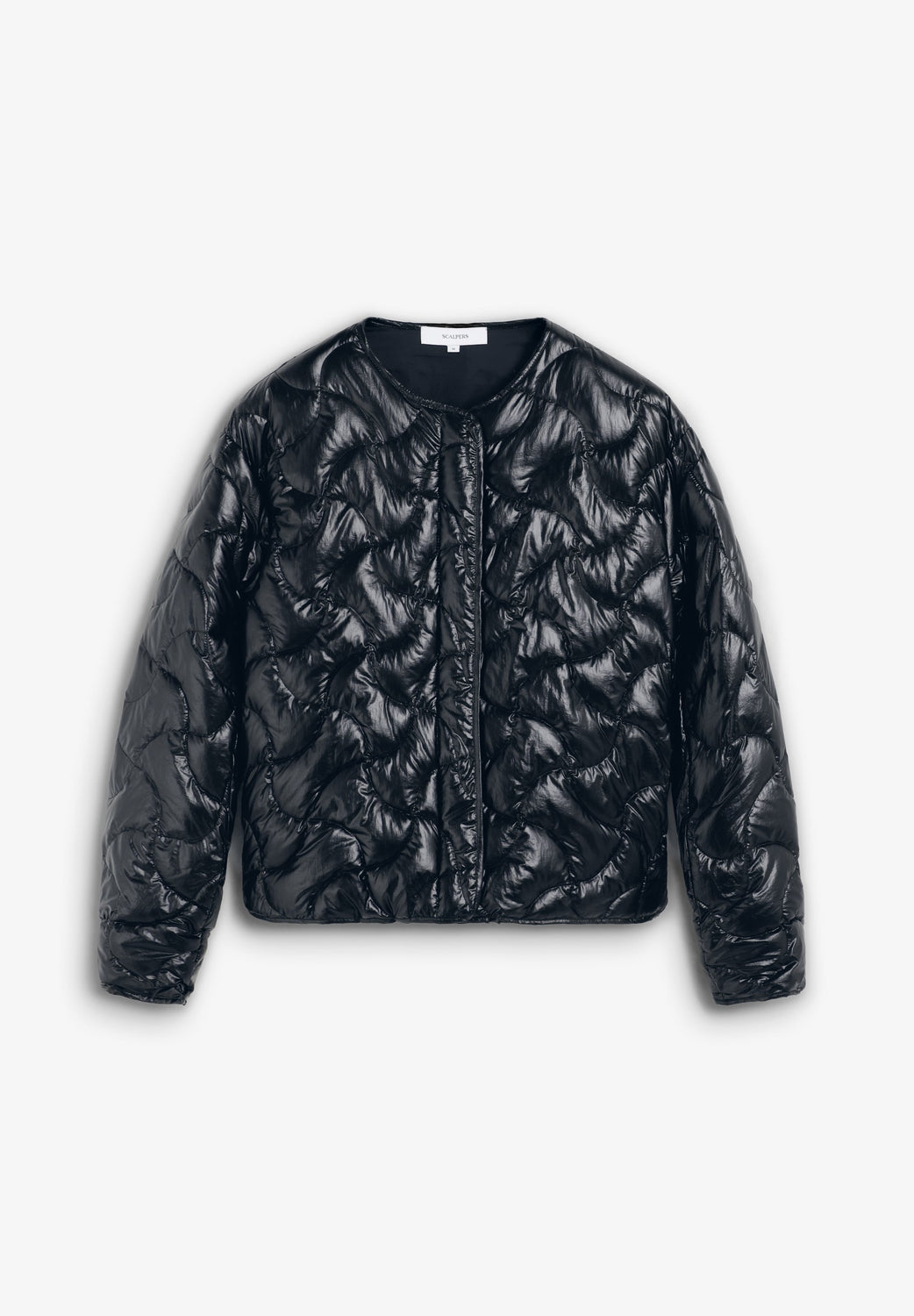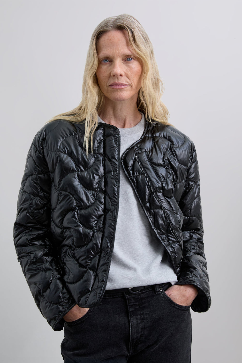 Chaqueta acolchada de corte regular. Cuello redondo. Manga larga. Cierre de botones a presión y cremallera en la parte delantera. Bajo redondeado. Detalle de ribete alrededor de las mangas, los bolsillos y el bajo.