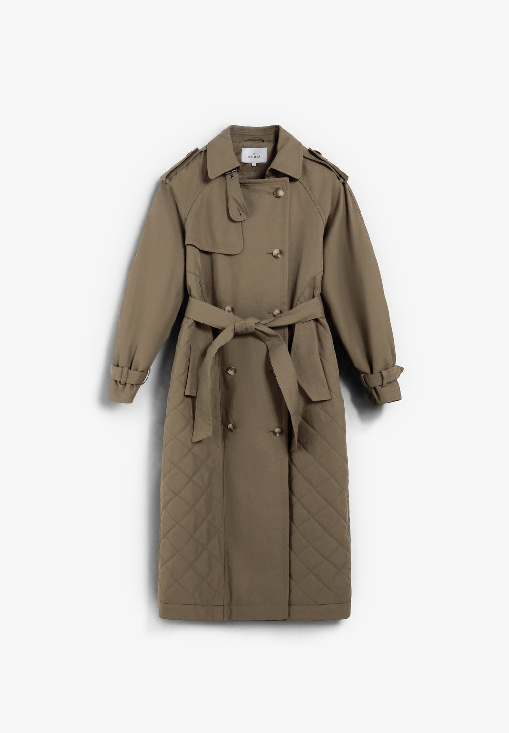 Abrigo trench acolchado e impermeable confeccionado en algodón. Detalle acolchado en la parte inferior. Mangas voluminosas y trabillas en los puños. Cierre frontal con botones y cinturón ajustable.