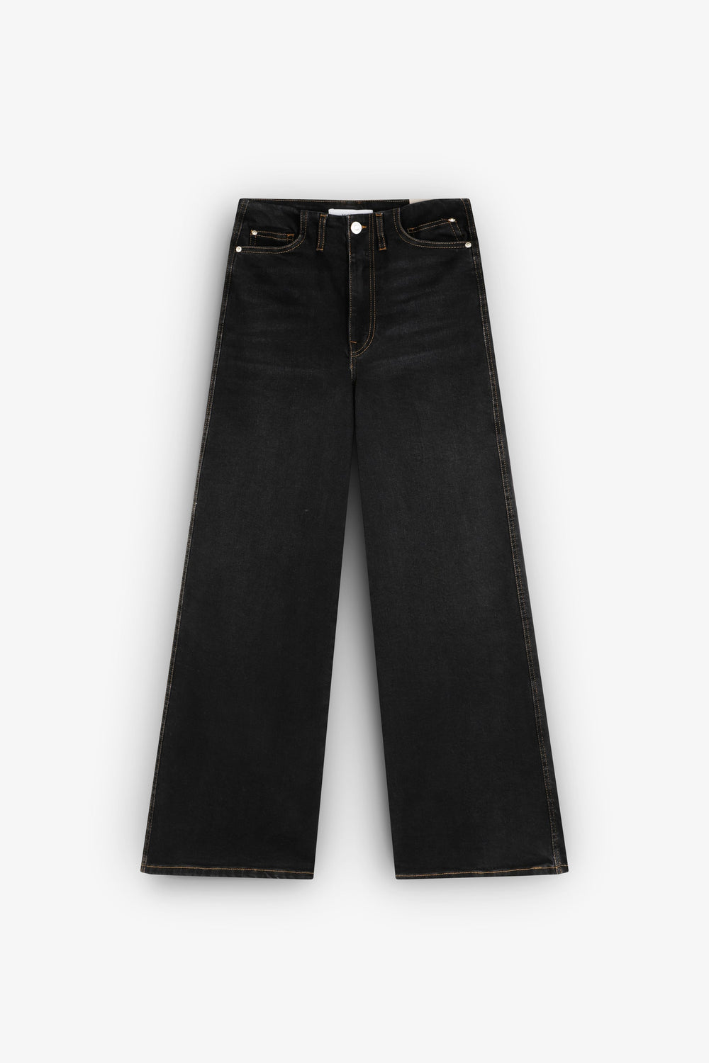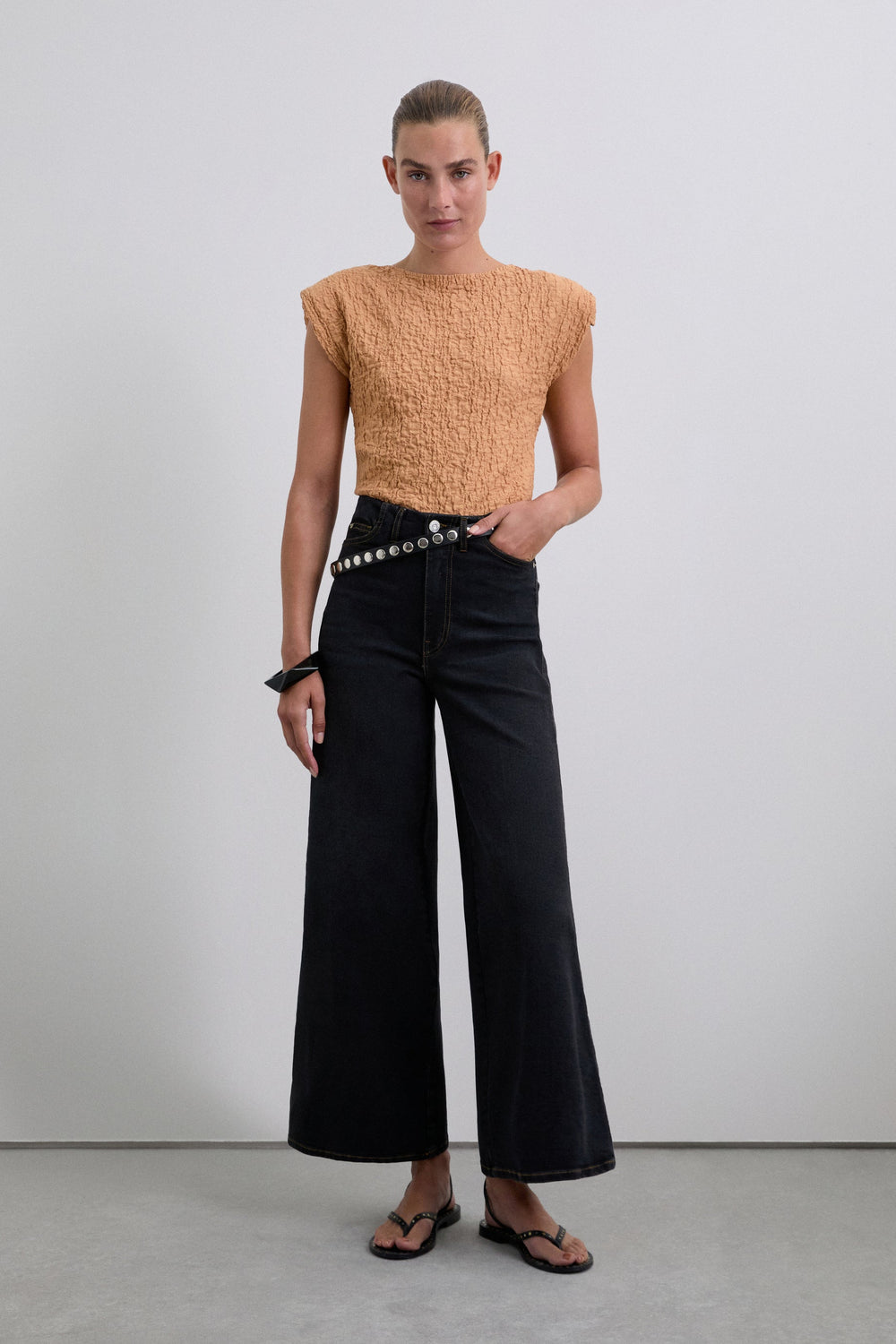Pantalón denim confeccionado en algodón con ligero elastano. Corte culotte, cintura alta y cierre con cremallera y botón. Bolsillos delanteros y traseros.