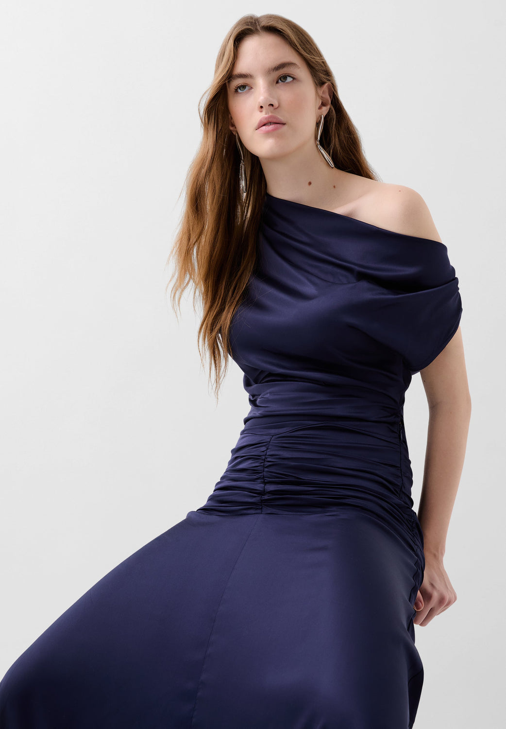 Vestido midi satinado. Confeccionado en tejido fluido. Corte Regular fit. Escote barco con detalle drapeado y frunces en cintura. Manga en sisa. Cierre con cremallera.