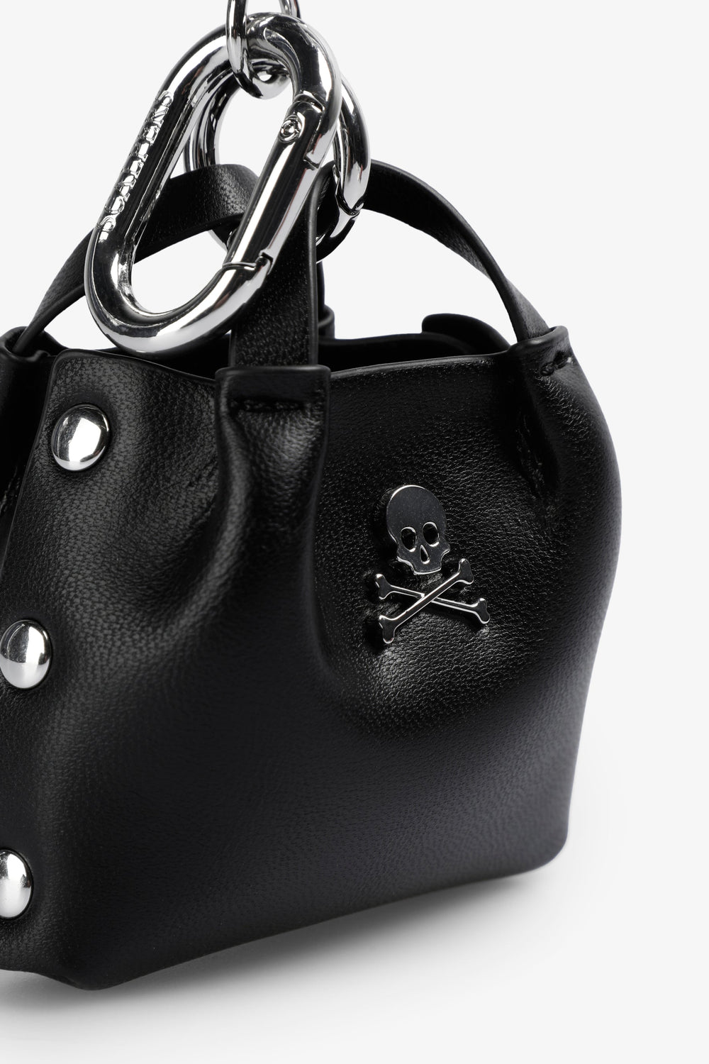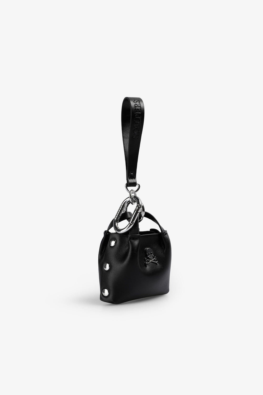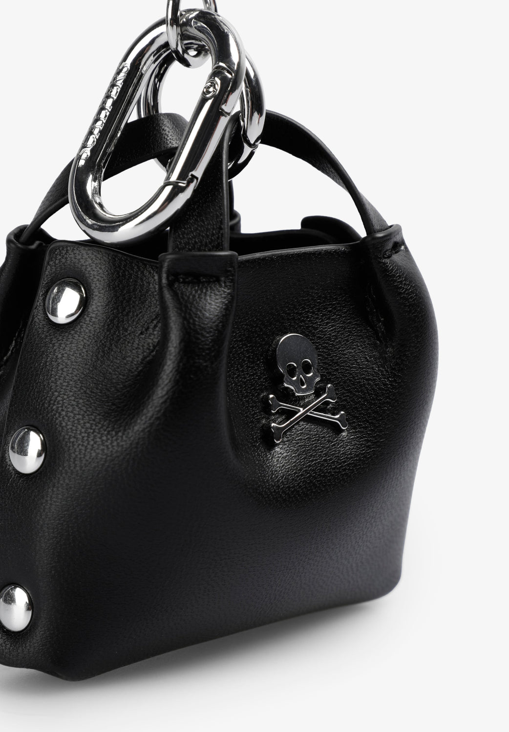 Llavero en forma de mini bolsa con parche de logo metálico.