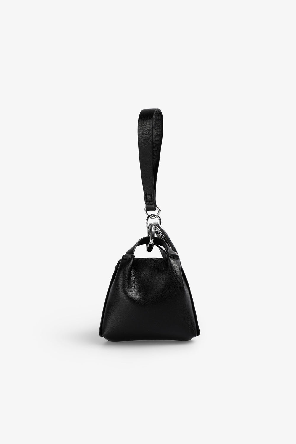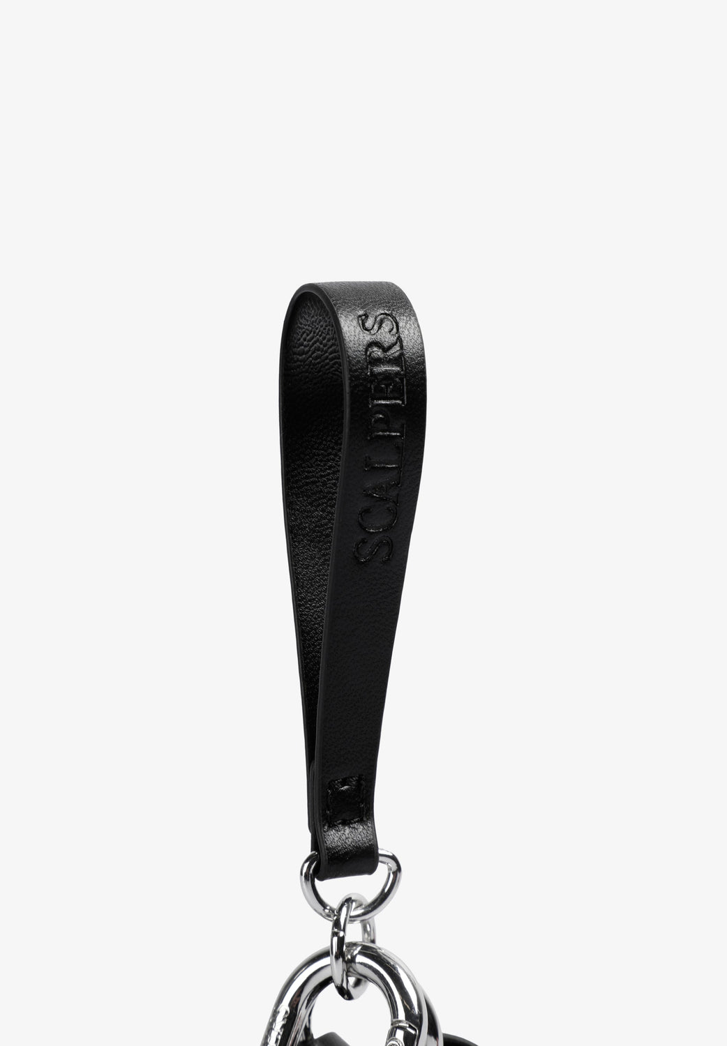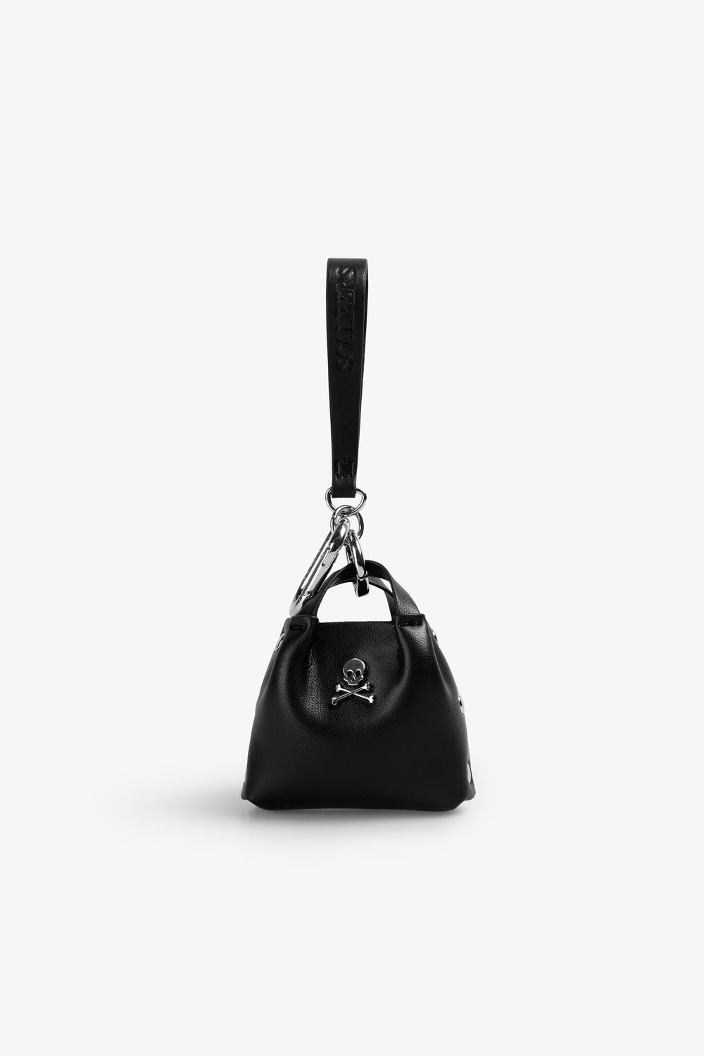 Llavero en forma de mini bolsa con parche de logo metálico.