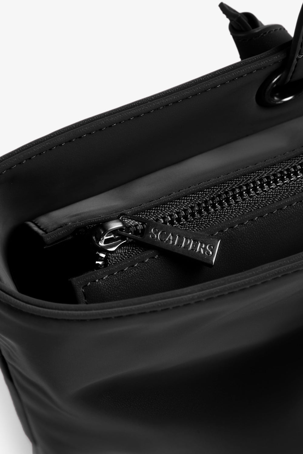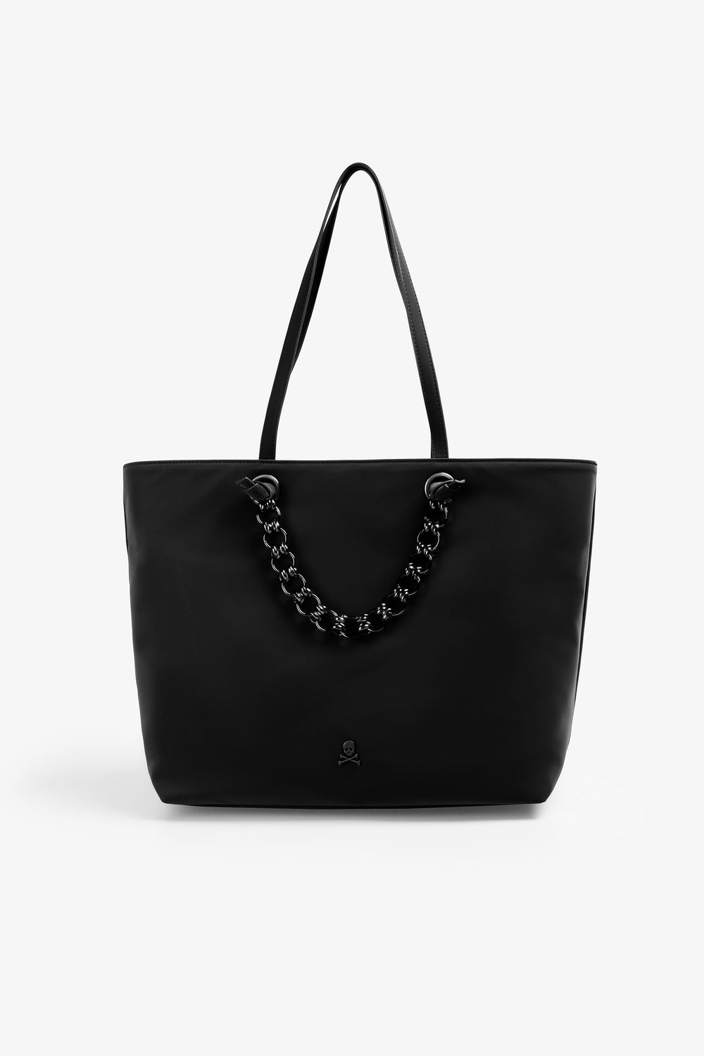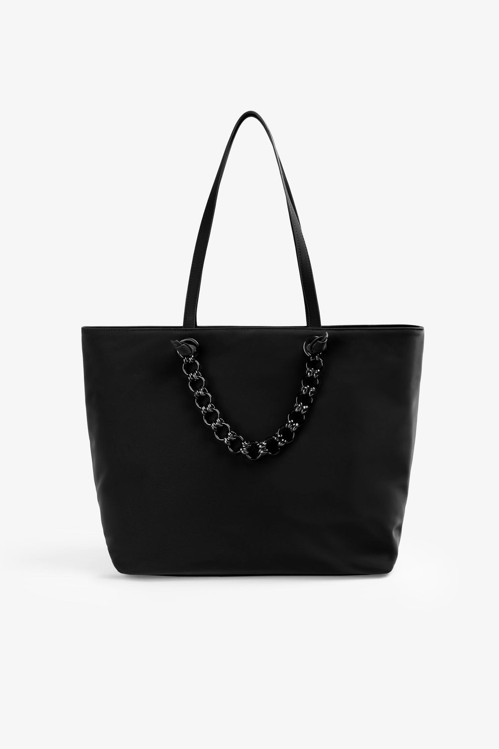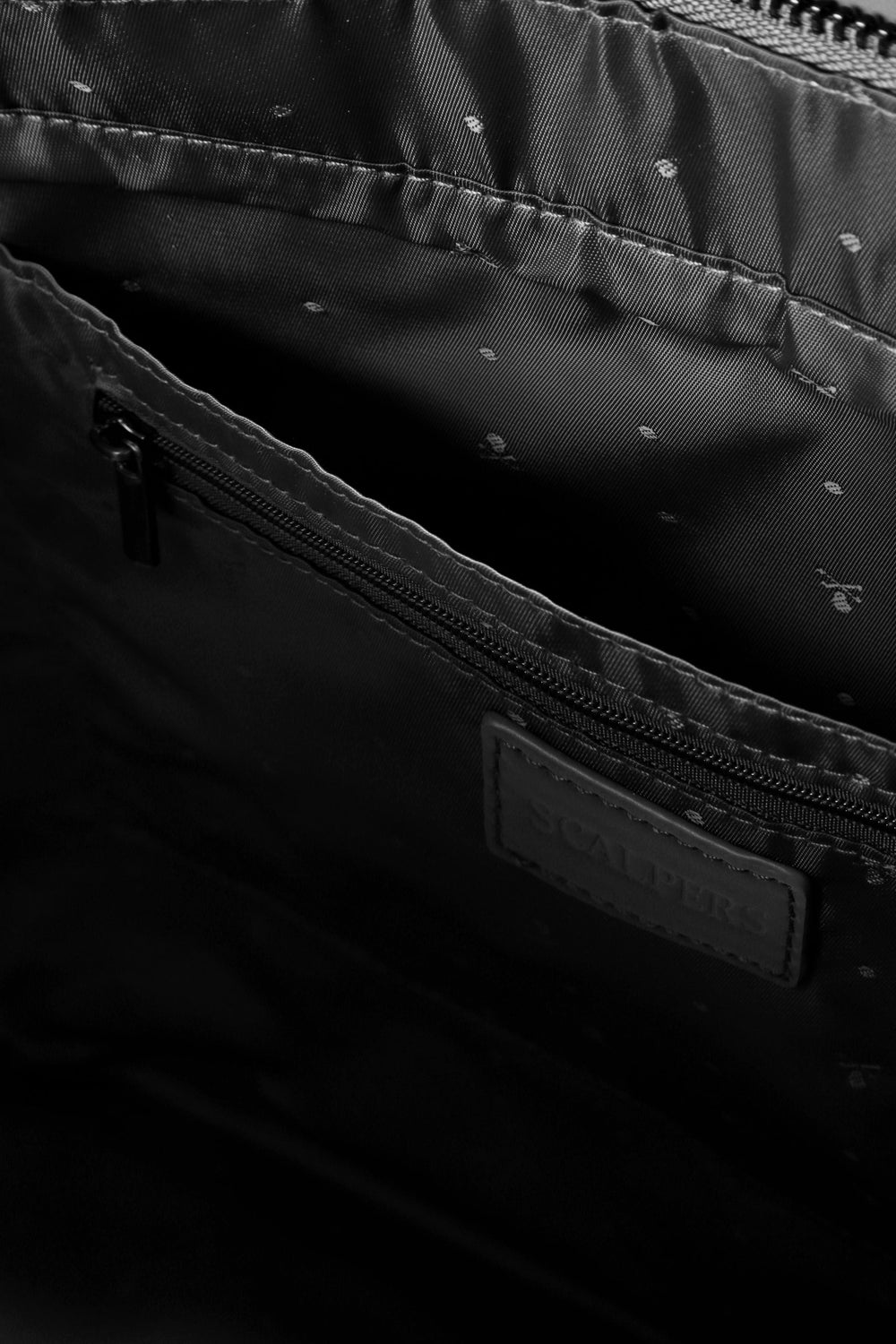 Bolso shopper confeccionado en piel sintética. Forro interior con doble bolsillo, uno con cremallera. Cierre con cremallera. Asa de hombro. Detalle de cadena y logo metalizado en la parte frontal.