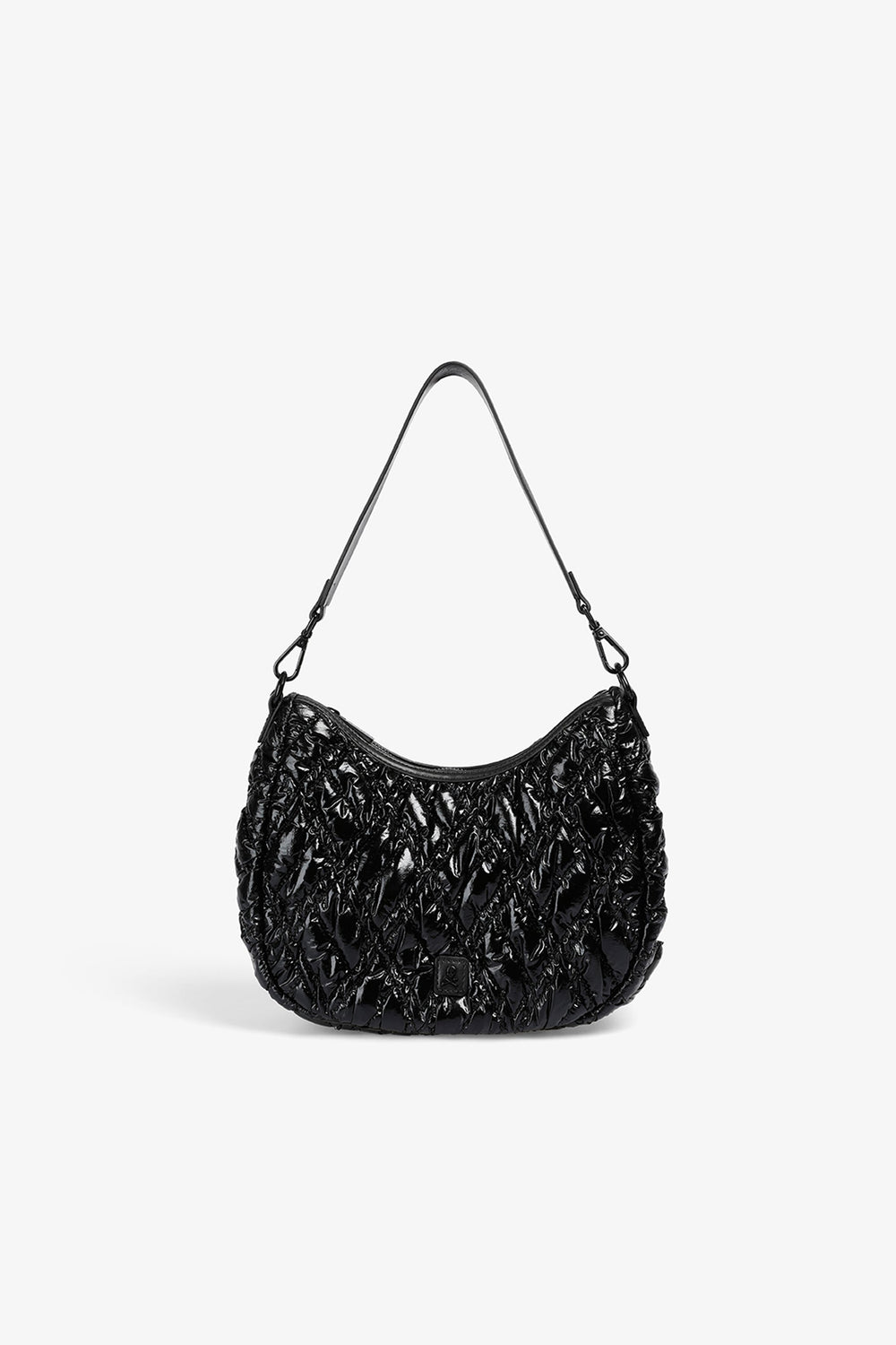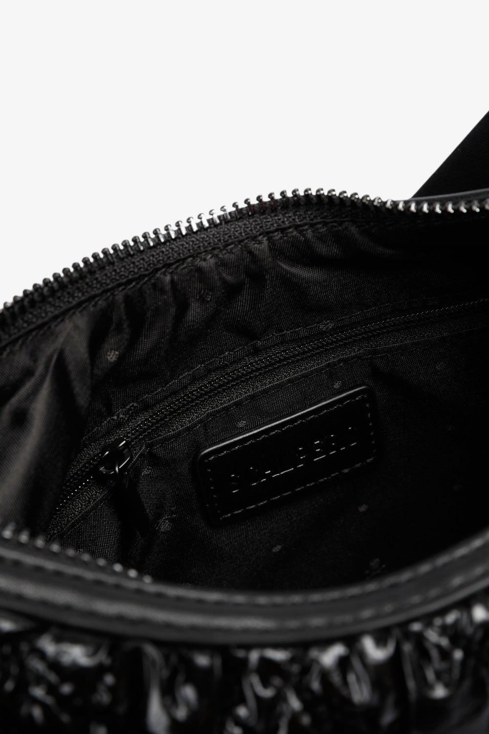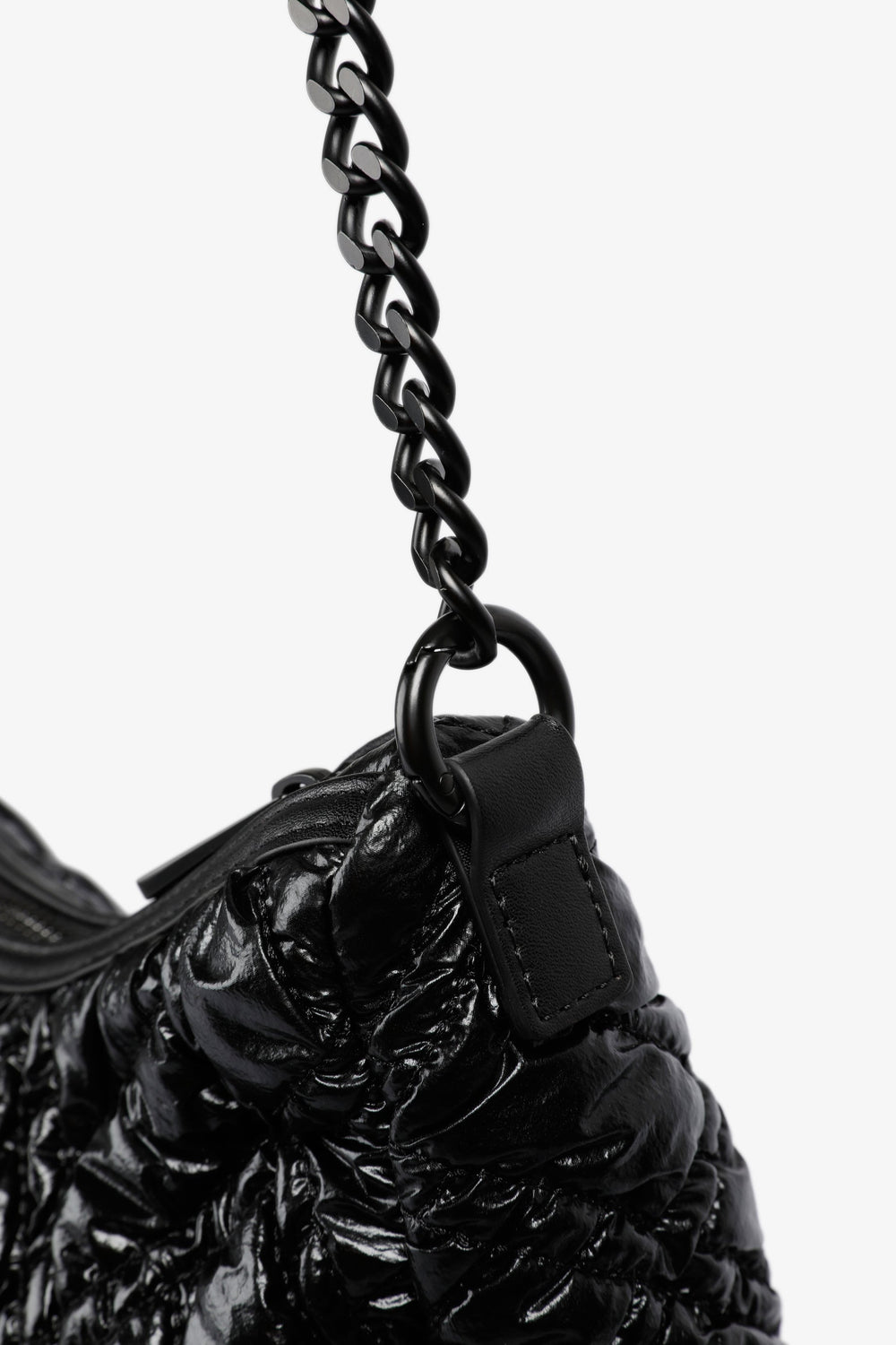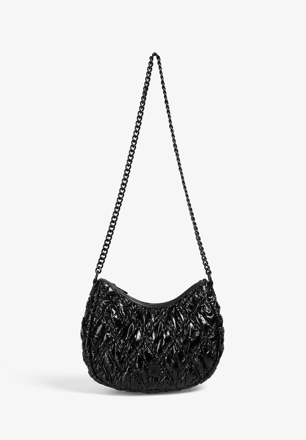 Bolso de hombro acolchado confeccionado en PU. Forro interior con cremallera y cierre mediante cremallera. Opción de doble asa, corta y de cadena. Detalle de parche con logo en frontal.