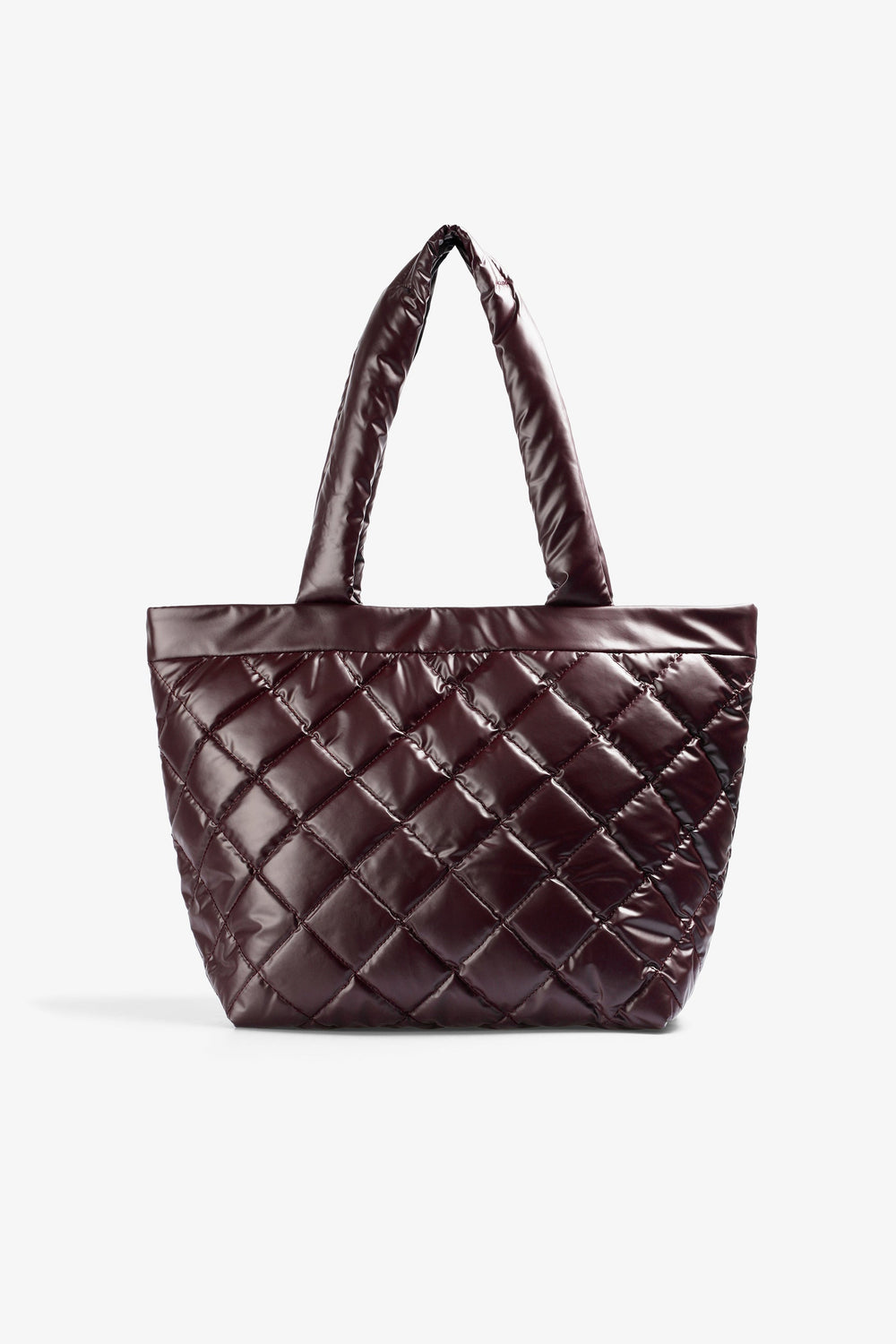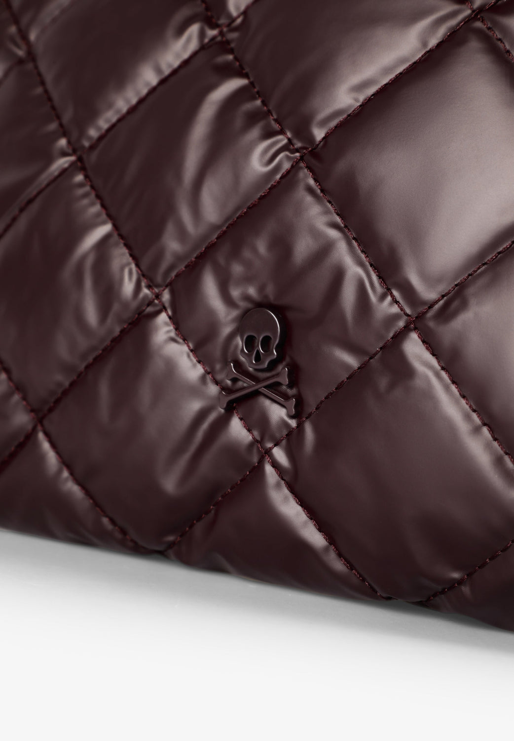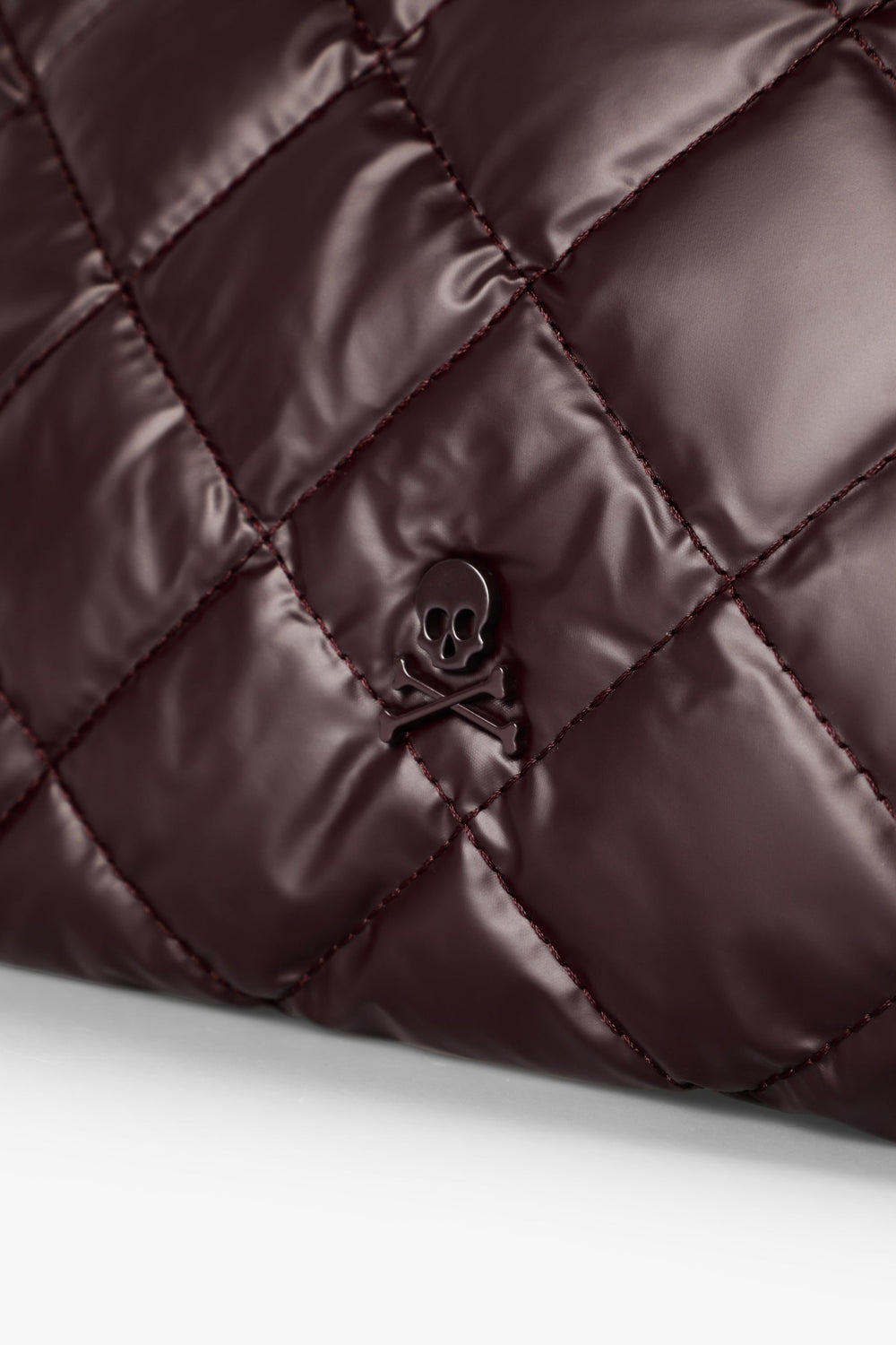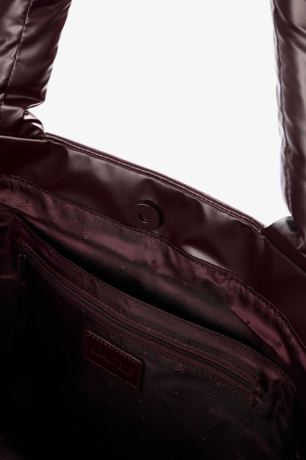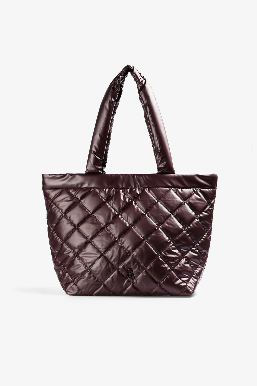 Bolso shopper acolchado. Doble asa. Cierre mediante botón imantado. Forro y bolsillo interior con cierre mediante cremallera. Detalle de logo en bolsillo y parche de calavera metalizada frontal.
