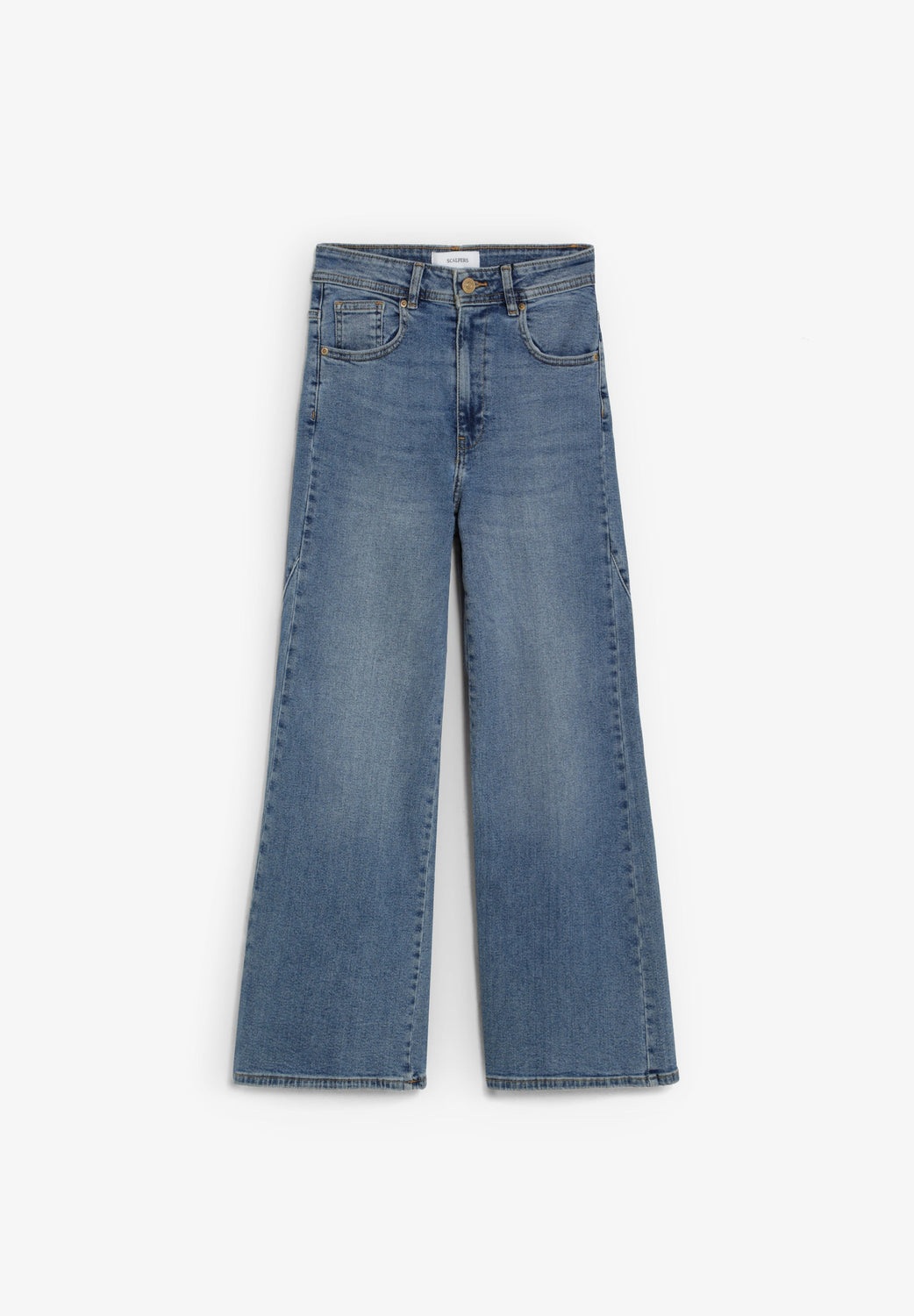 Pantalón denim confeccionado en algodón BCI ligeramente elásticos. Corte regular fit, relaxed flare. High Rise, Cierre con cremallera y botón. Trabillas en cintura y bolsillos delanteros y traseros.