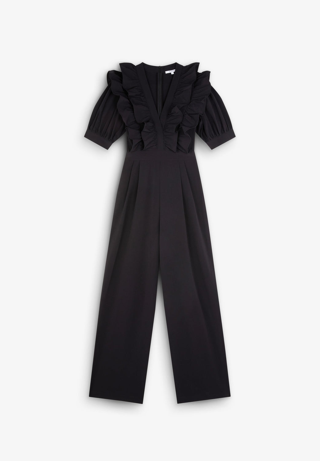 Mono negro. Corte Regular fit, escote en V con detalle de volantes, manga abullonada con terminación, entallado en cintura y corte pantalón Full Length. Cierre con cremallera trasera.