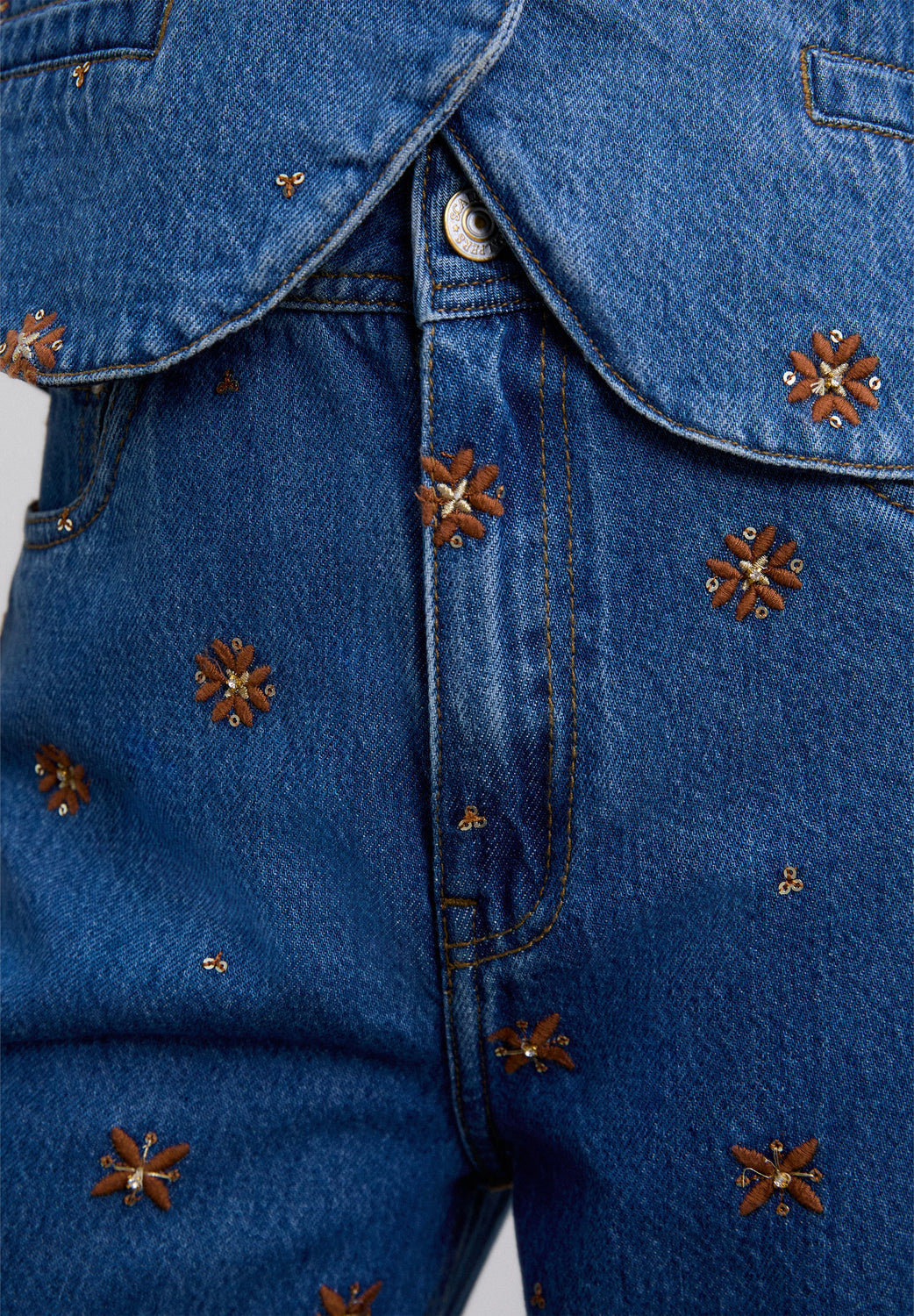 Pantalón recto denim de cintura alta. Detalles de flores bordadas. Bolsillos delanteros y traseros. Cierre mediante botón y trabillas en cintura. Detalle logo en etiqueta parte trasera.
