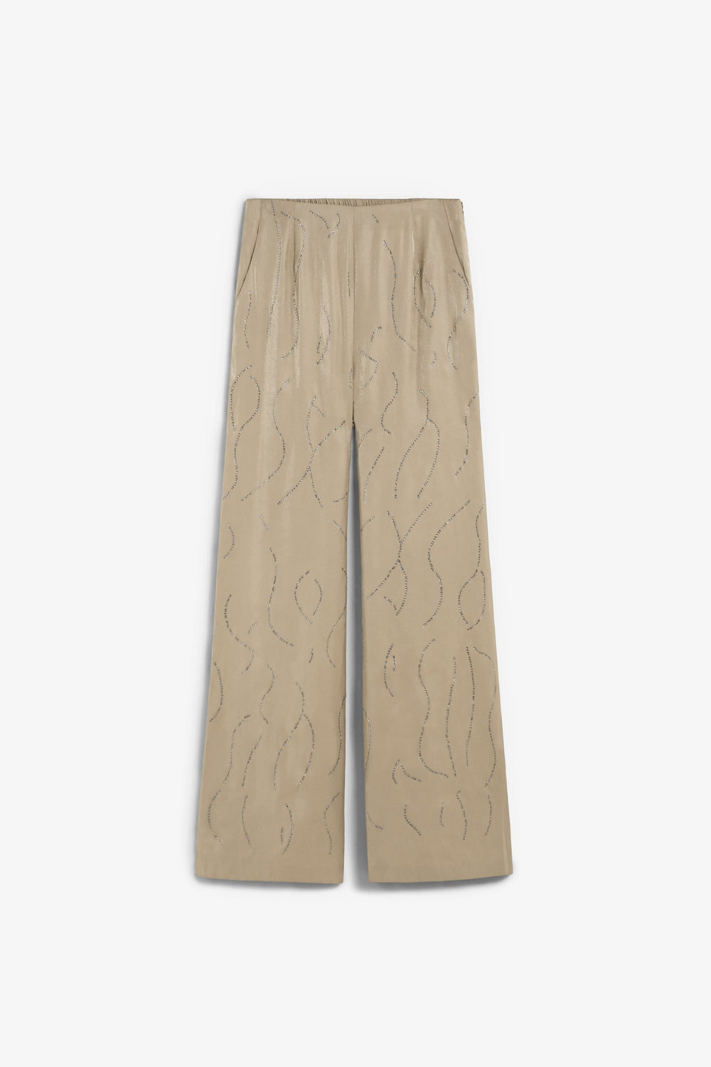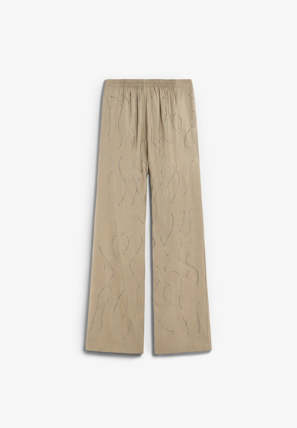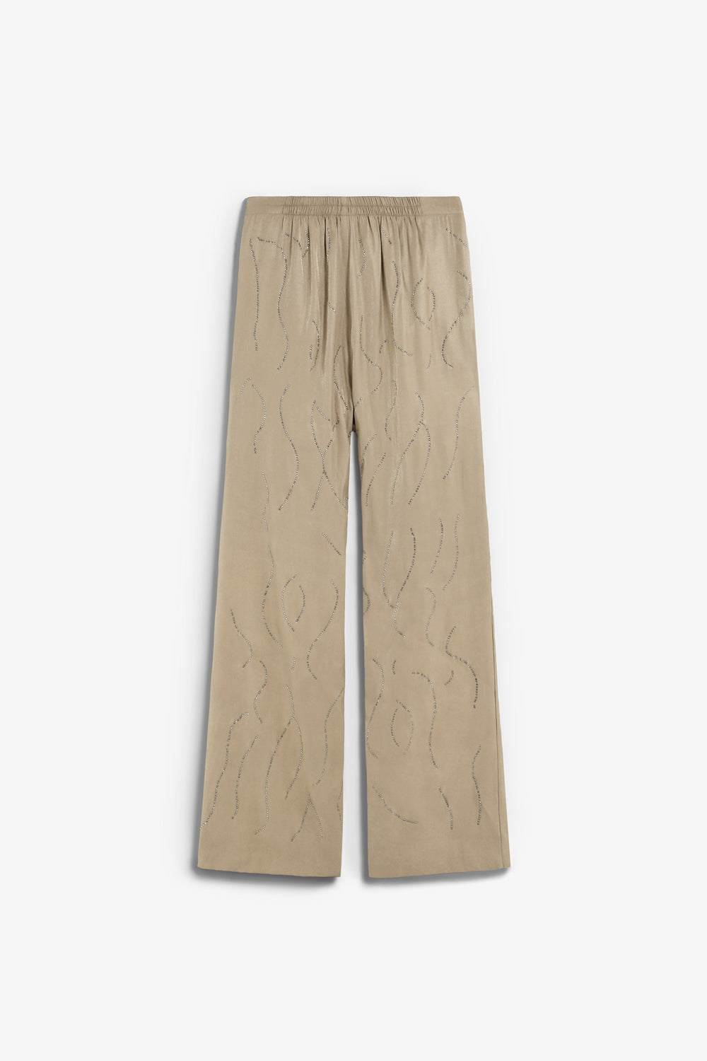 Pantalón con piedras de strass. Banda elástica para ajustarse a la cintura. Tejido fluido con acabado satinado. Bolsillos laterales.