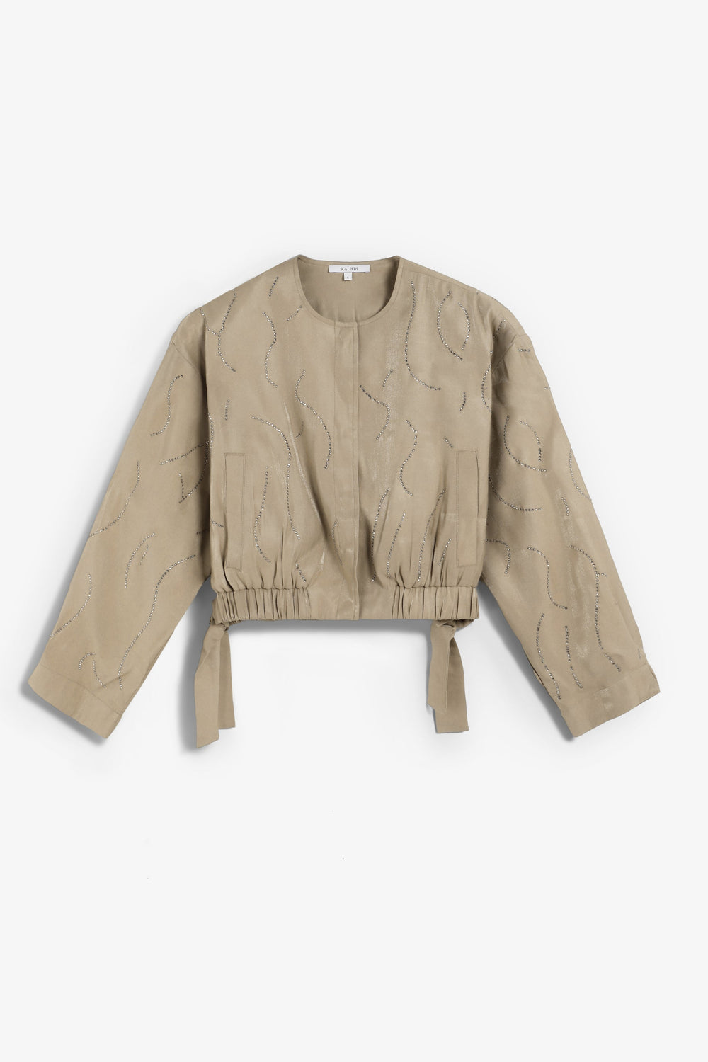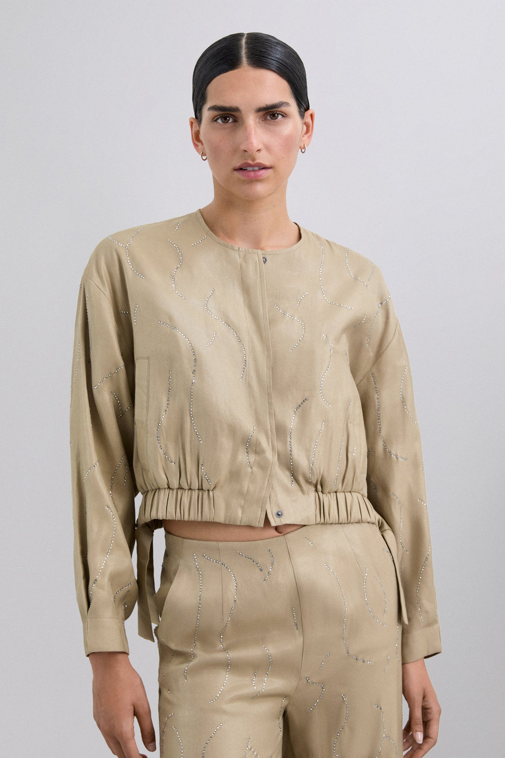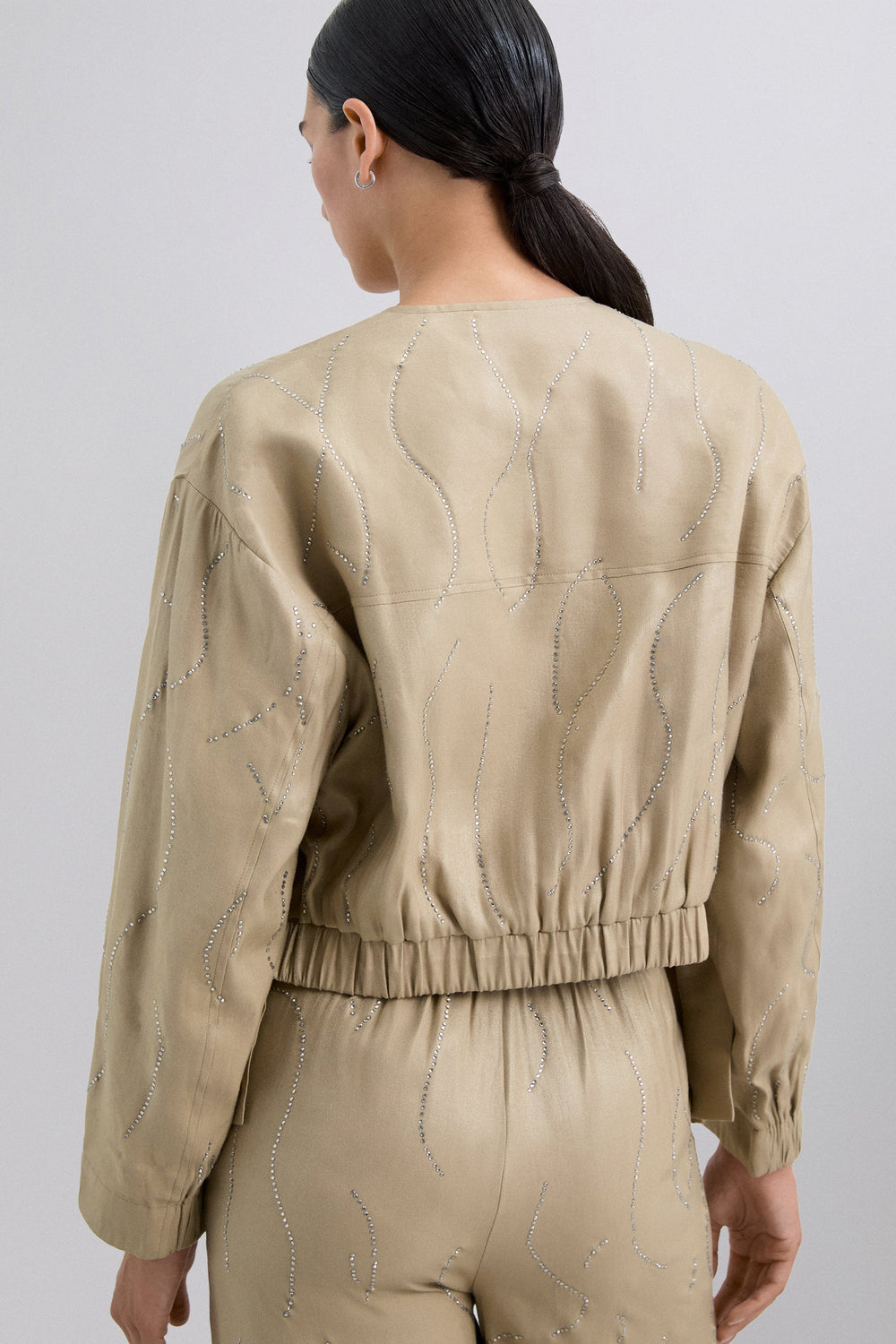 Chaqueta bomber con piedras de strass. Cierre frontal con cremallera y botones. Escote redondo. Puños y dobladillo fruncidos. Tejido fluido con acabado satinado. Banda elástica con detalle de lazo en los laterales.