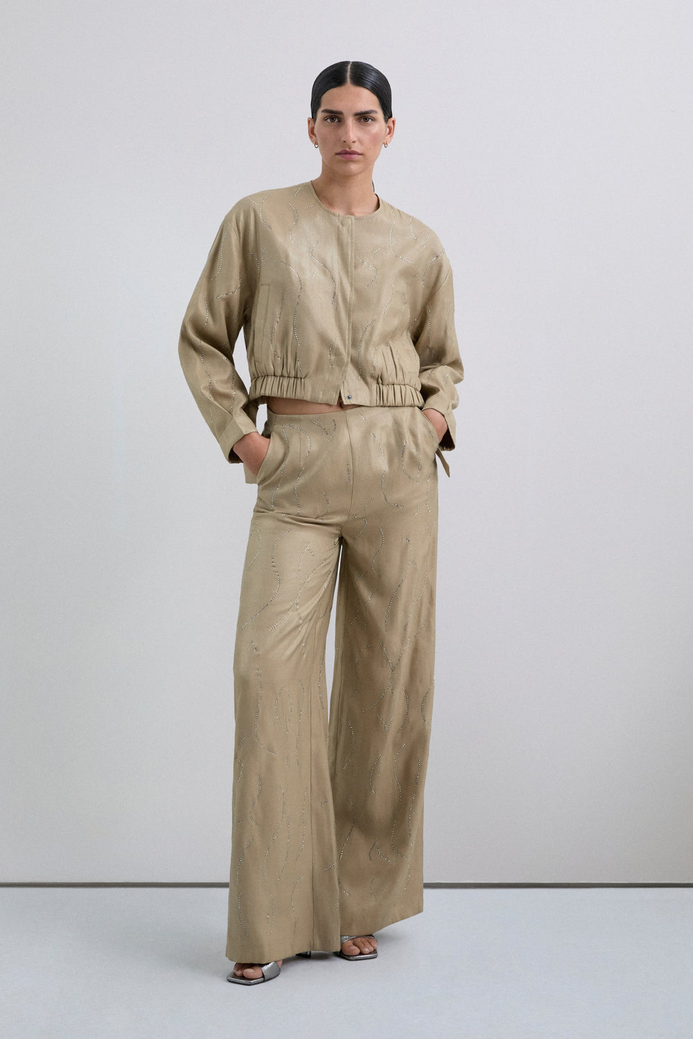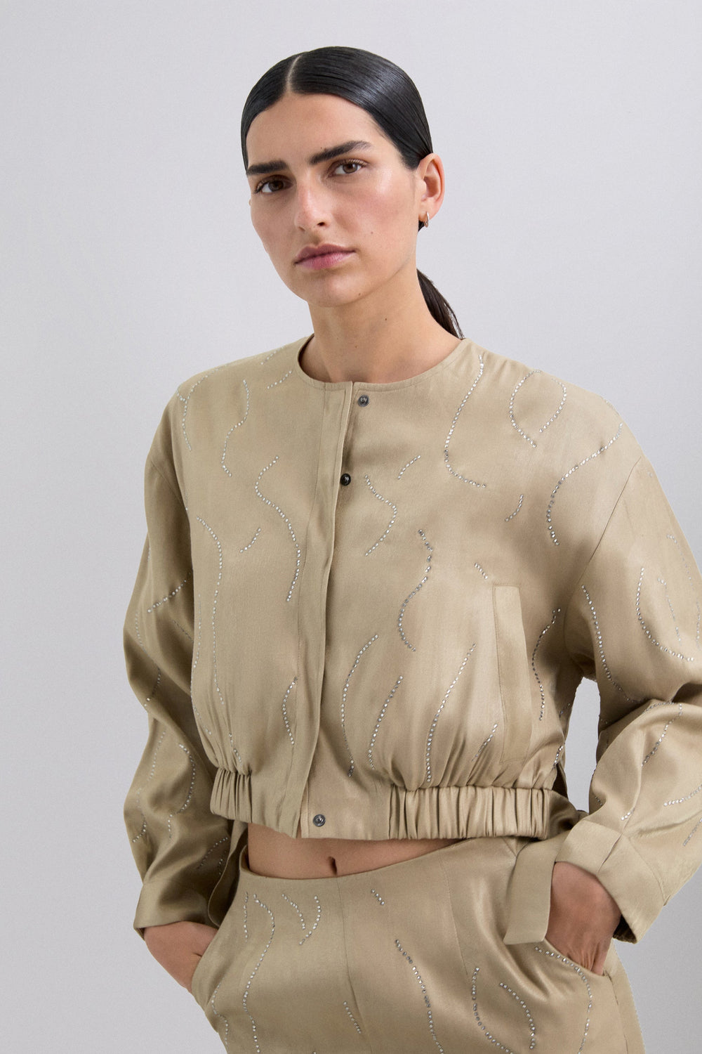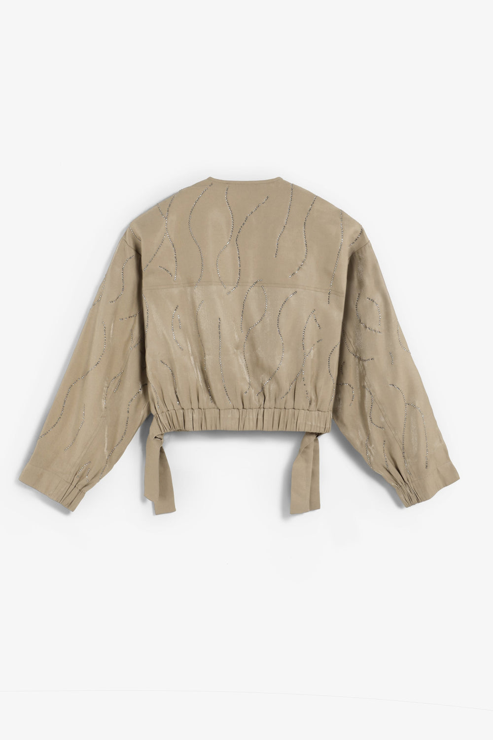Chaqueta bomber con piedras de strass. Cierre frontal con cremallera y botones. Escote redondo. Puños y dobladillo fruncidos. Tejido fluido con acabado satinado. Banda elástica con detalle de lazo en los laterales.