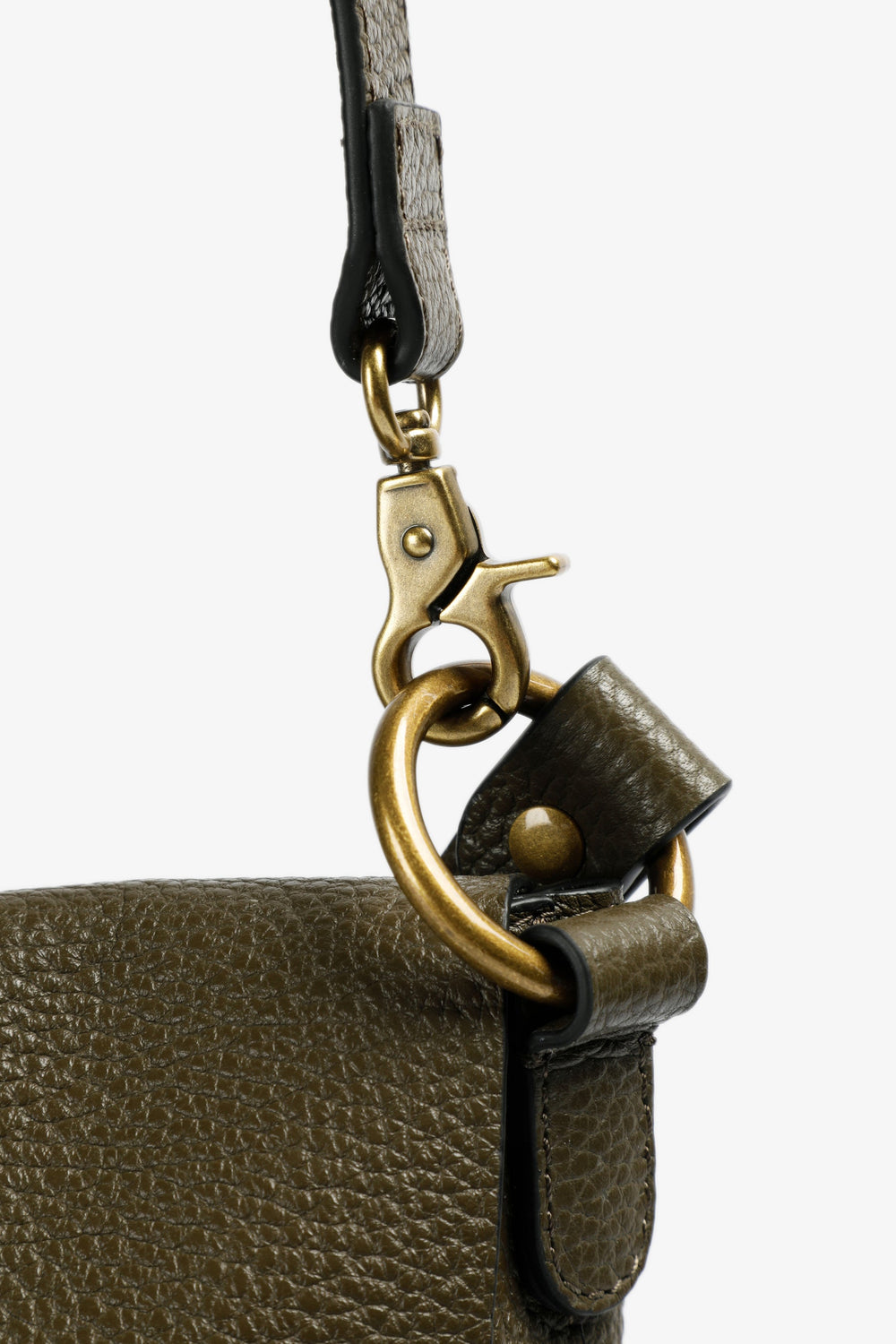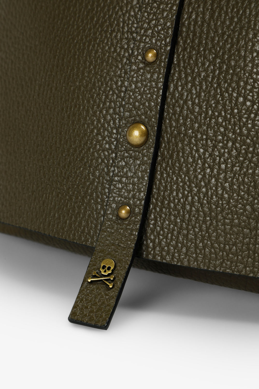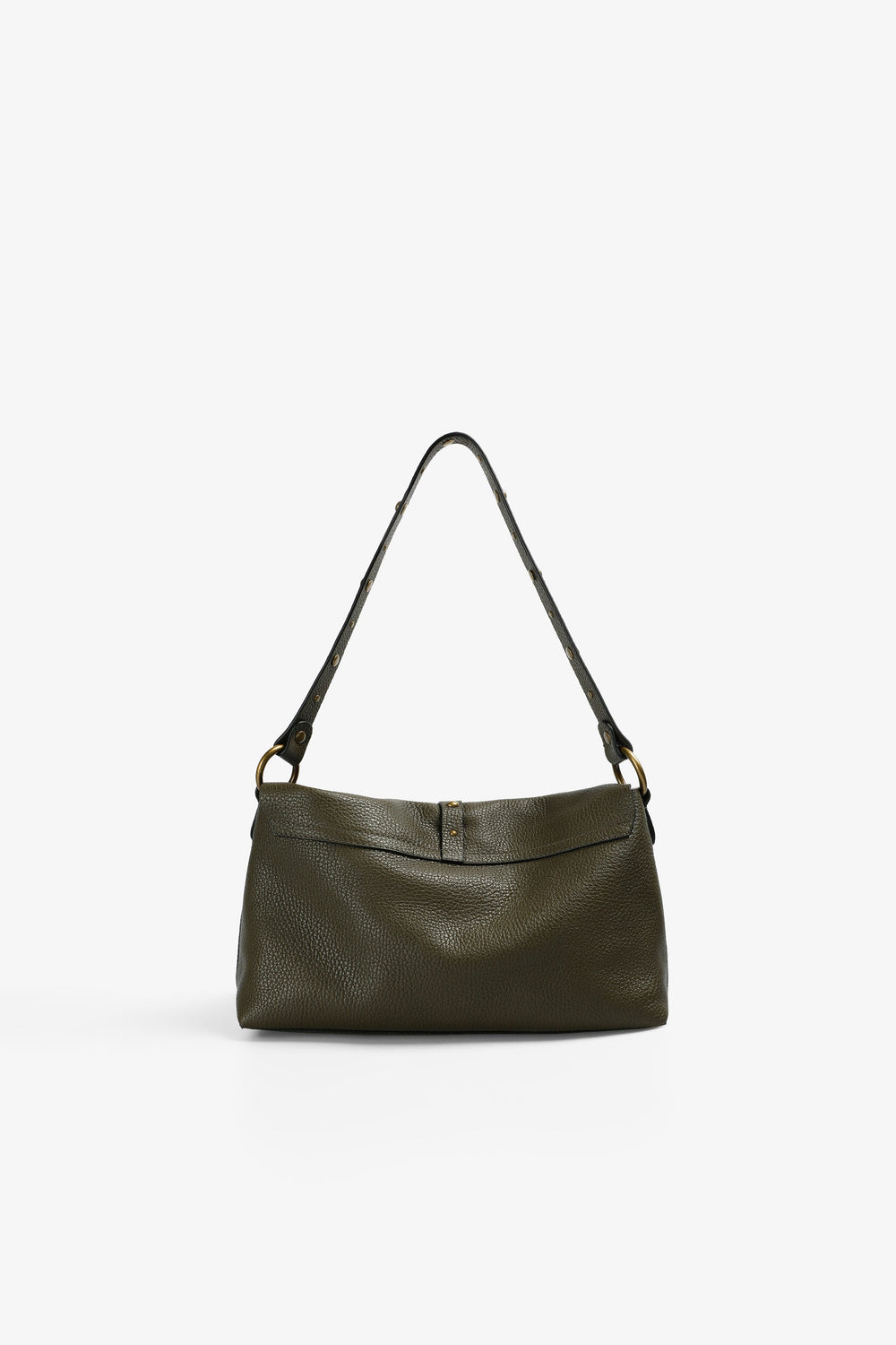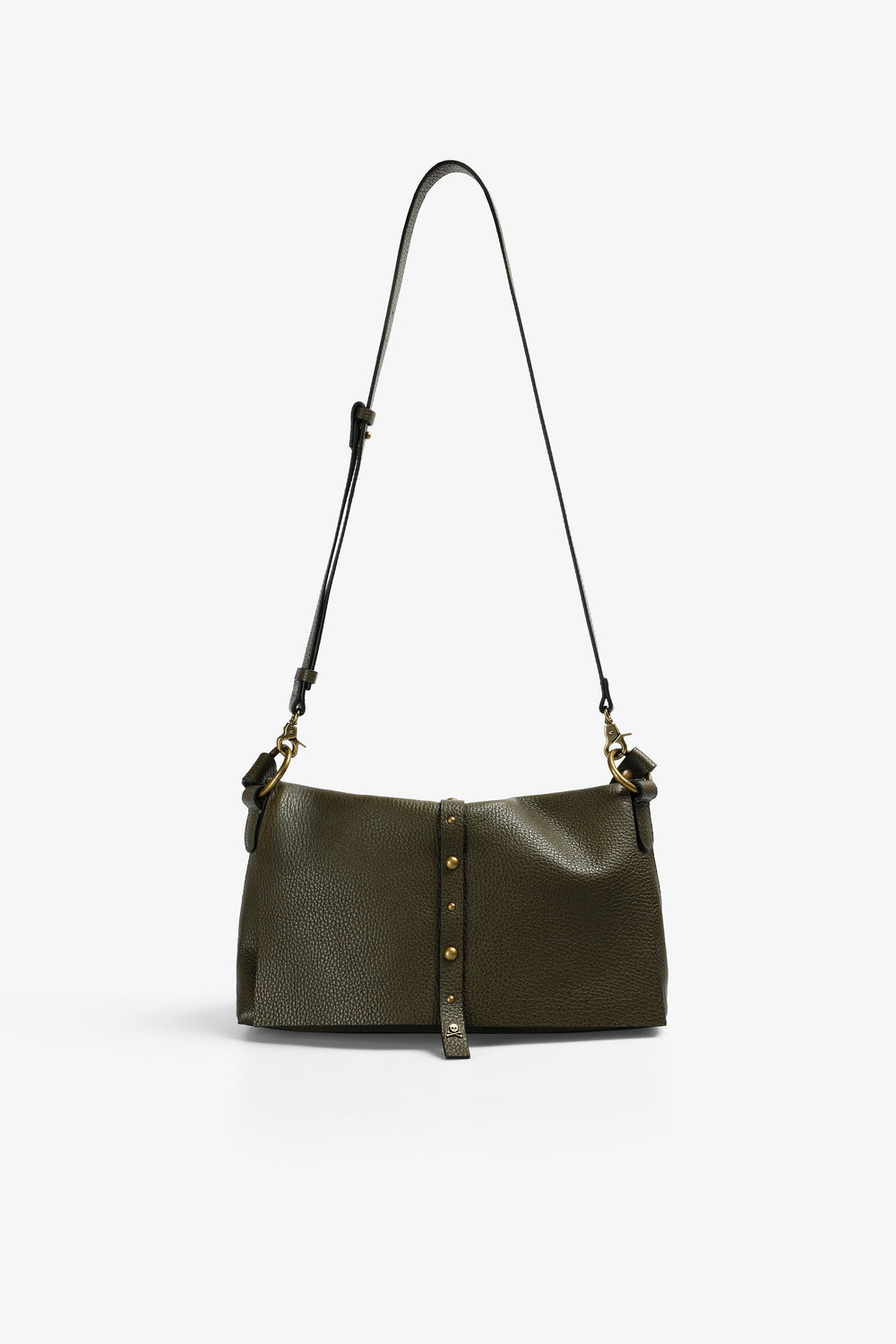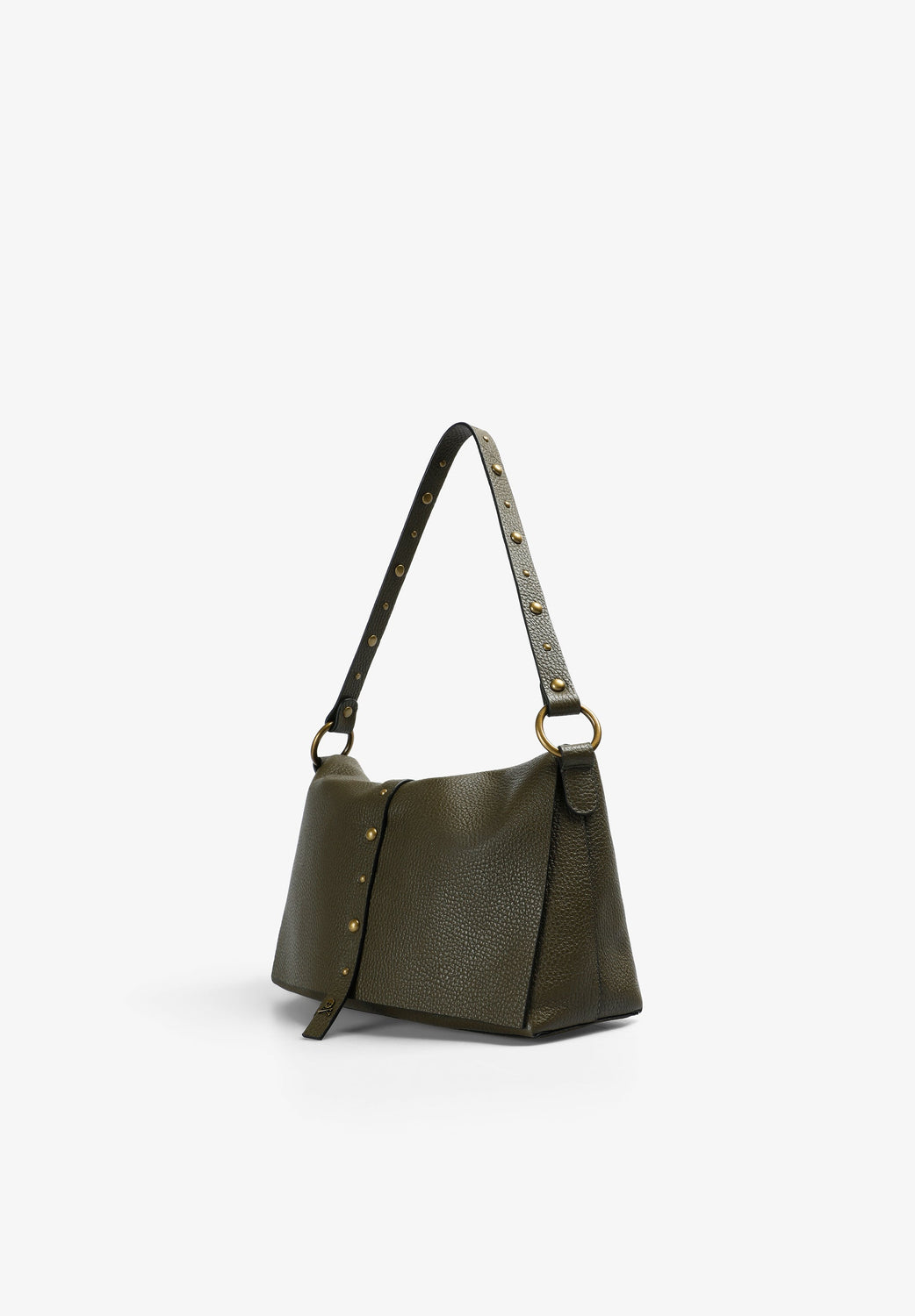 Bolso confeccionado en 100% piel con detalles de studs. Cierre con tapeta. Asa corta y asa larga.