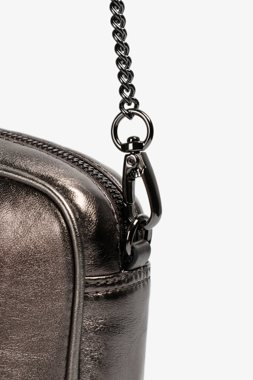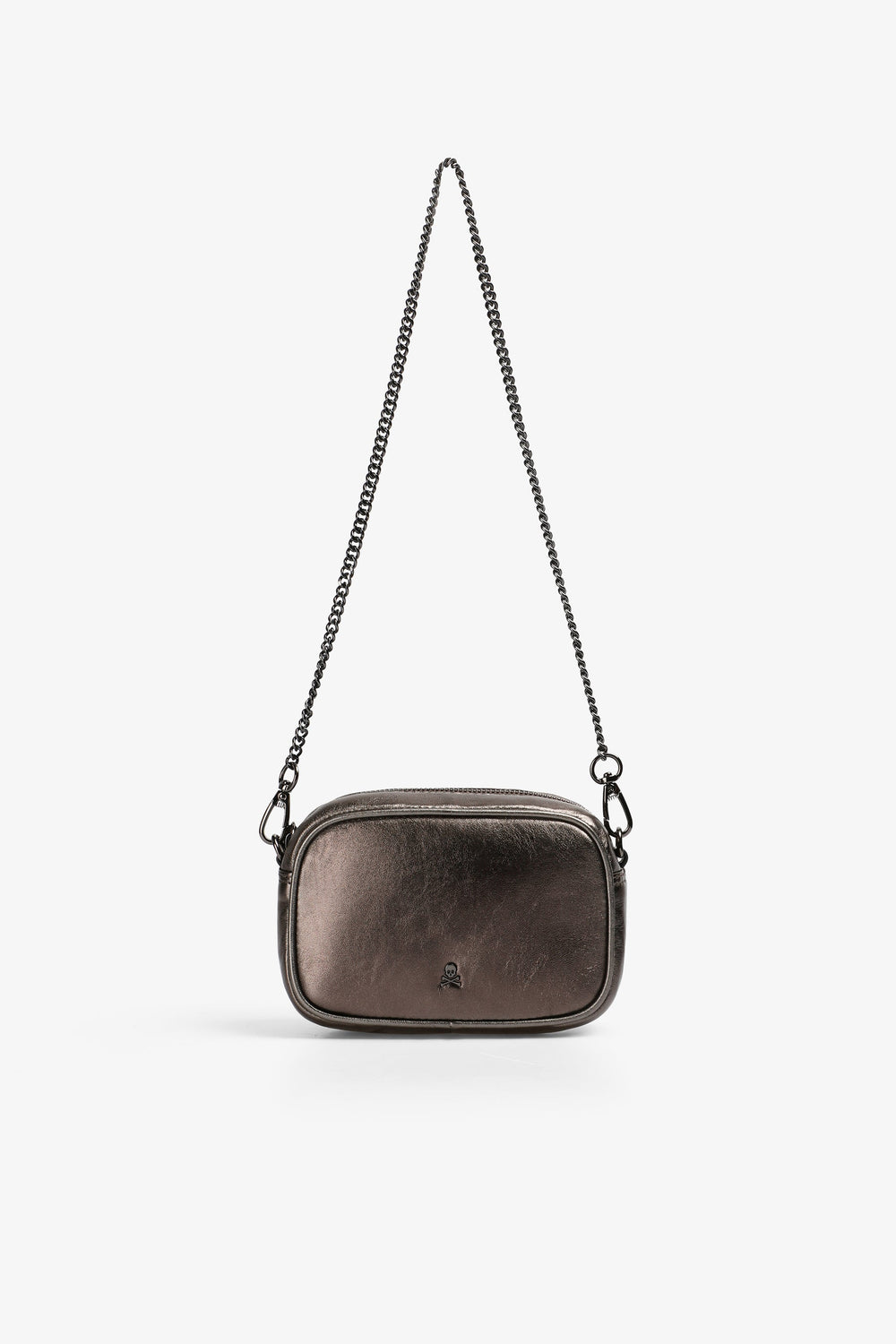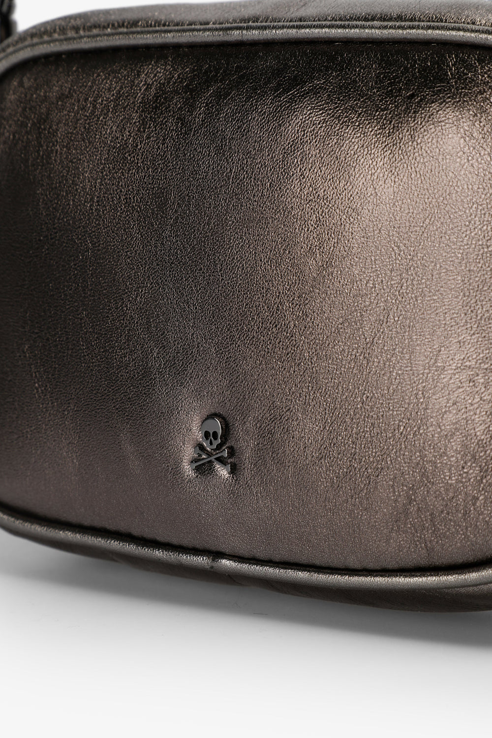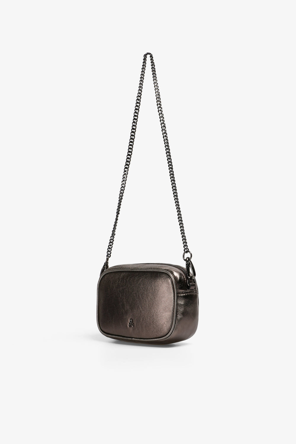 Bolso tamaño pequeño. Confeccionado en 100% piel. Cierre con cremallera. Asa larga. Detalles de calavera en la parte frontal