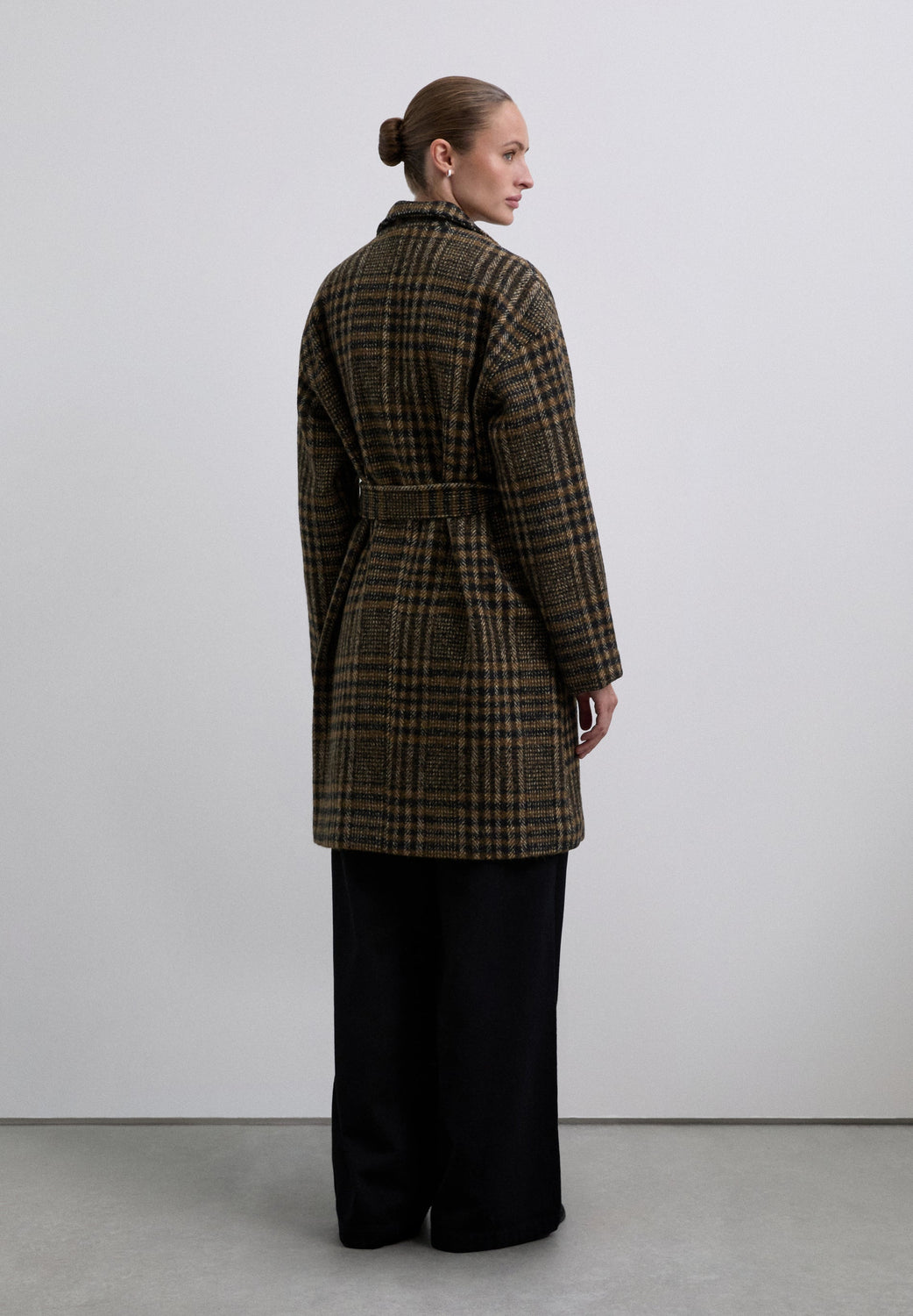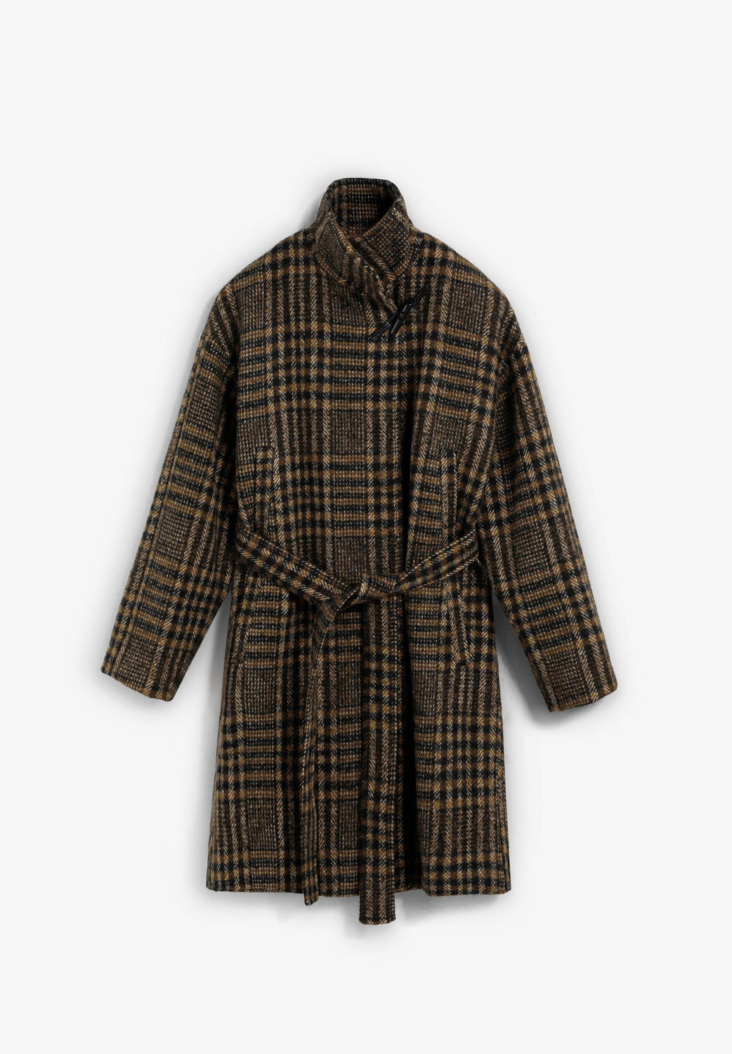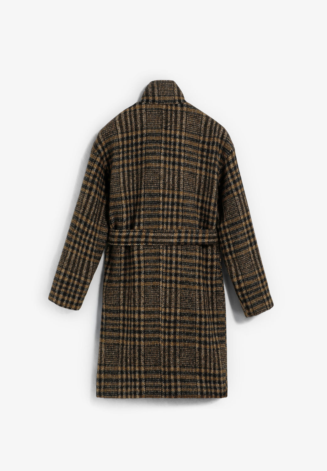 Abrigo corto confeccionado en lana. Cuello recto levantado. Botón tipo pasador en la parte superior. Cierre interior con 2 botones y cierre exterior con cinturón ajustable. Manga larga con puño doblado.