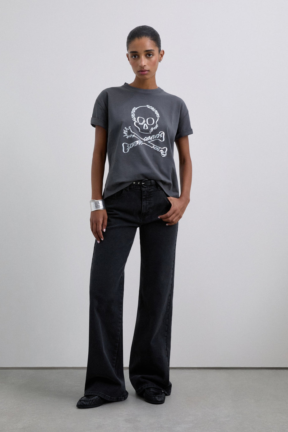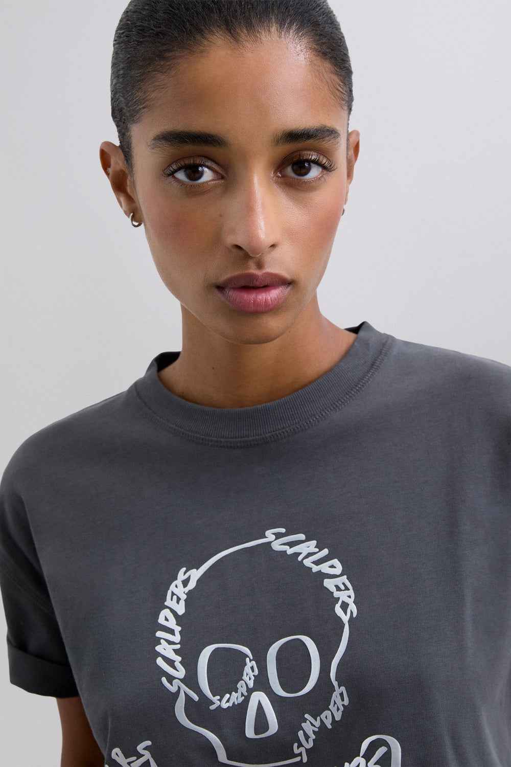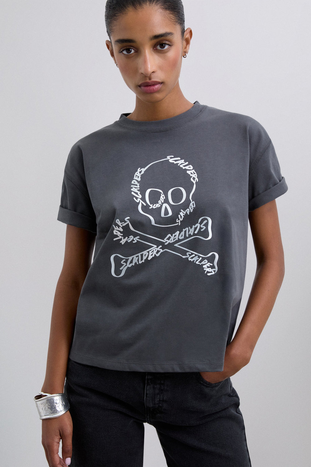Camiseta confeccionada en 100% algodón. Regular fit. Print frontal con calavera. Cuello redondo. Manga corta. Detalle de costuras en espalda.