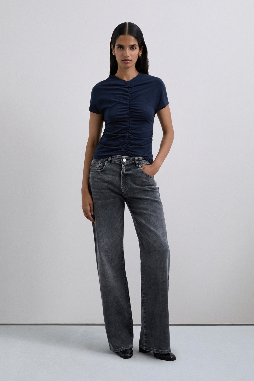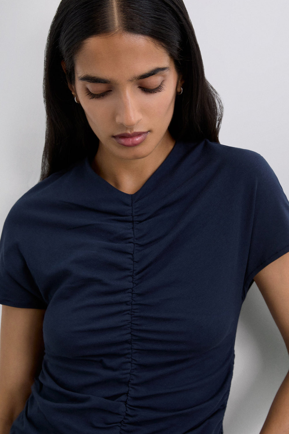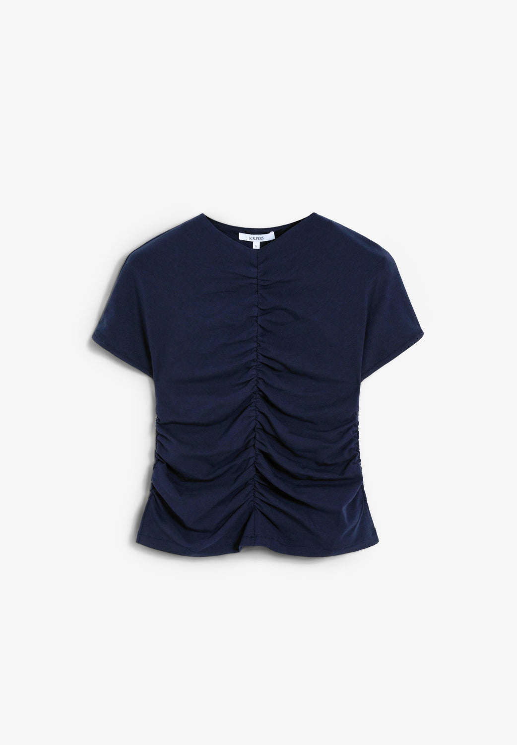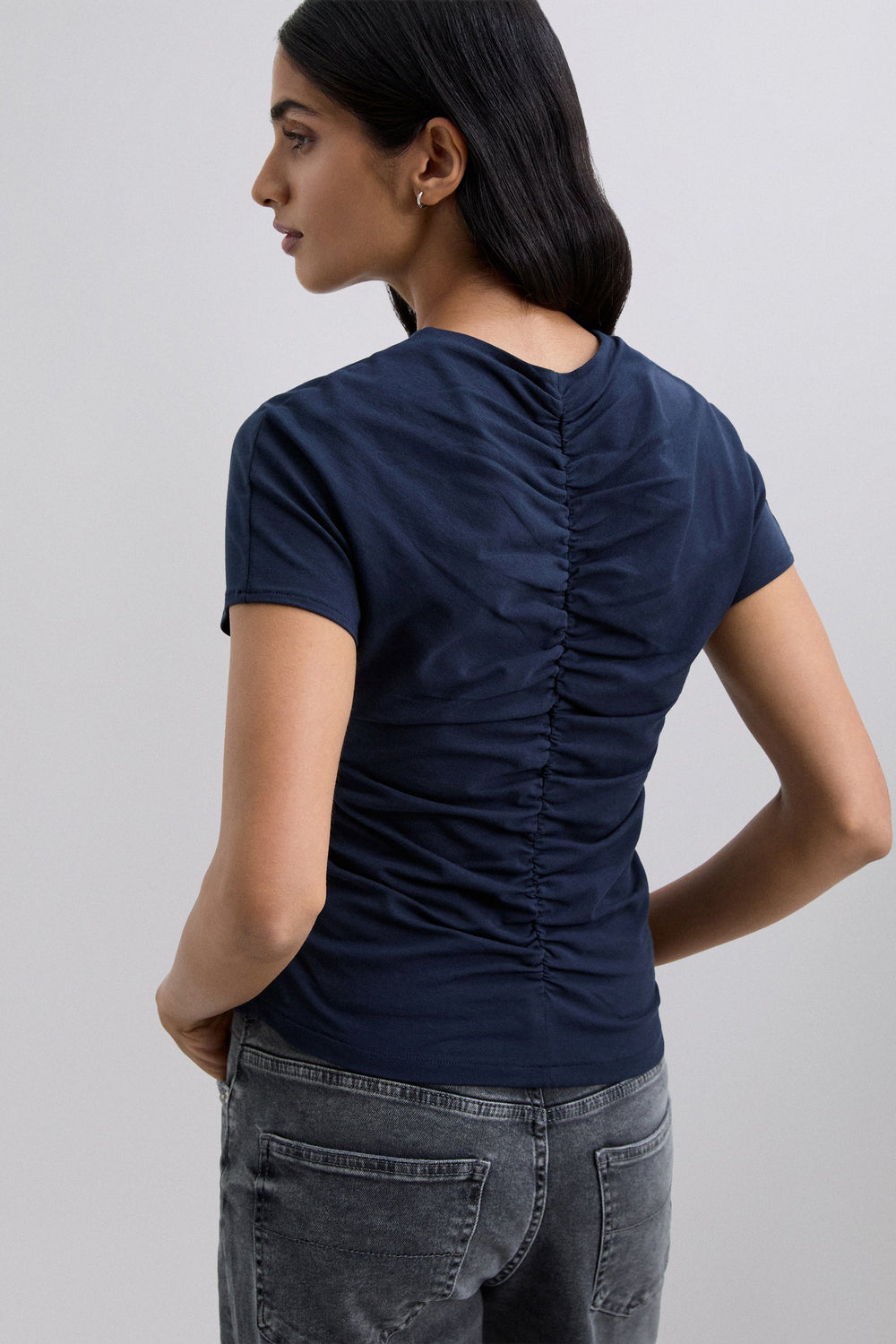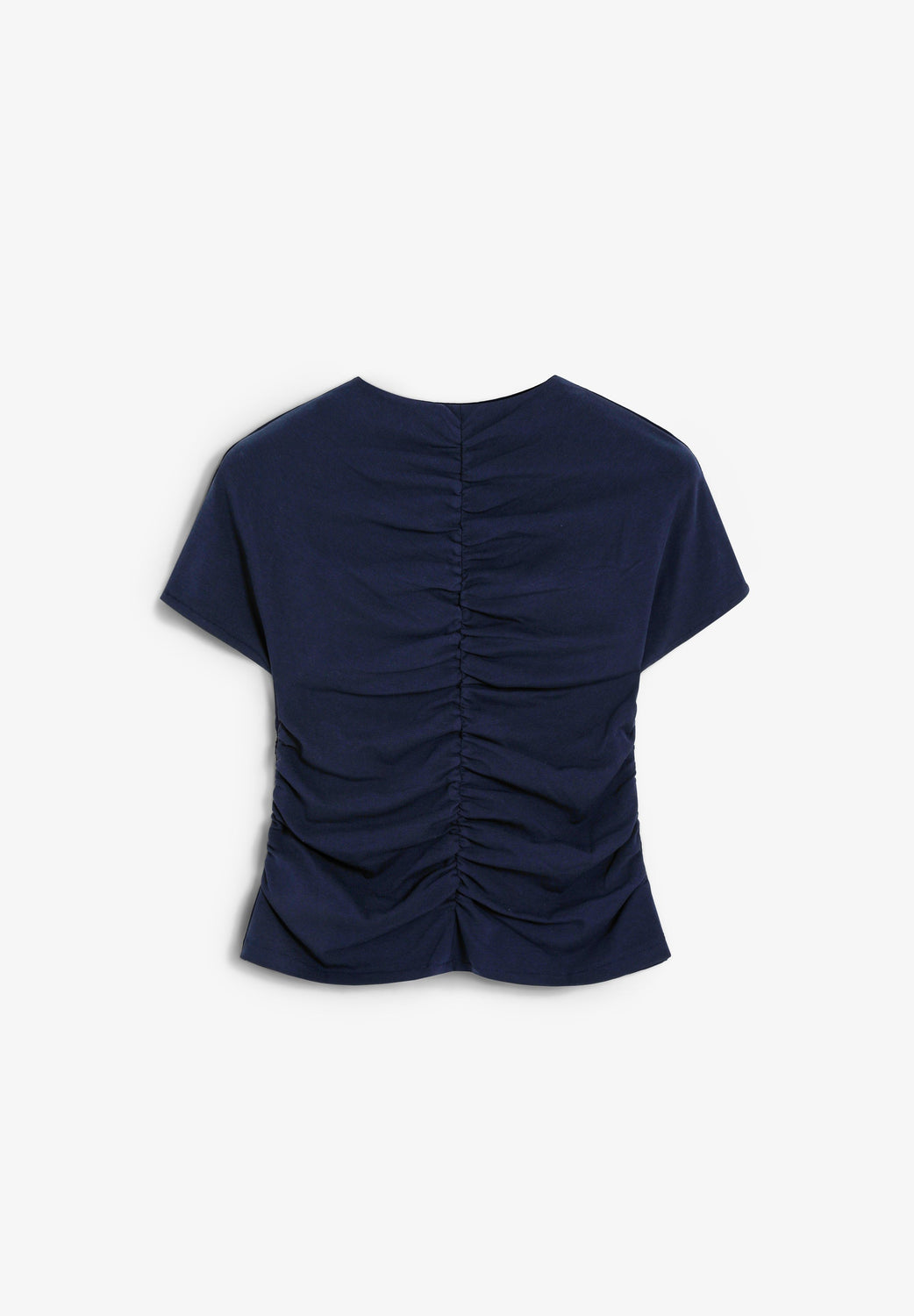 Camiseta confeccionada en algodón ligeramente elástico. Manga corta con frunce delantero y parte trasera. Corte slim fit. Cuello ligeramente en V.