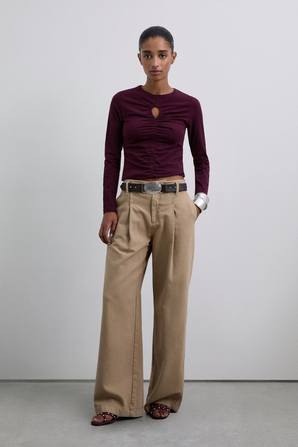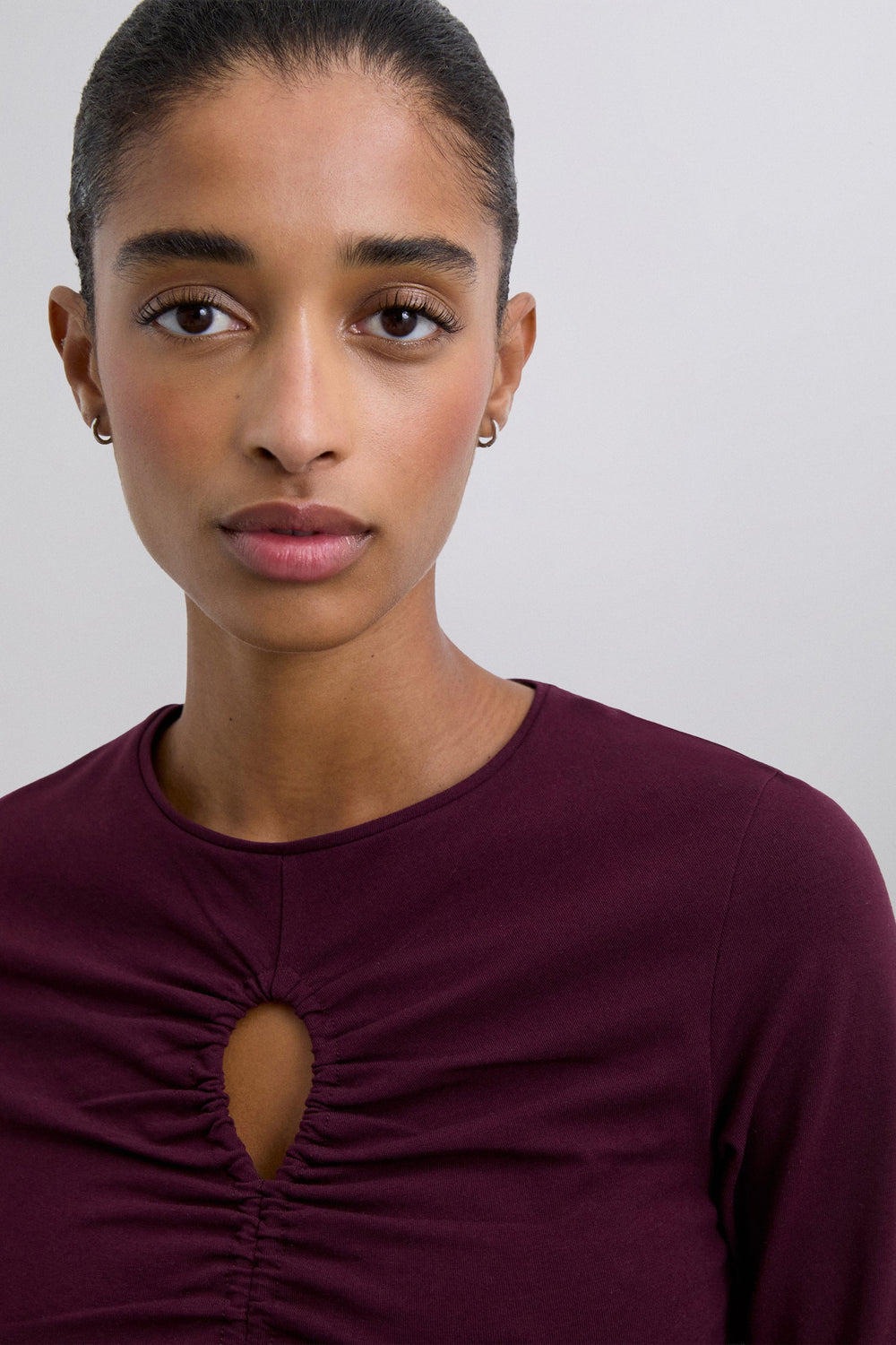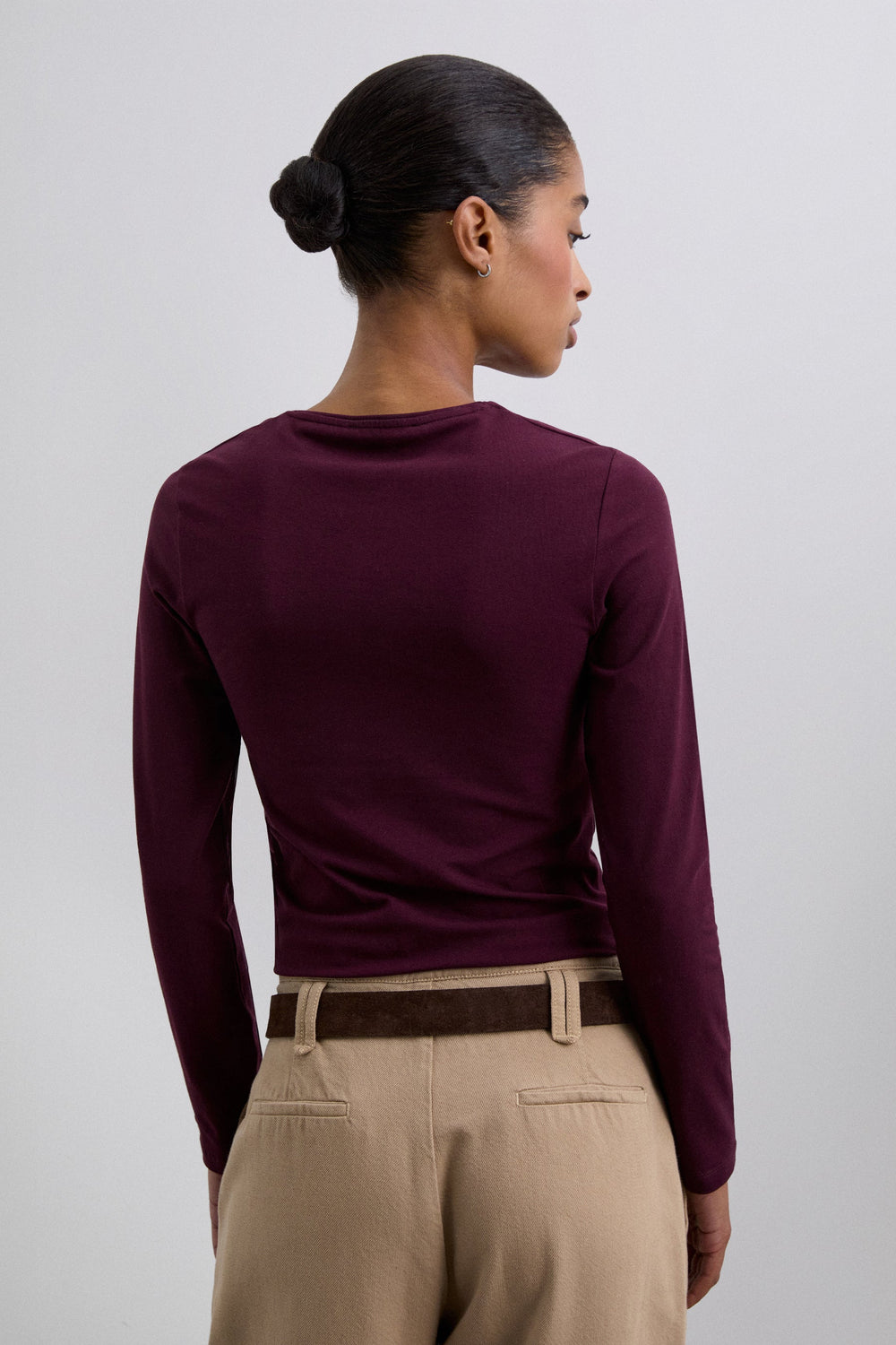 Camiseta confeccionada en algodón ligeramente elástico. Corte slim ft, cuello redondo y manga larga. Detalle de abertura en escote y frunces frontales.