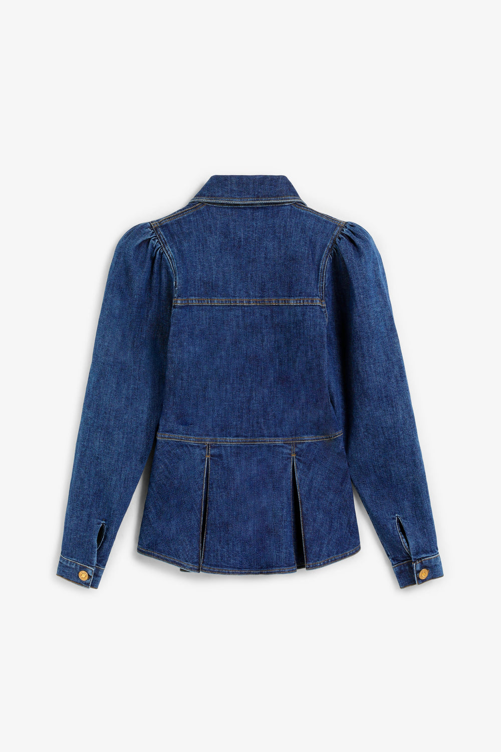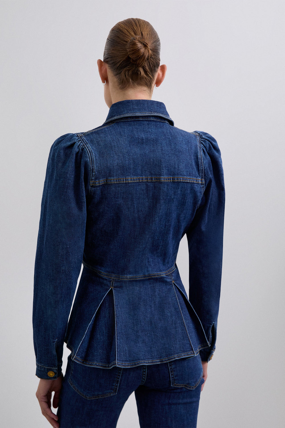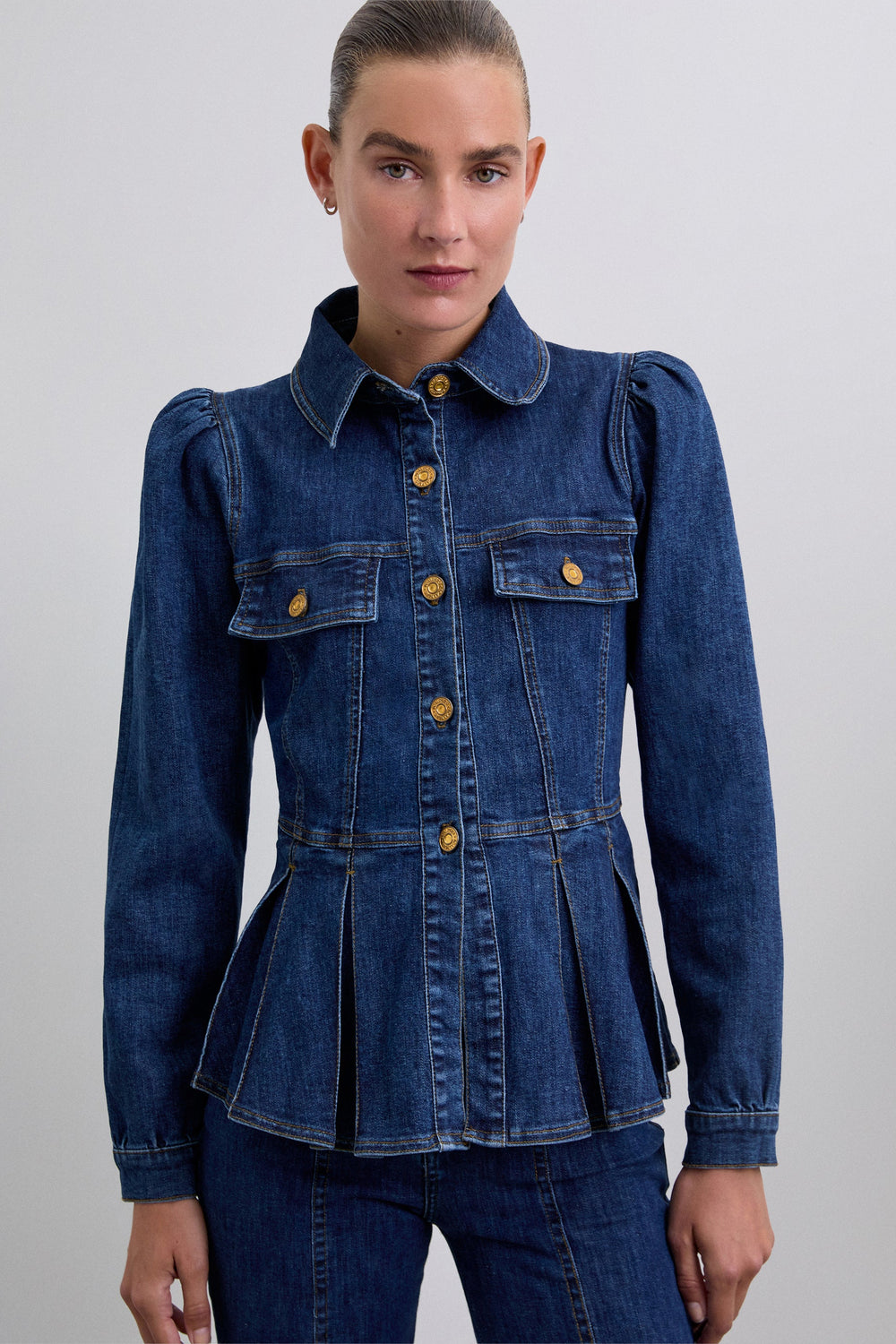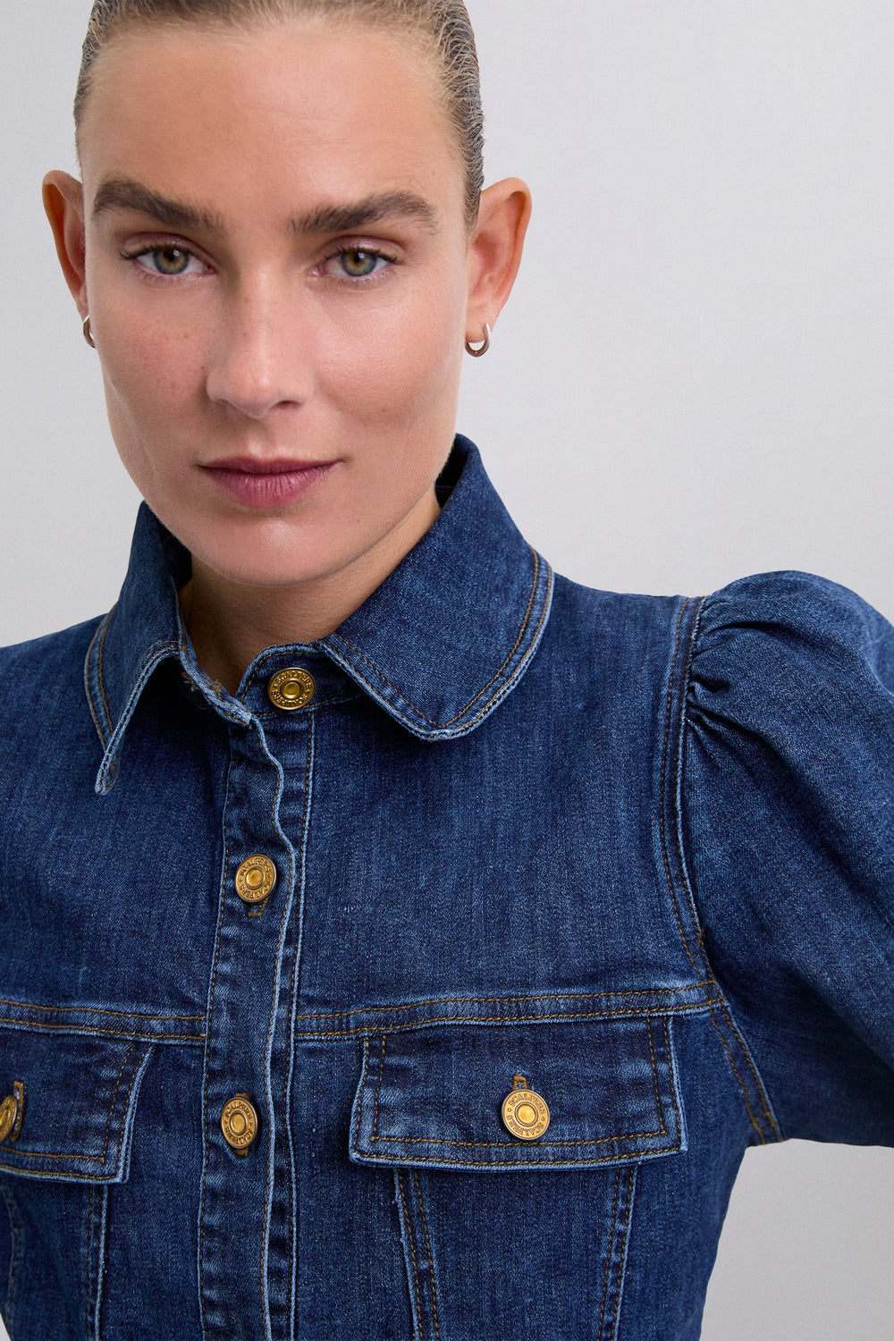 Camisa denim confeccionada en algodón ligeramente elástico. Slim fit, cierre con botones y manga larga abullonada terminada en botones. Detalle de tablas en el bajo y frunces en hombros.