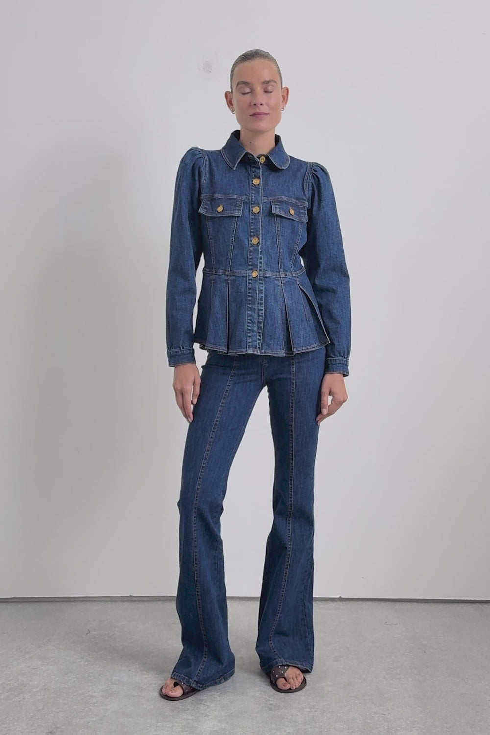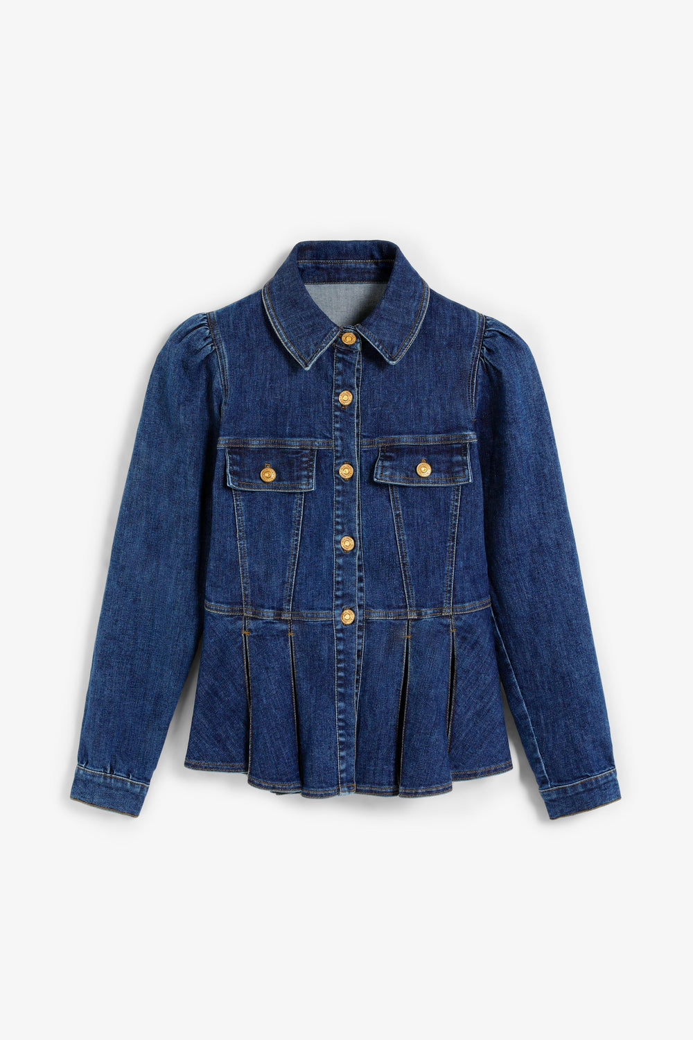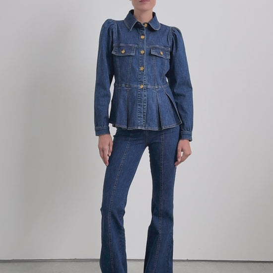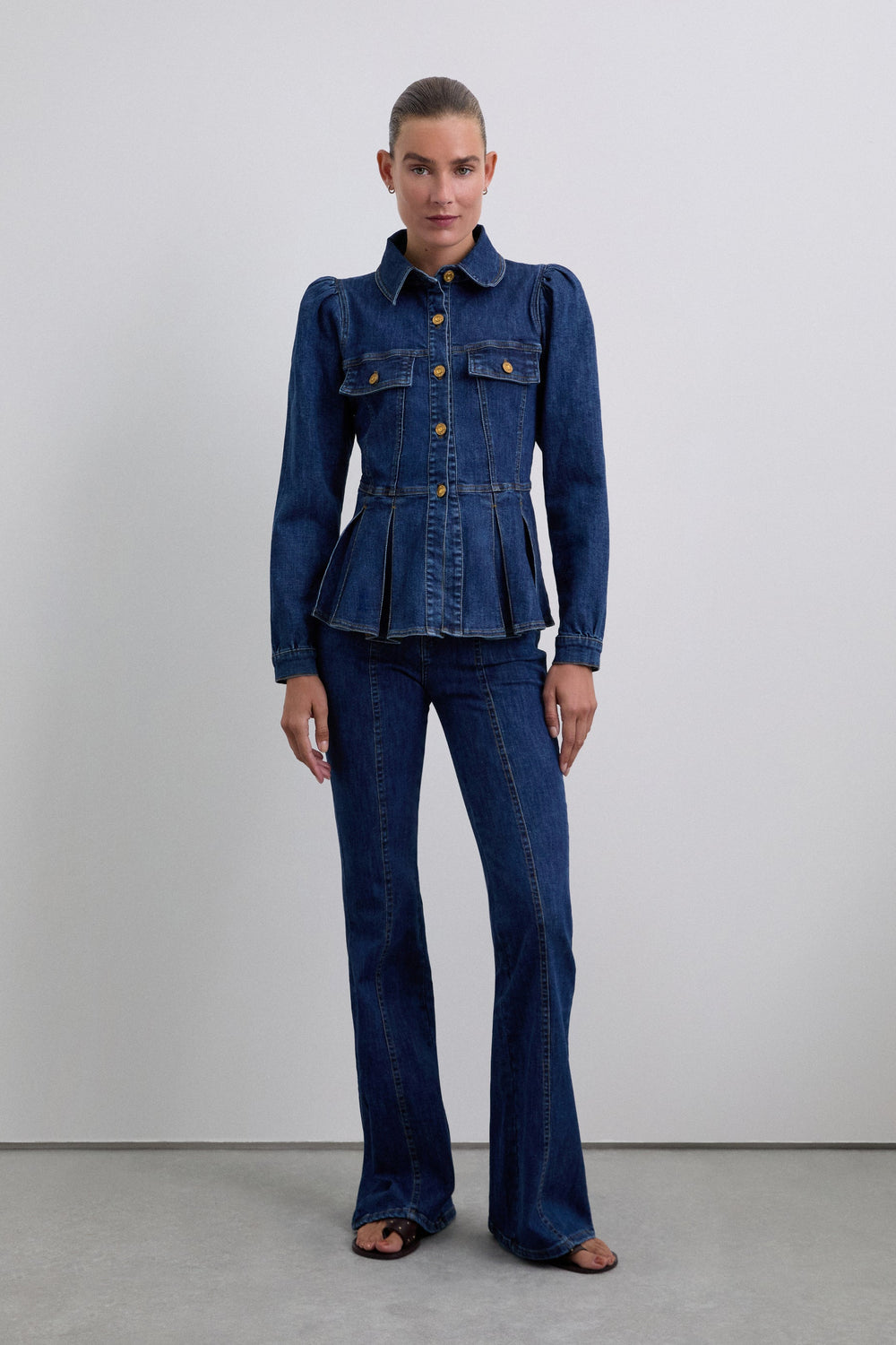 Camisa denim confeccionada en algodón ligeramente elástico. Slim fit, cierre con botones y manga larga abullonada terminada en botones. Detalle de tablas en el bajo y frunces en hombros.