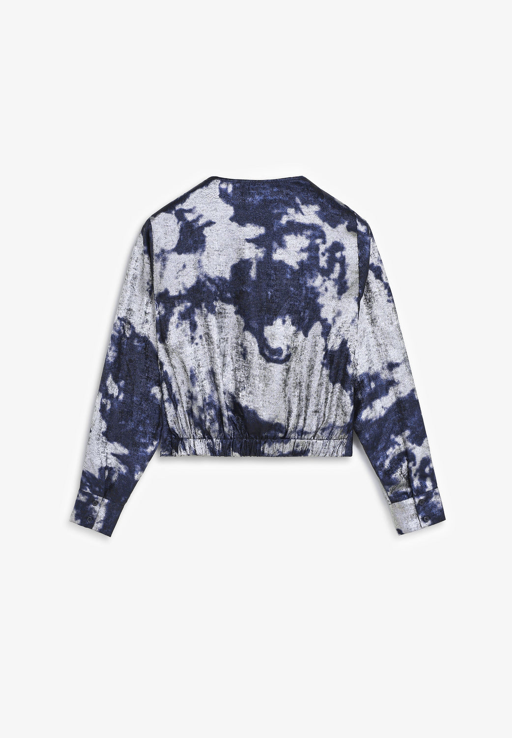 Blusa confeccionada en tejido fluido con estampado tie-dye con detalles metalizados. Corte slim fit. Escote en V. Manga larga. Ligeramente cropped.