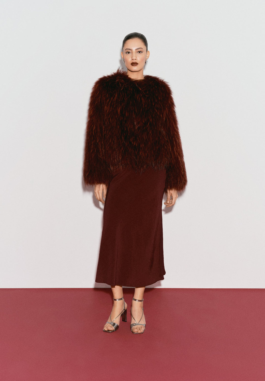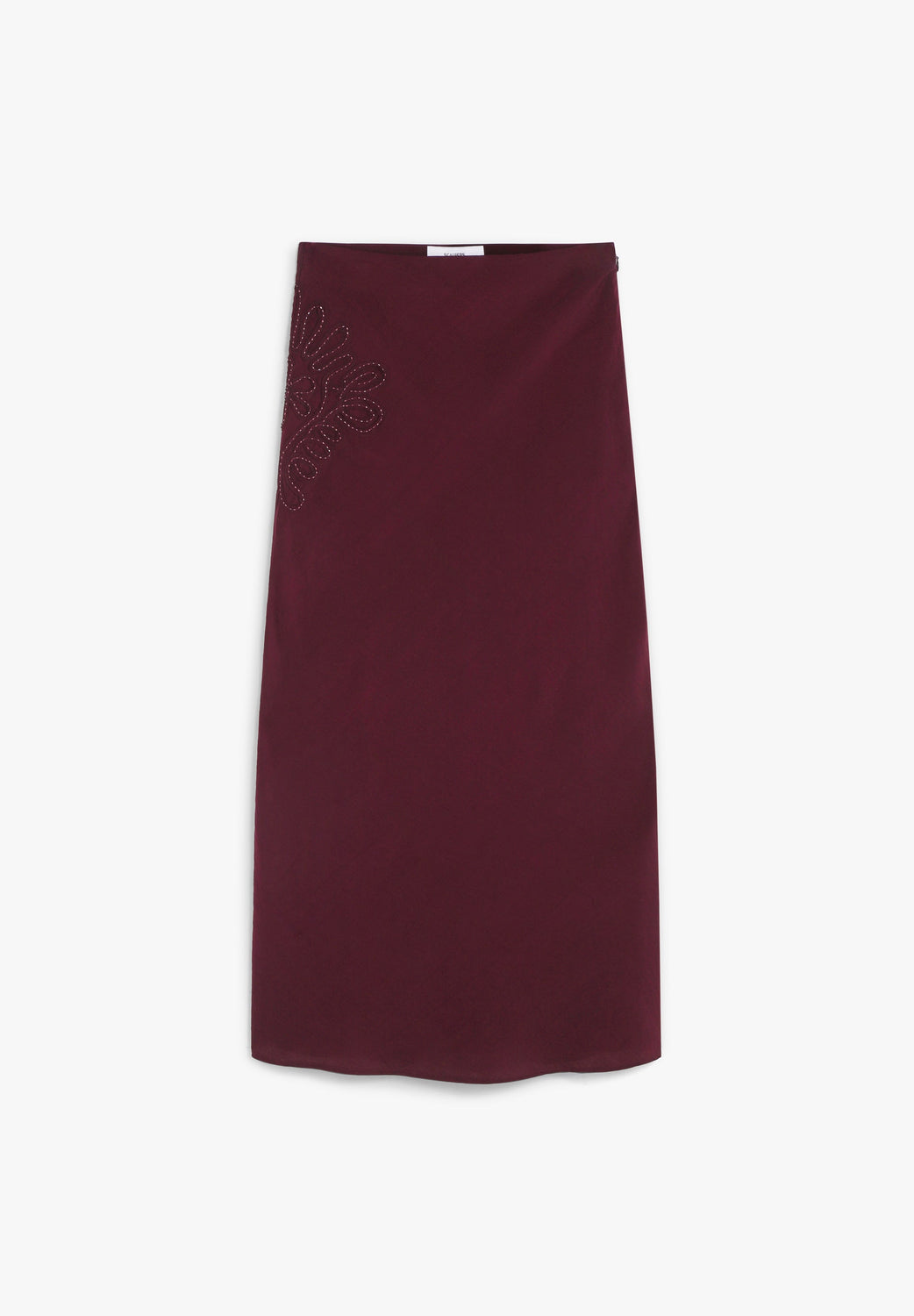 Falda al bies. Tiro medio. Tejido fluido. El cierre es una cremallera invisible.