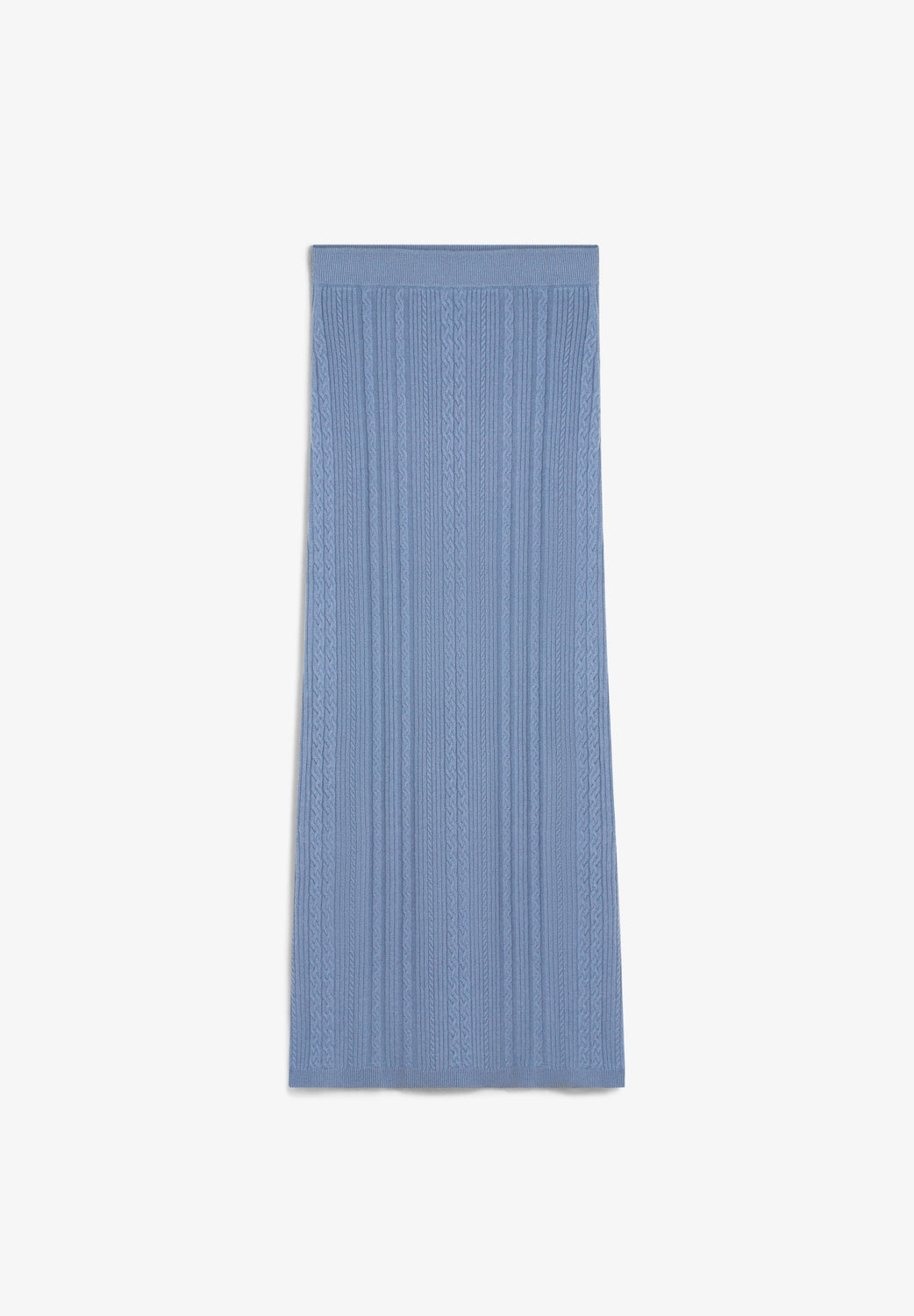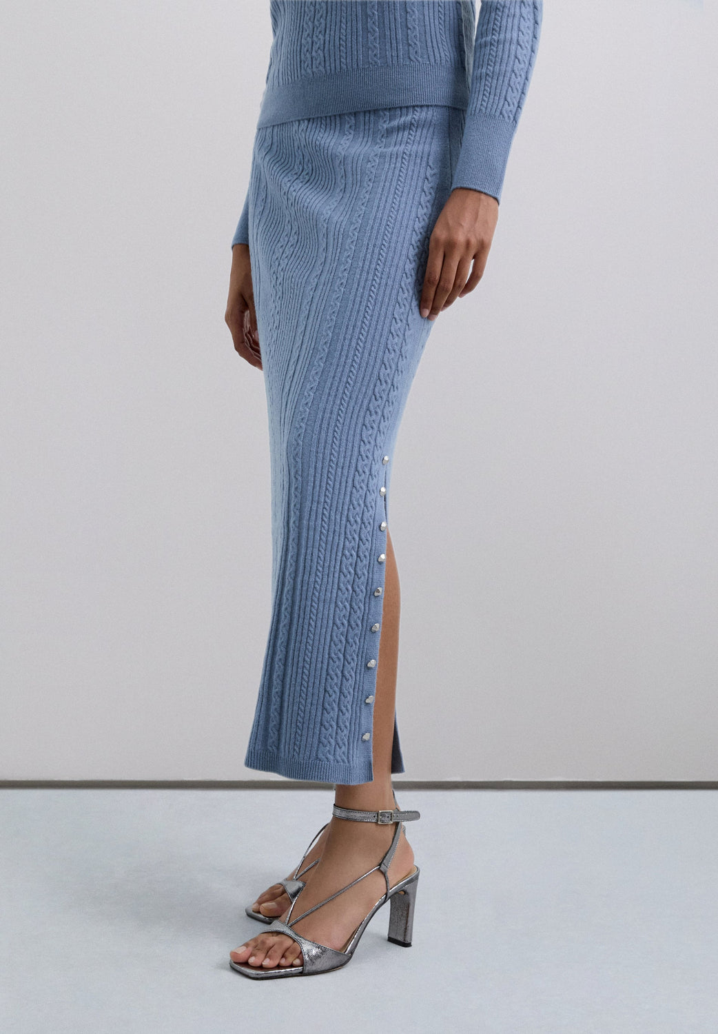 Falda midi confeccionada en mezcla de lana. Cintura elástica. Abertura en parte lateral. Detalle de botones.
