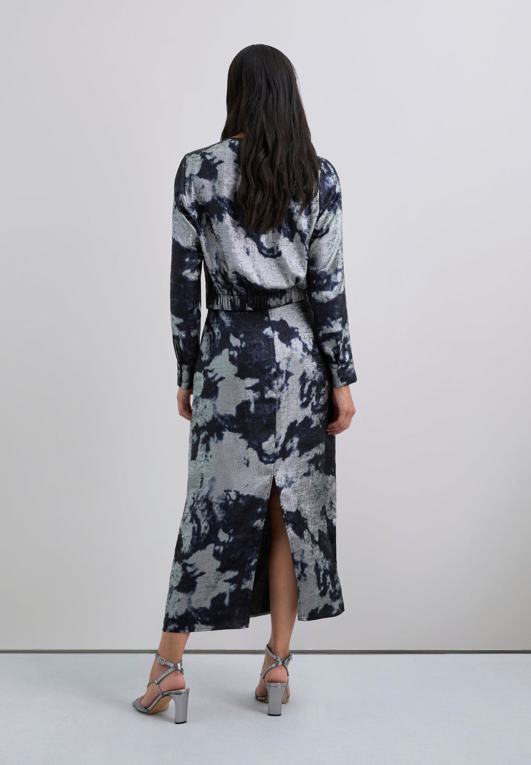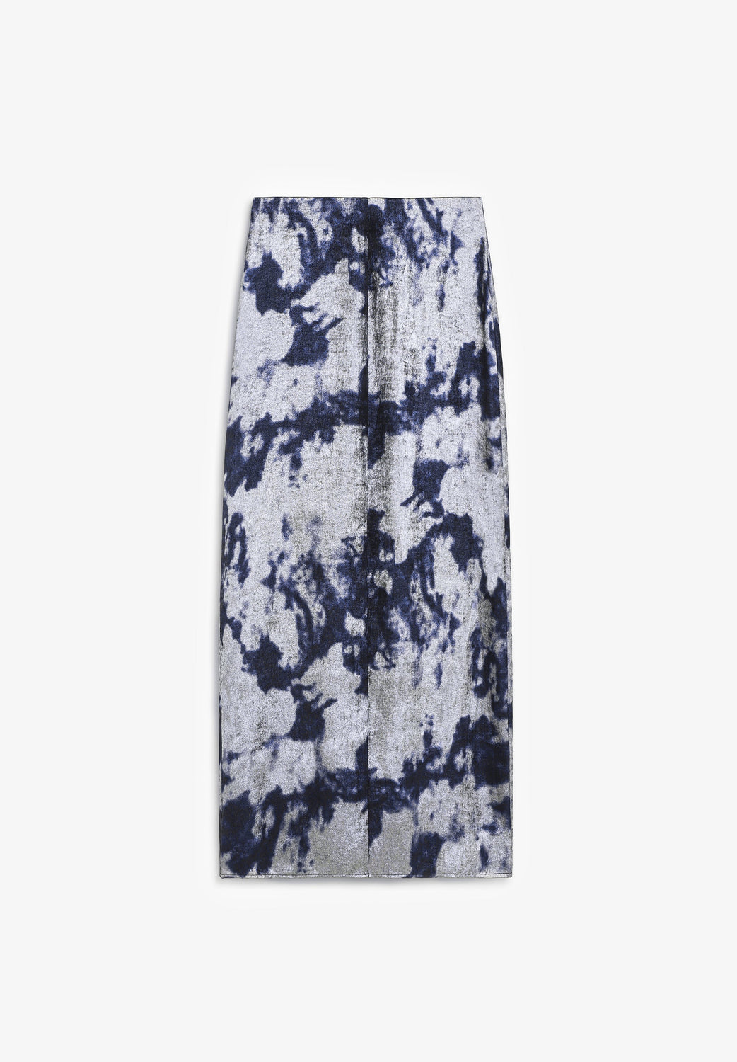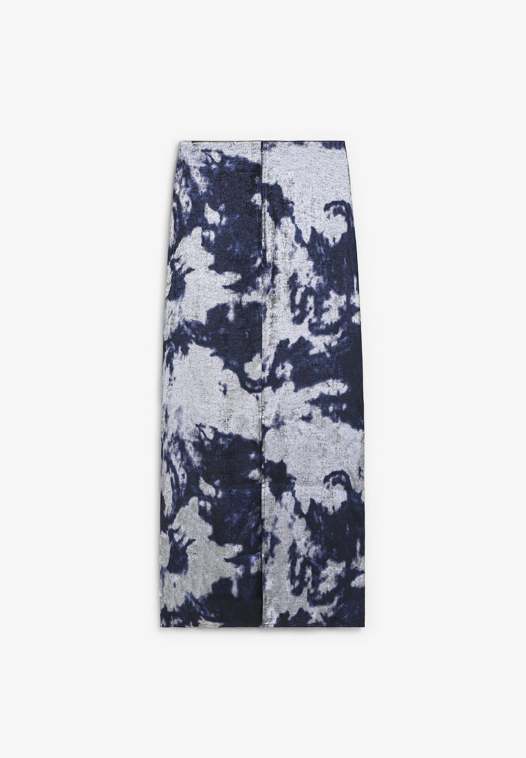 Falda confeccionada en tejido fluido con estampado tie-dye con detalles metalizados. Corte slim fit. Midi. Abertura trasera. Cierre con cremallera lateral oculta.