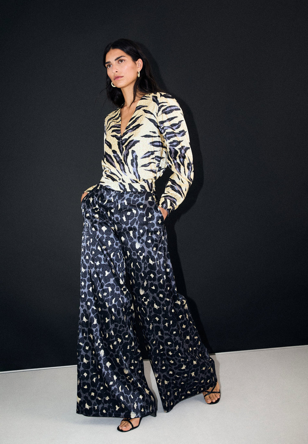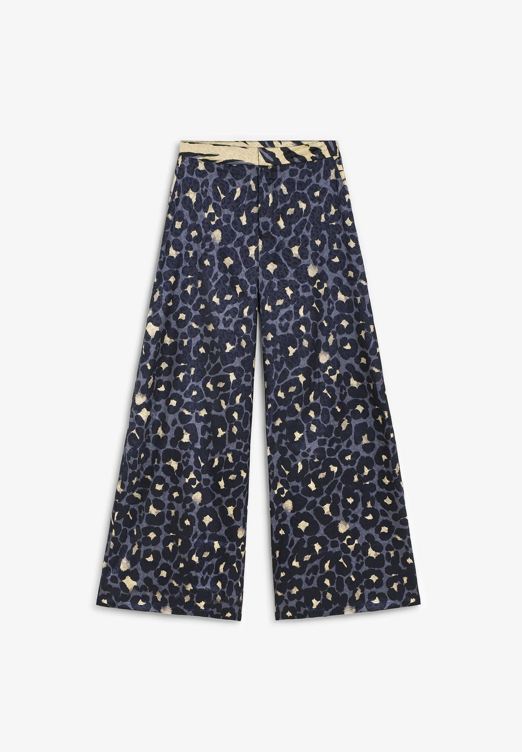 Pantalón fluido. Cierre de cremallera oculto por una tapeta con corchete y botón. Cintura elástica. Dos bolsillos laterales. Estampado animal print. Tejido fluido con acabado satinado.