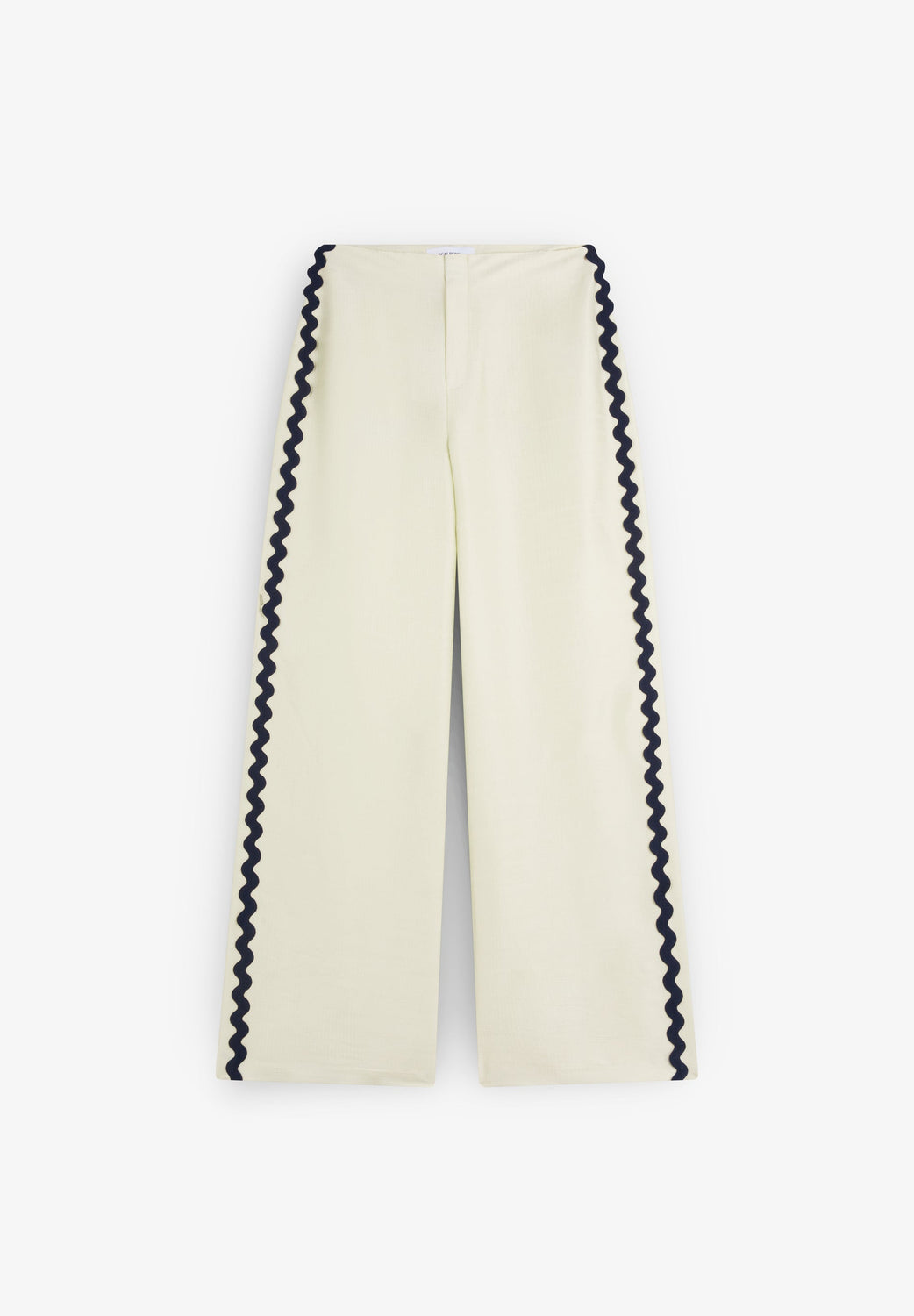 Pantalón full length de tiro alto ligeramente satinado. Motivo de ondas a contraste. Bolsillos traseros de parche. Cierre en frontal mediante corchete y cremallera.