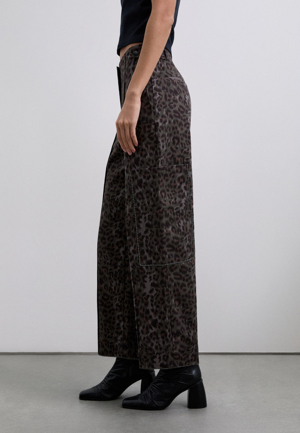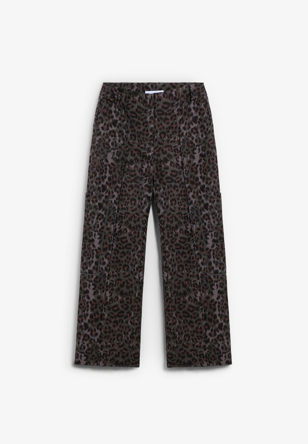 Pantalón estampado de animal print. Cierre con cremallera delantera. Bolsillos laterales estilo cargo. Detalles en las costuras principales. Botones ajustables en cadera.