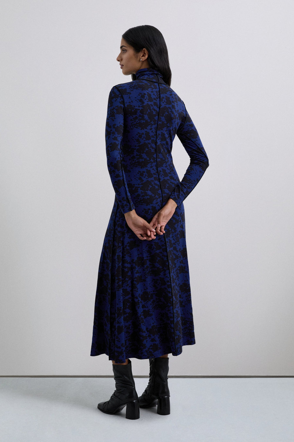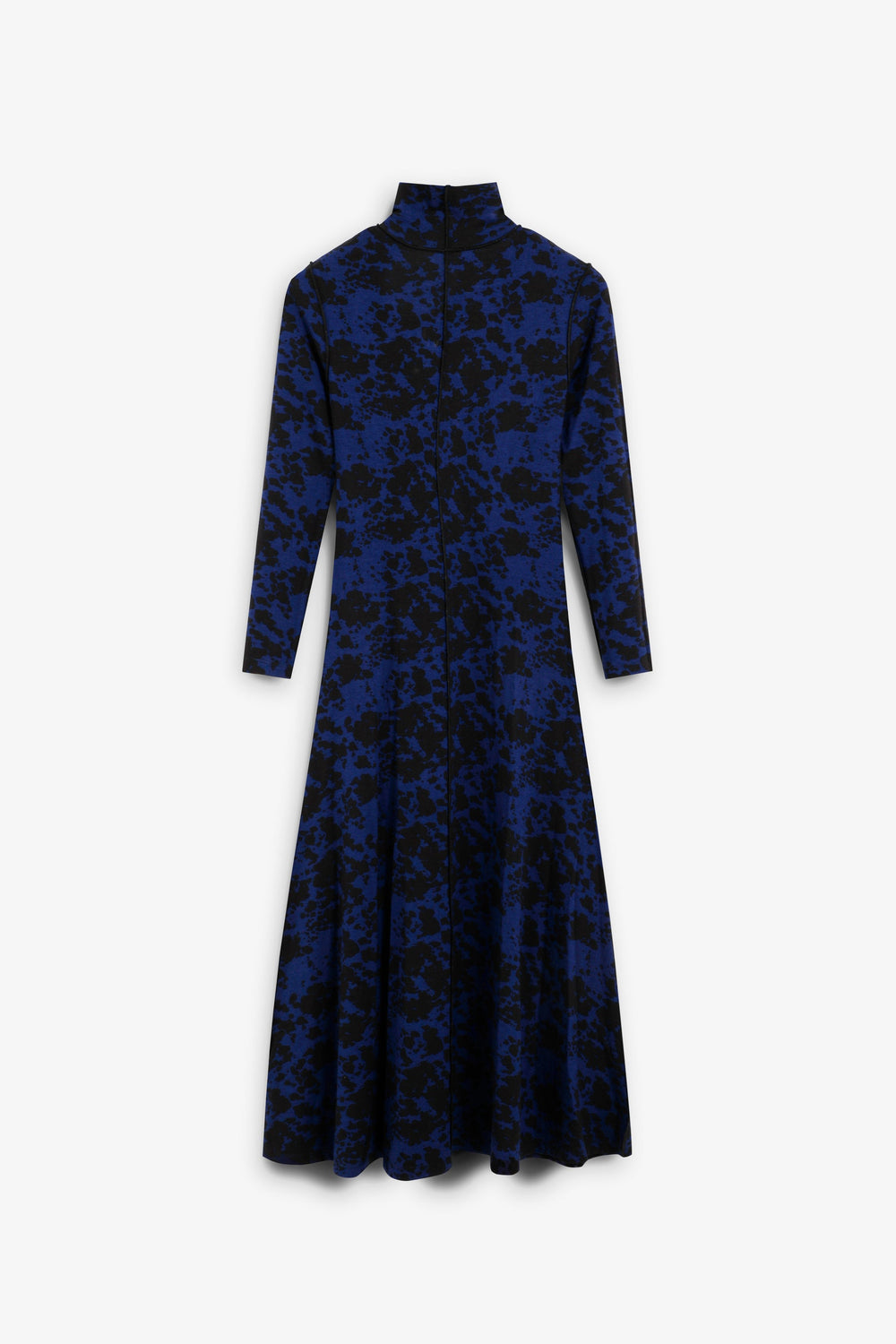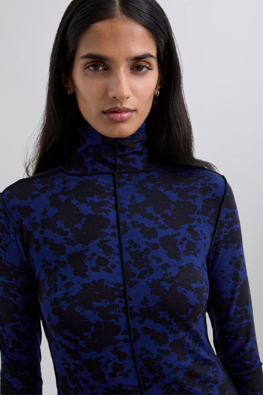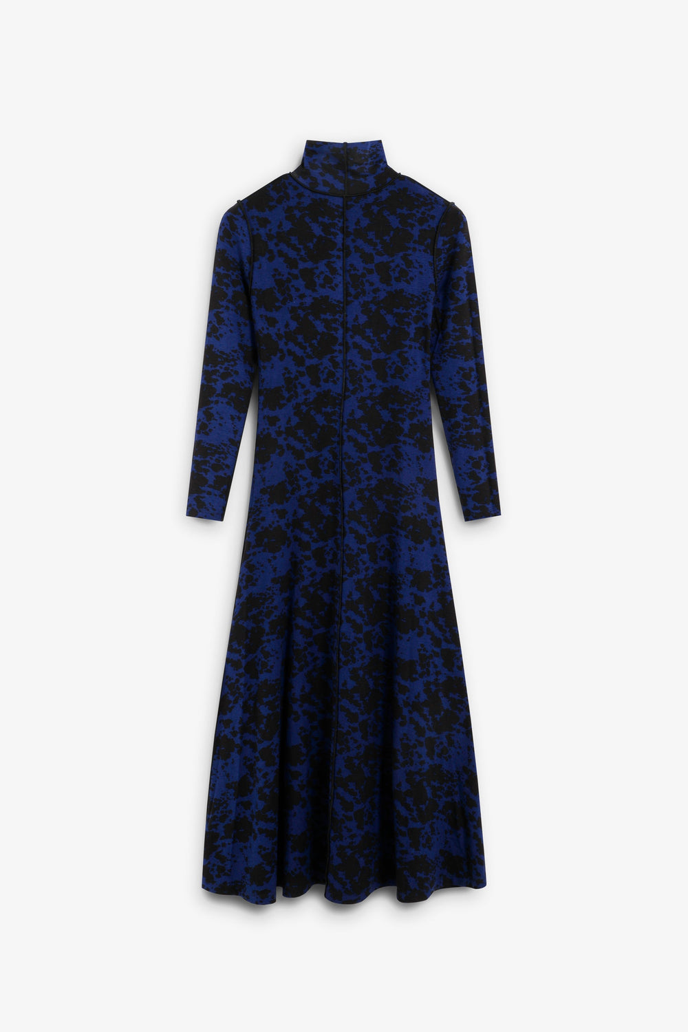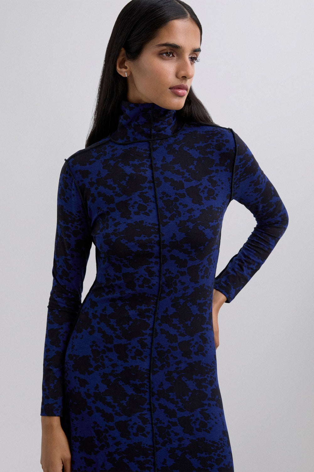 Vestido midi confeccionado en viscosa ligeramente elástica. Estampado animal print, cuello subido y manga larga. Detalles de costuras a la vista.