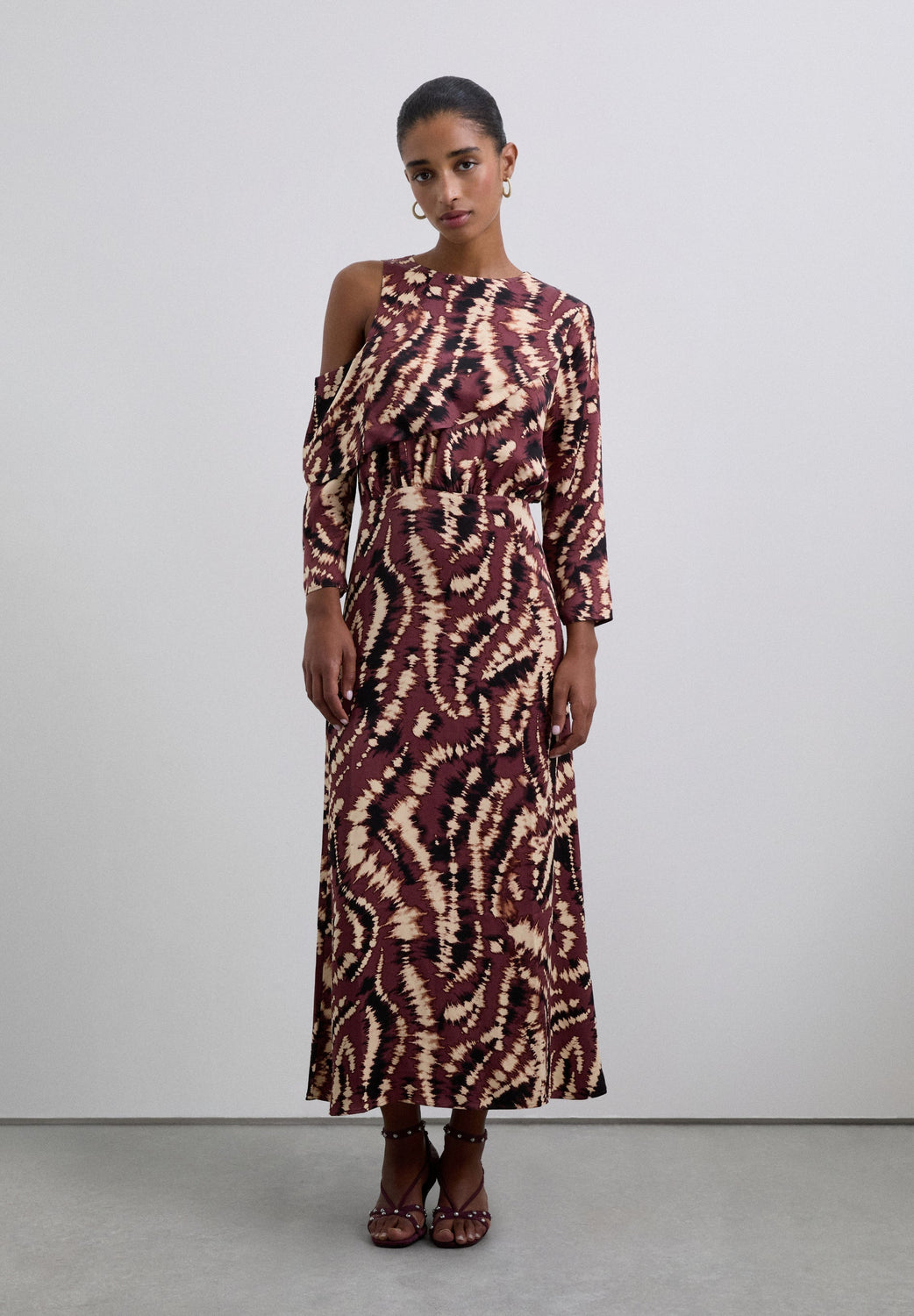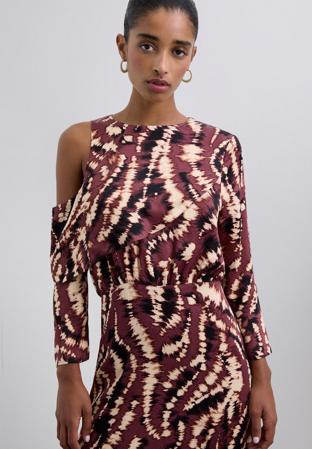 Vestido asimétrico confeccionado en 100% viscosa. Corte midi. Escote redondo asimétrico. Manga larga con abertura en hombro. Cierre con botón trasero.