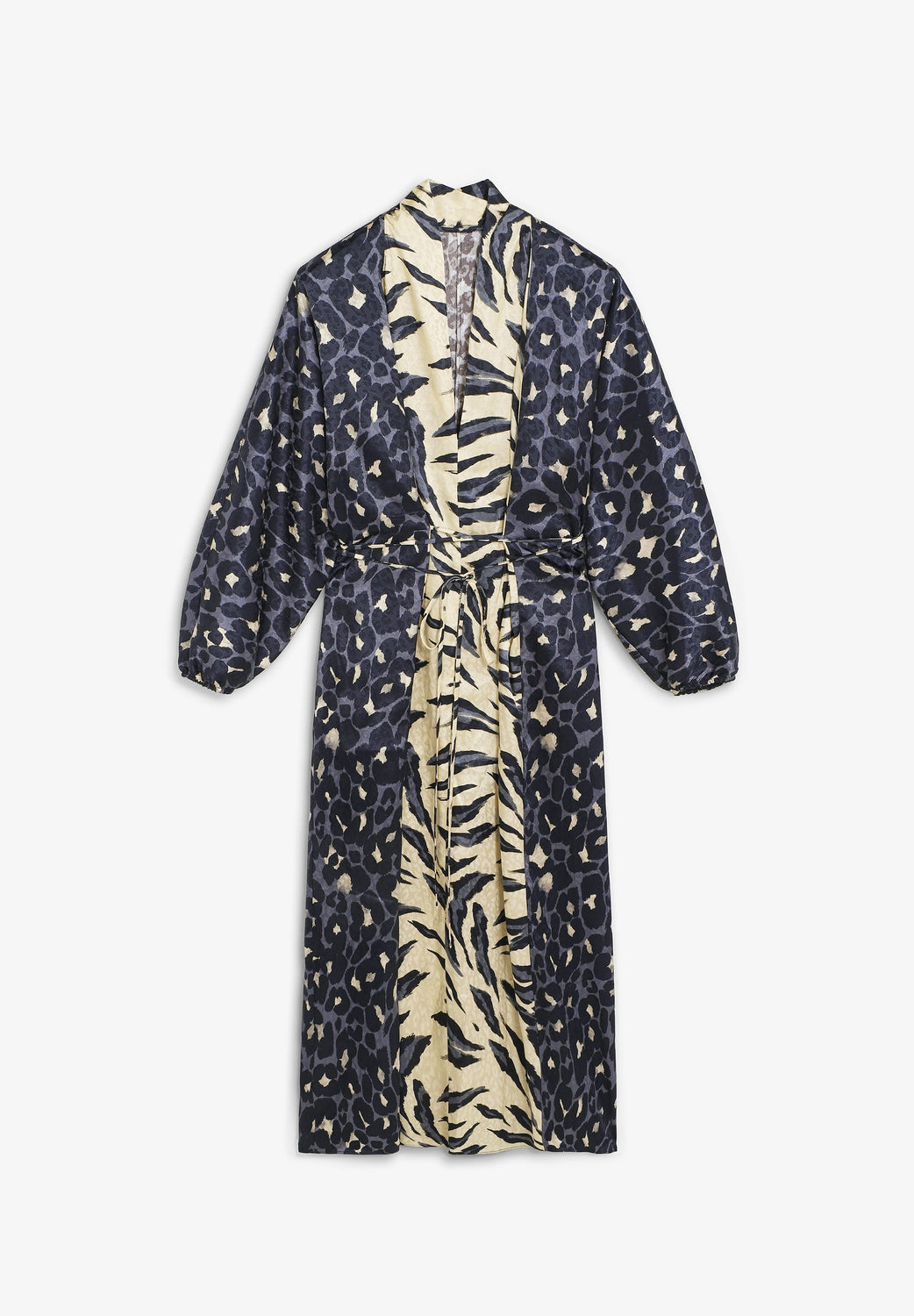 Vestido largo con estampado animal print. Manga larga ligeramente abullonada y terminada en frunce. Ajuste frontal mediante lazo. Escote en V.