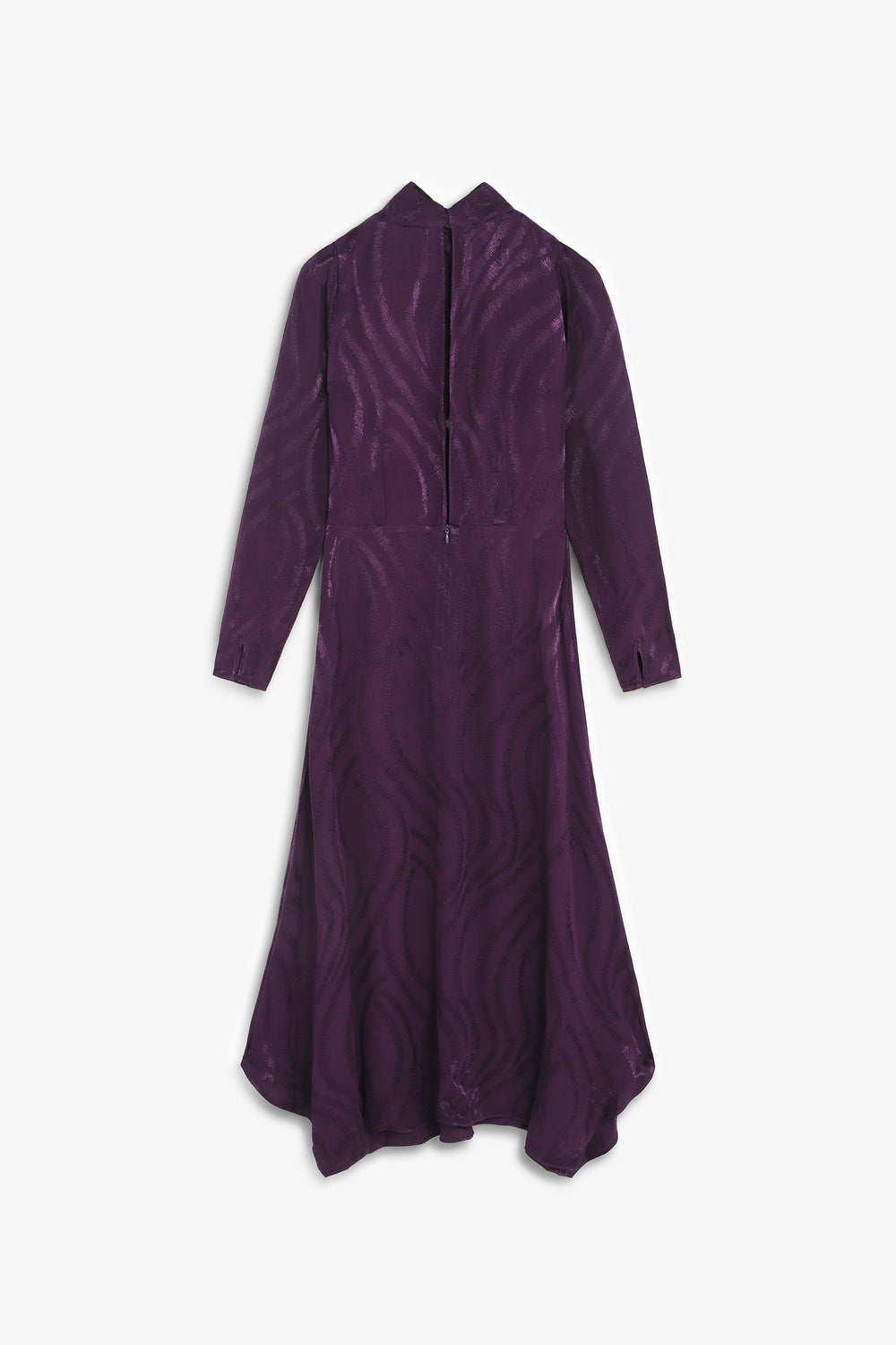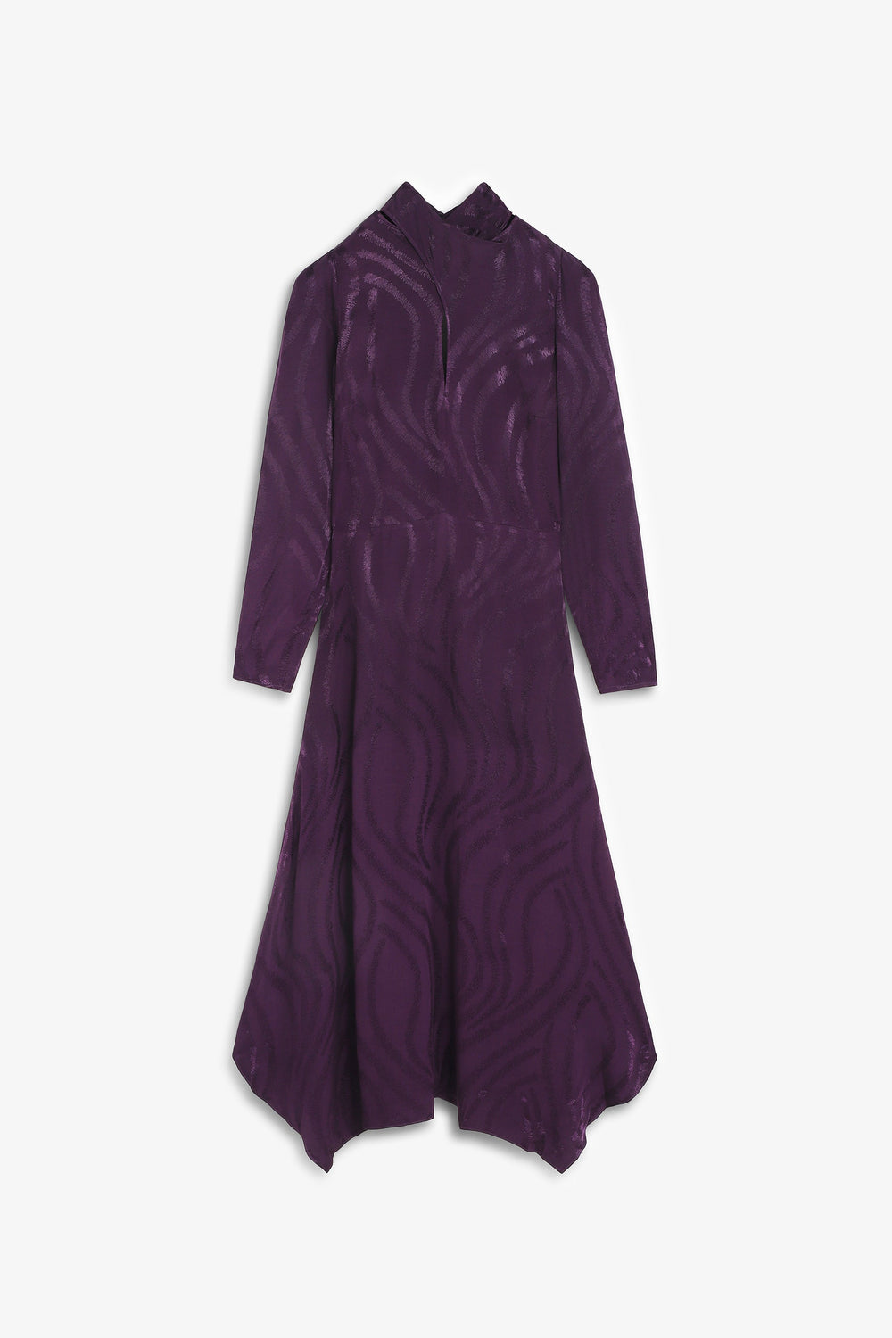 Vestido largo confeccionado en viscosa con diseño en relieve de ondas. Caída fluida y bajo asimétrico. Mangas largas. Cuello subido con cruce y abertura frontal. Cierre trasero con cremallera oculta.