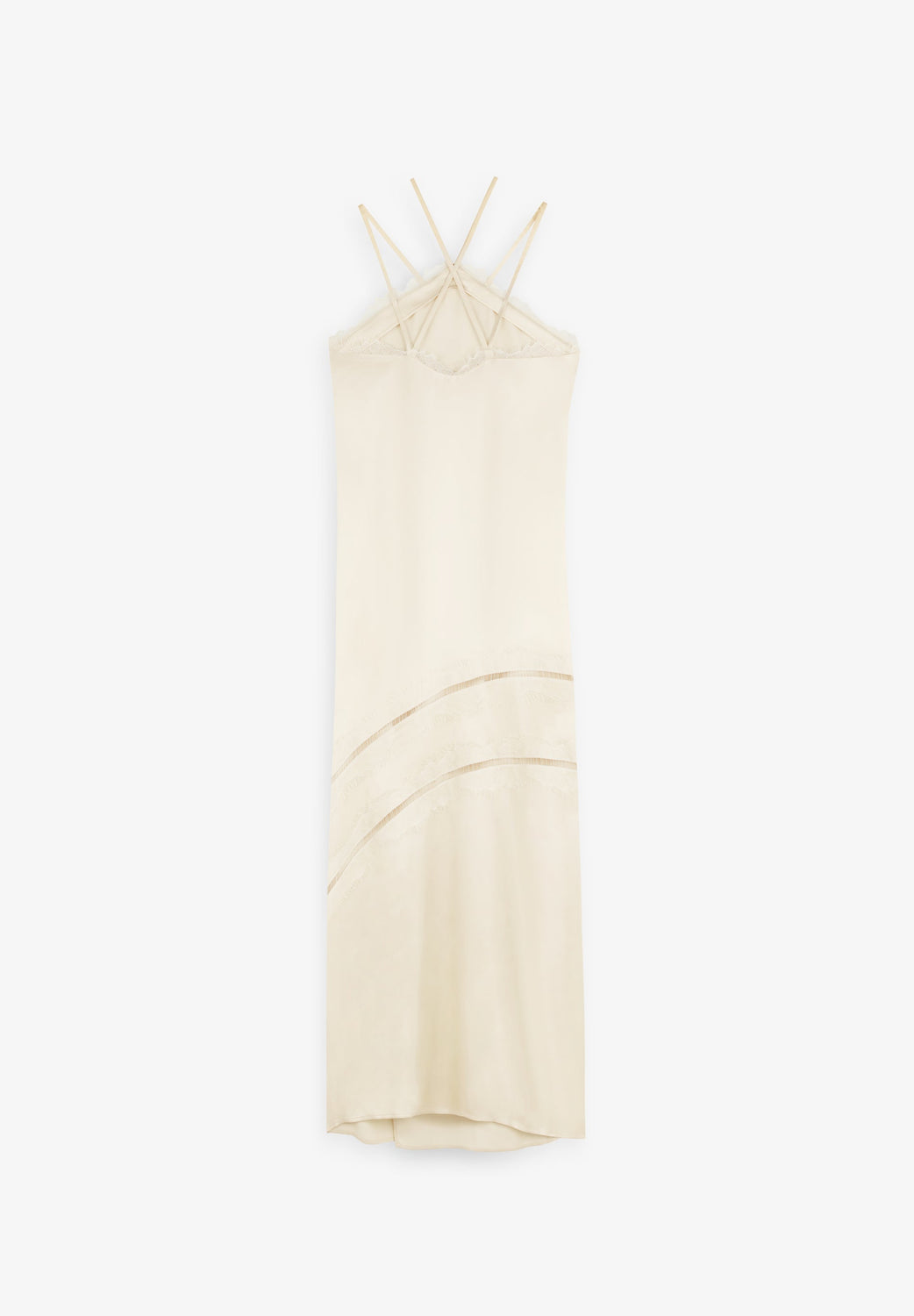 Vestido corte midi de tejido fluido y acabado satinado. Tirantes finos. Detalle de encaje en escote. Motivos asimétricos. Apertura en bajo.