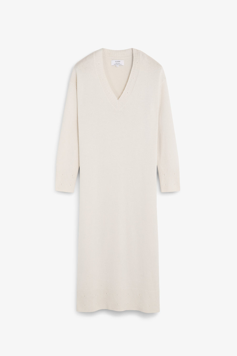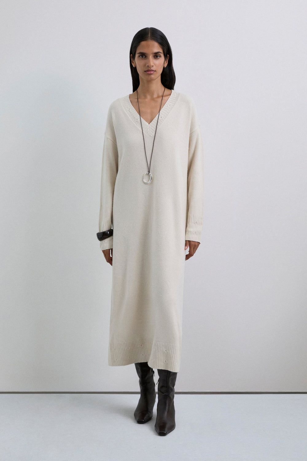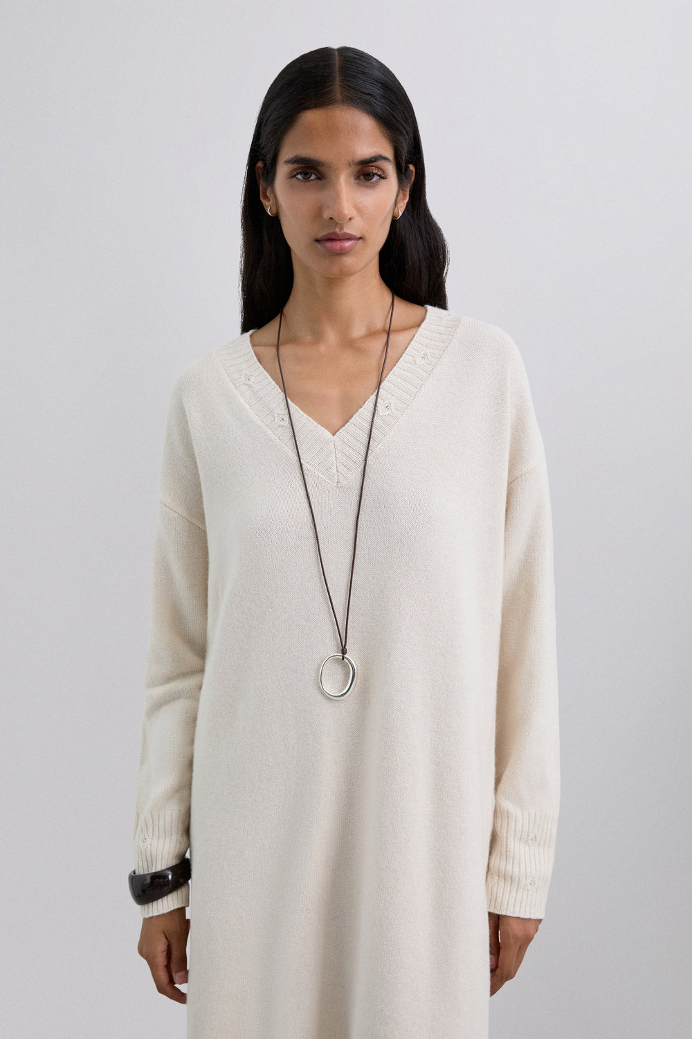 Vestido holgado confeccionado en mezcla de lana y viscosa. Largo midi y escote en V. Manga larga. Acabado en rib en escote, puños y bajo con detalles de aberturas circulares.