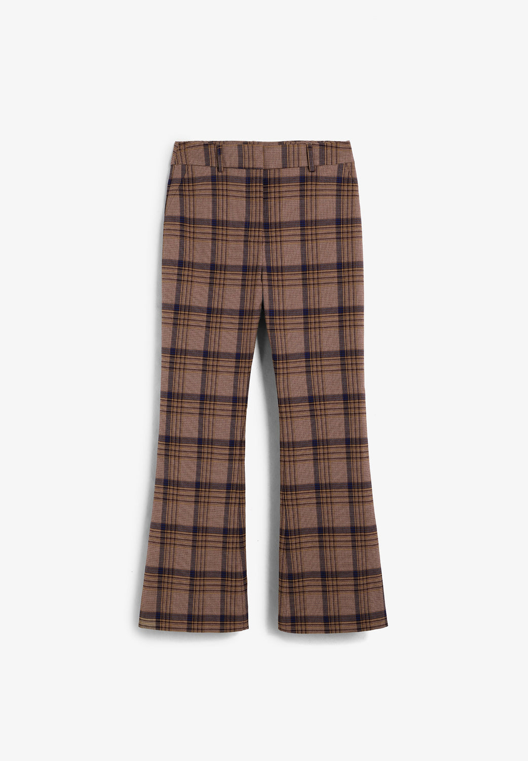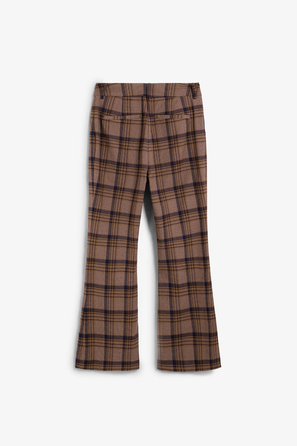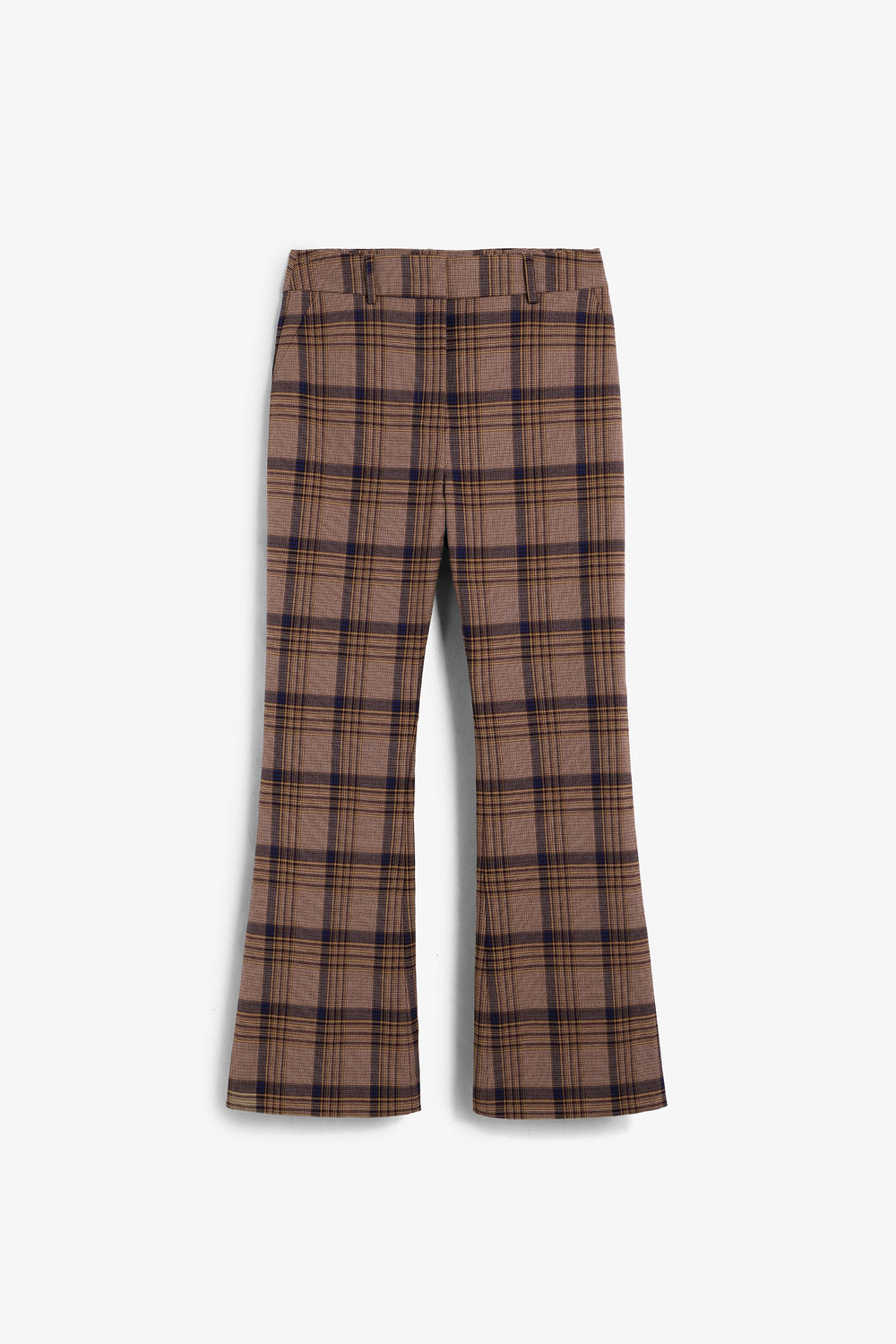 Pantalones ankle flare. Estampado de cuadros. Dos bolsillos laterales y en la parte posterior. Cierre oculto con cremallera y gancho. Trabillas en cintura.