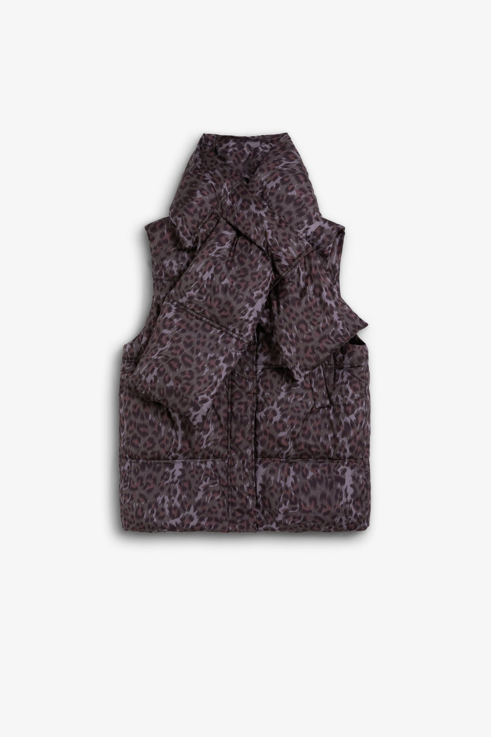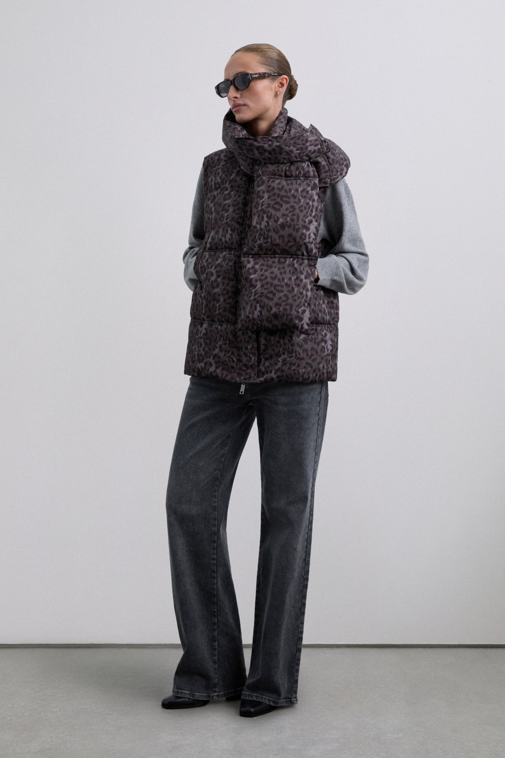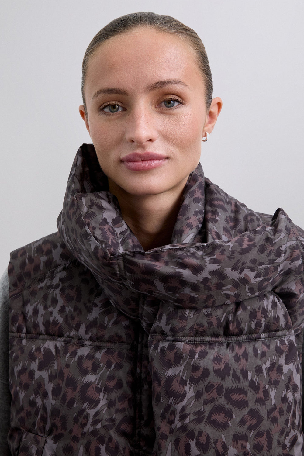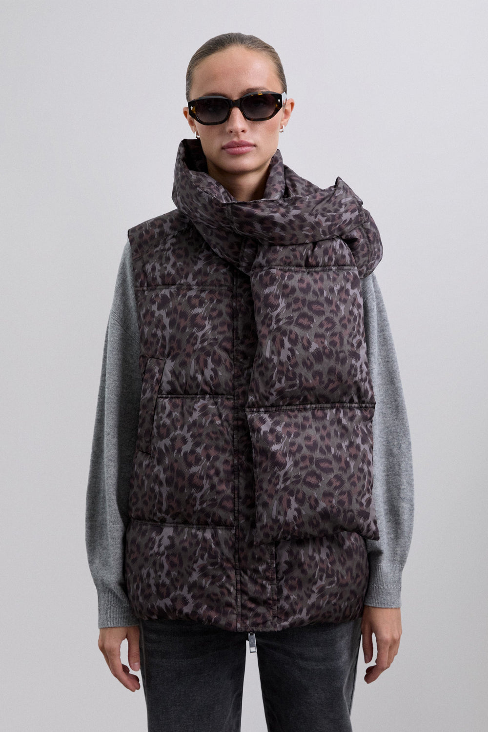 Chaleco acolchado con estampado de animal. Cierre con cremallera oculta y botones a presión. Corte holgado. Bufanda acolchada desmontable en el cuello. Dobladillo con cordón ajustable. Dos bolsillos frontales.
