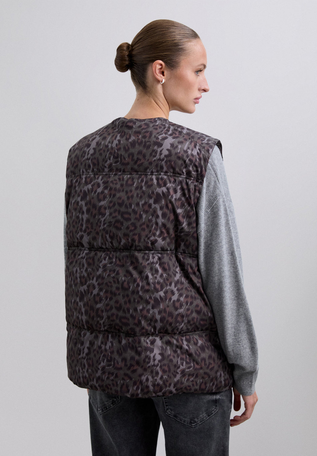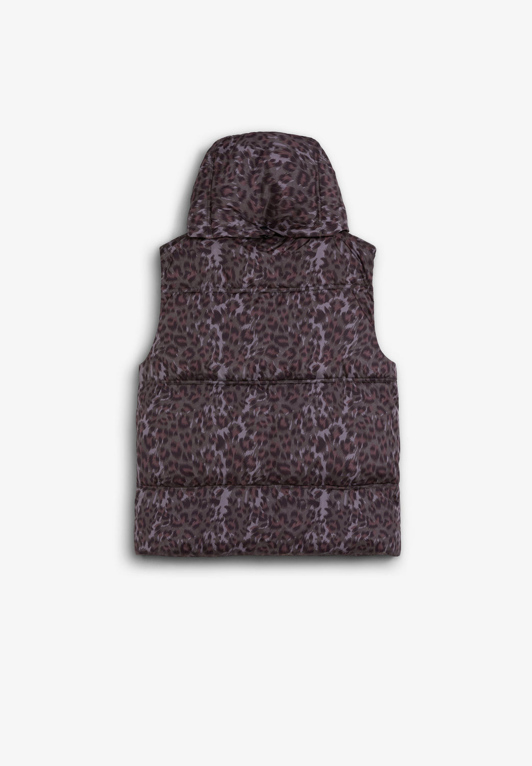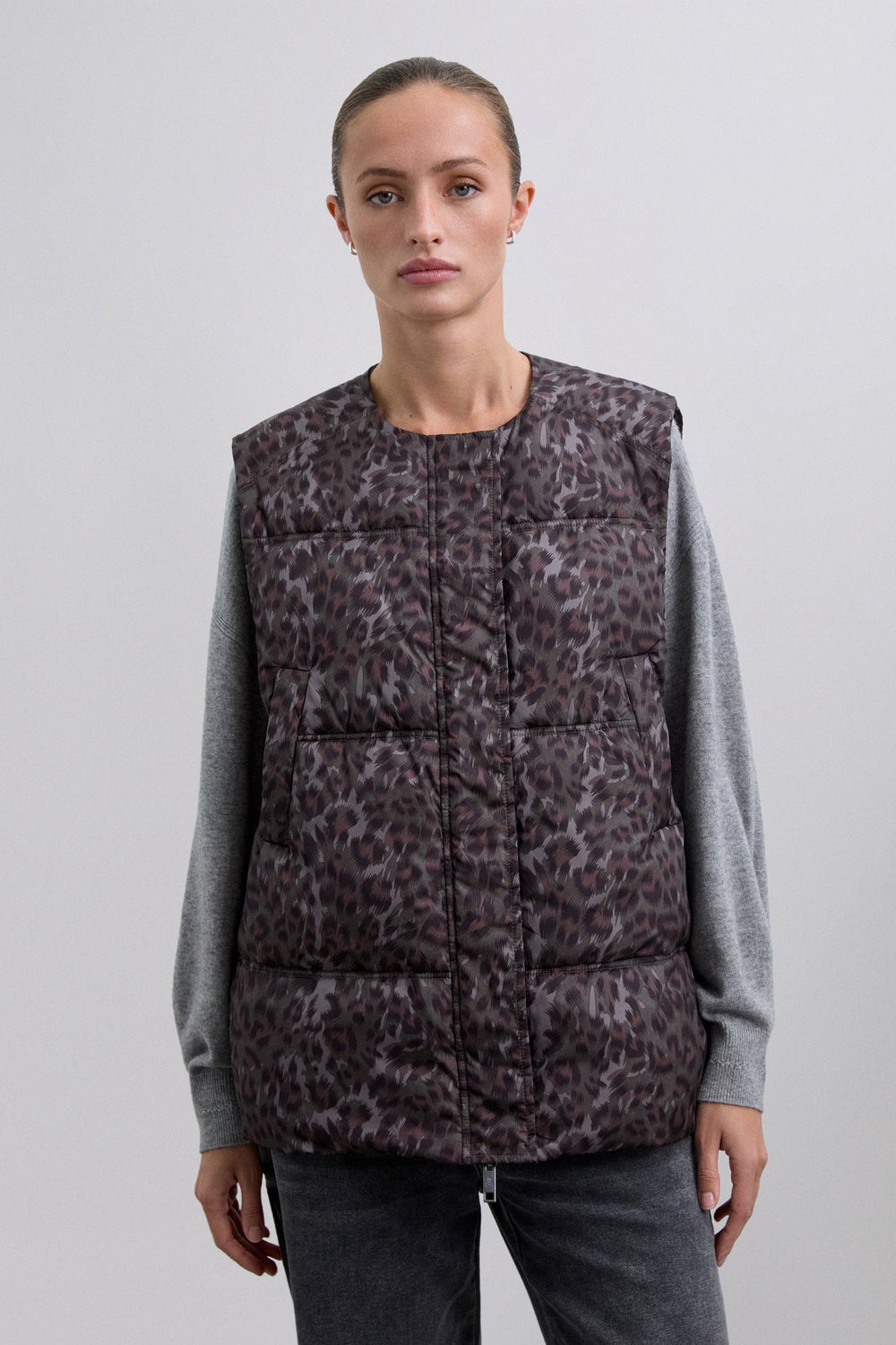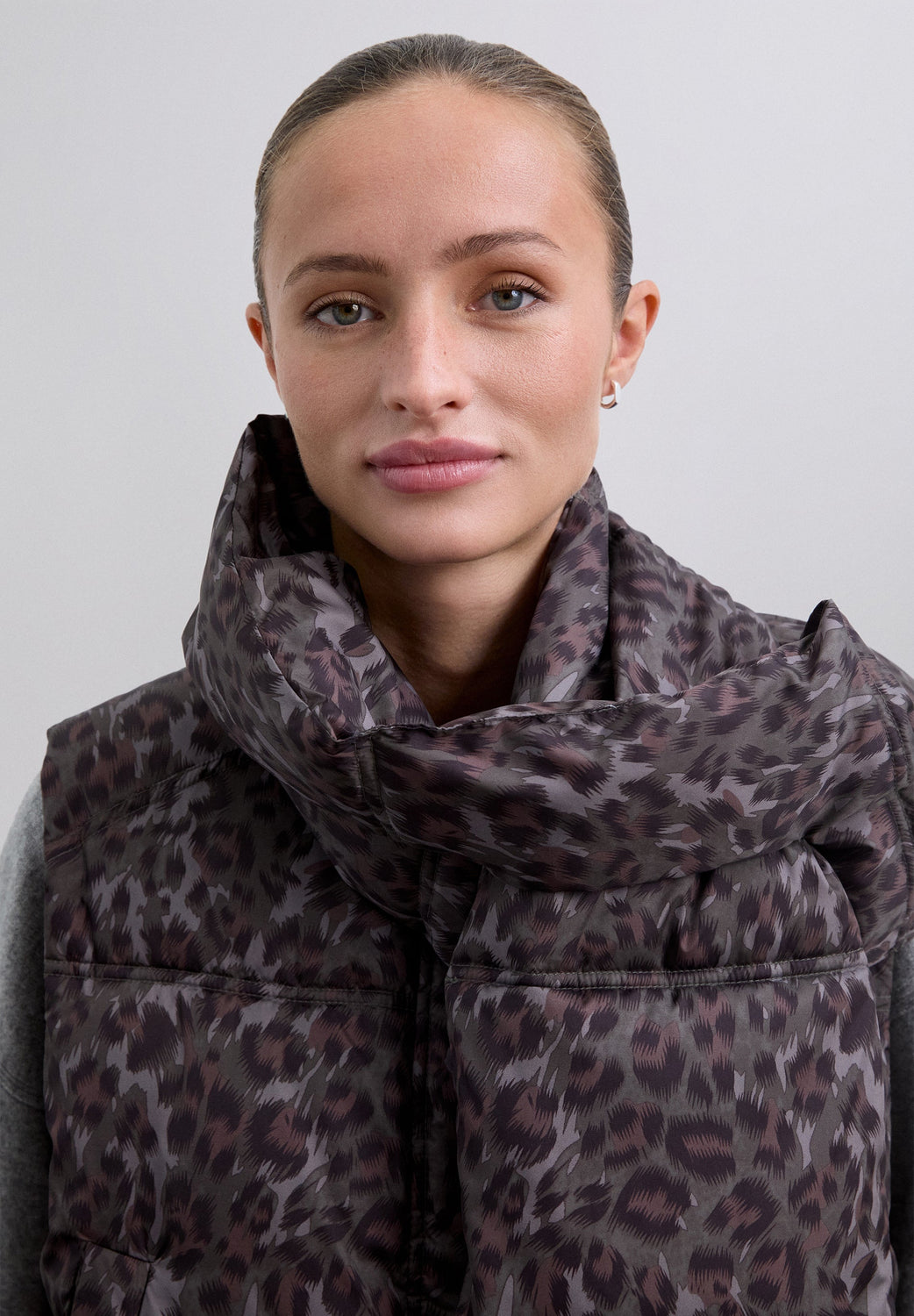 Chaleco acolchado con estampado de animal. Cierre con cremallera oculta y botones a presión. Corte holgado. Bufanda acolchada desmontable en el cuello. Dobladillo con cordón ajustable. Dos bolsillos frontales.