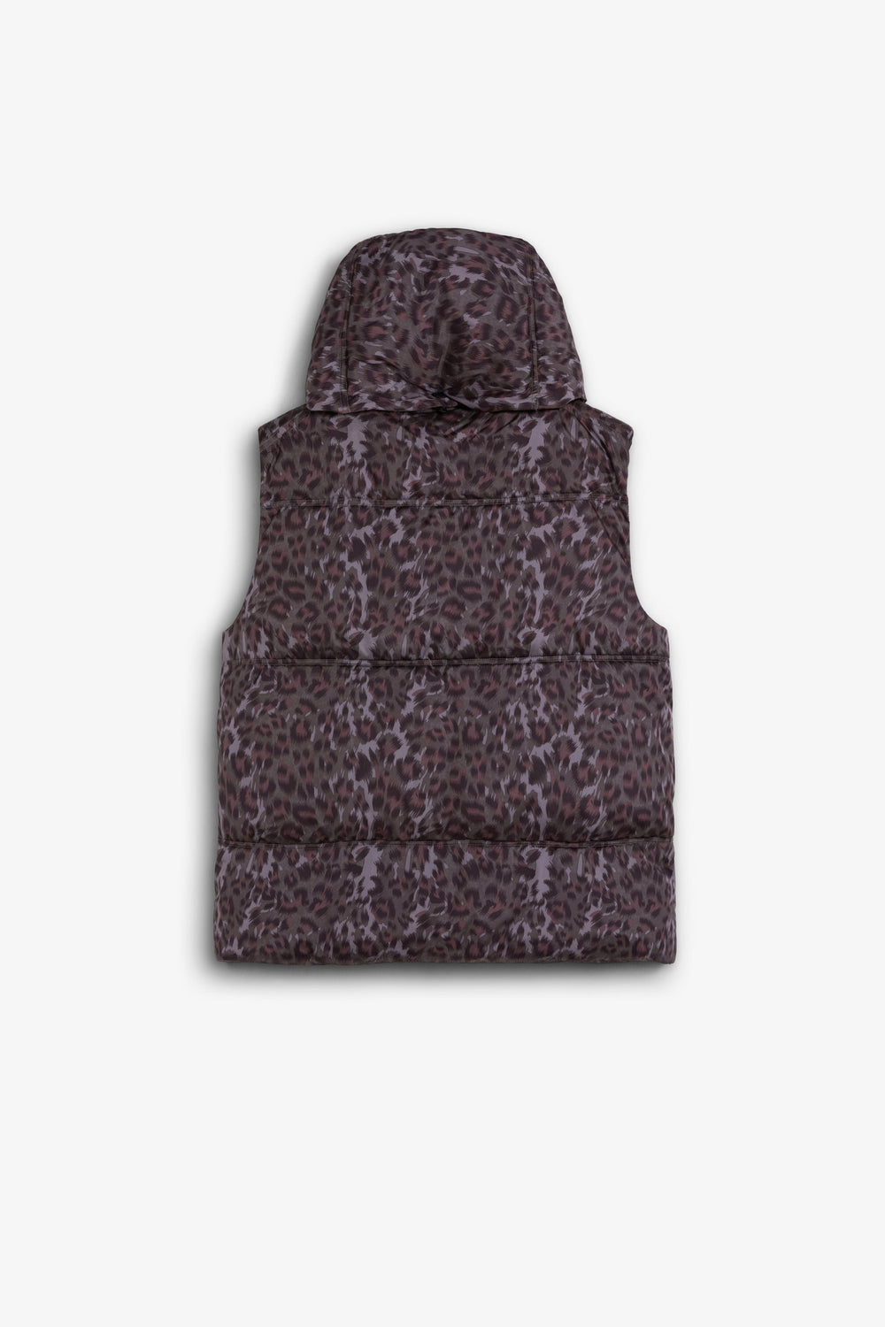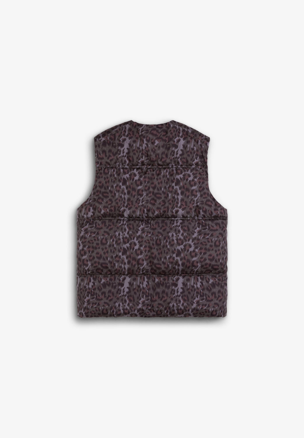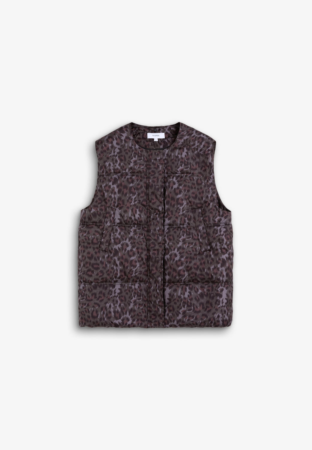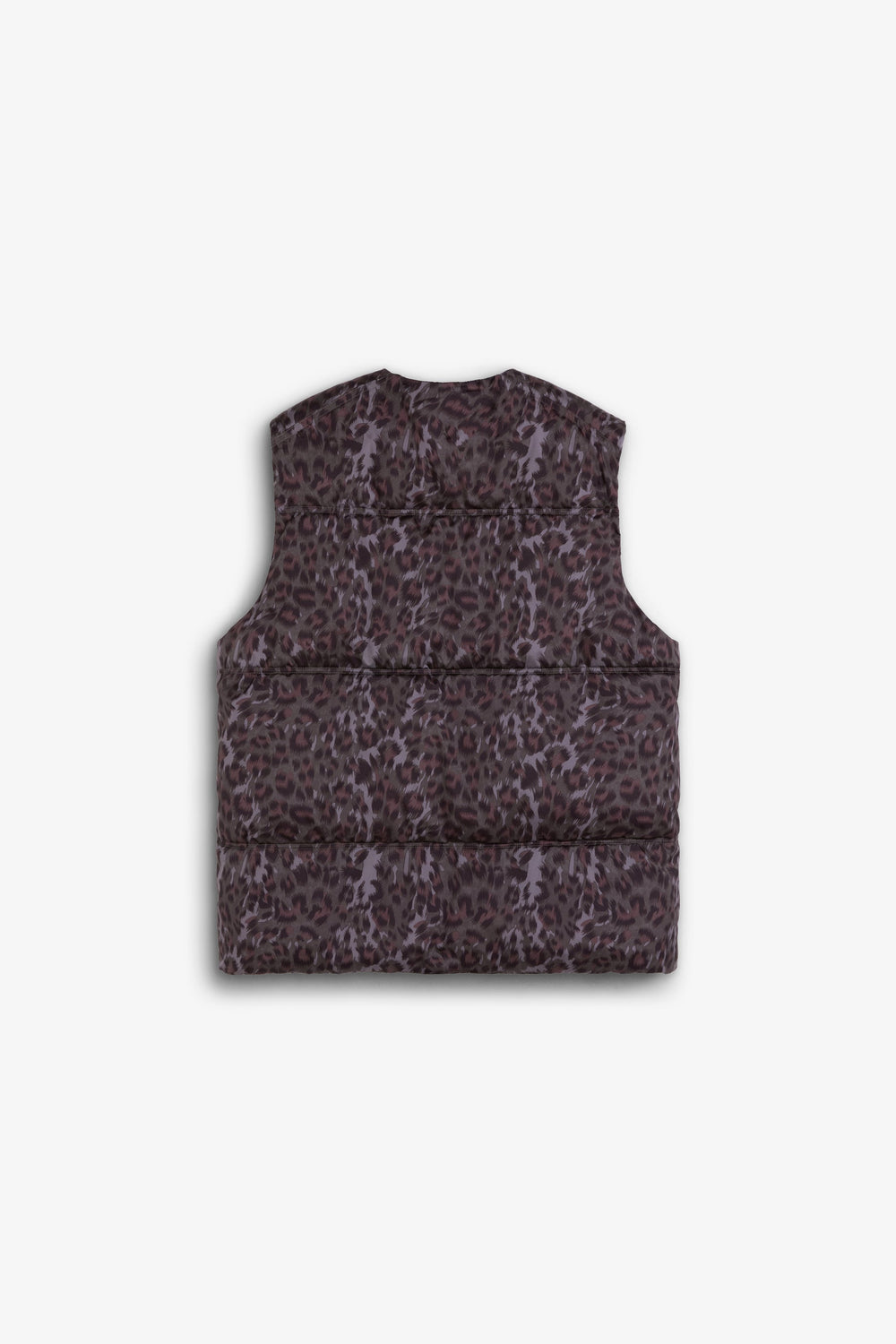 Chaleco acolchado con estampado de animal. Cierre con cremallera oculta y botones a presión. Corte holgado. Bufanda acolchada desmontable en el cuello. Dobladillo con cordón ajustable. Dos bolsillos frontales.