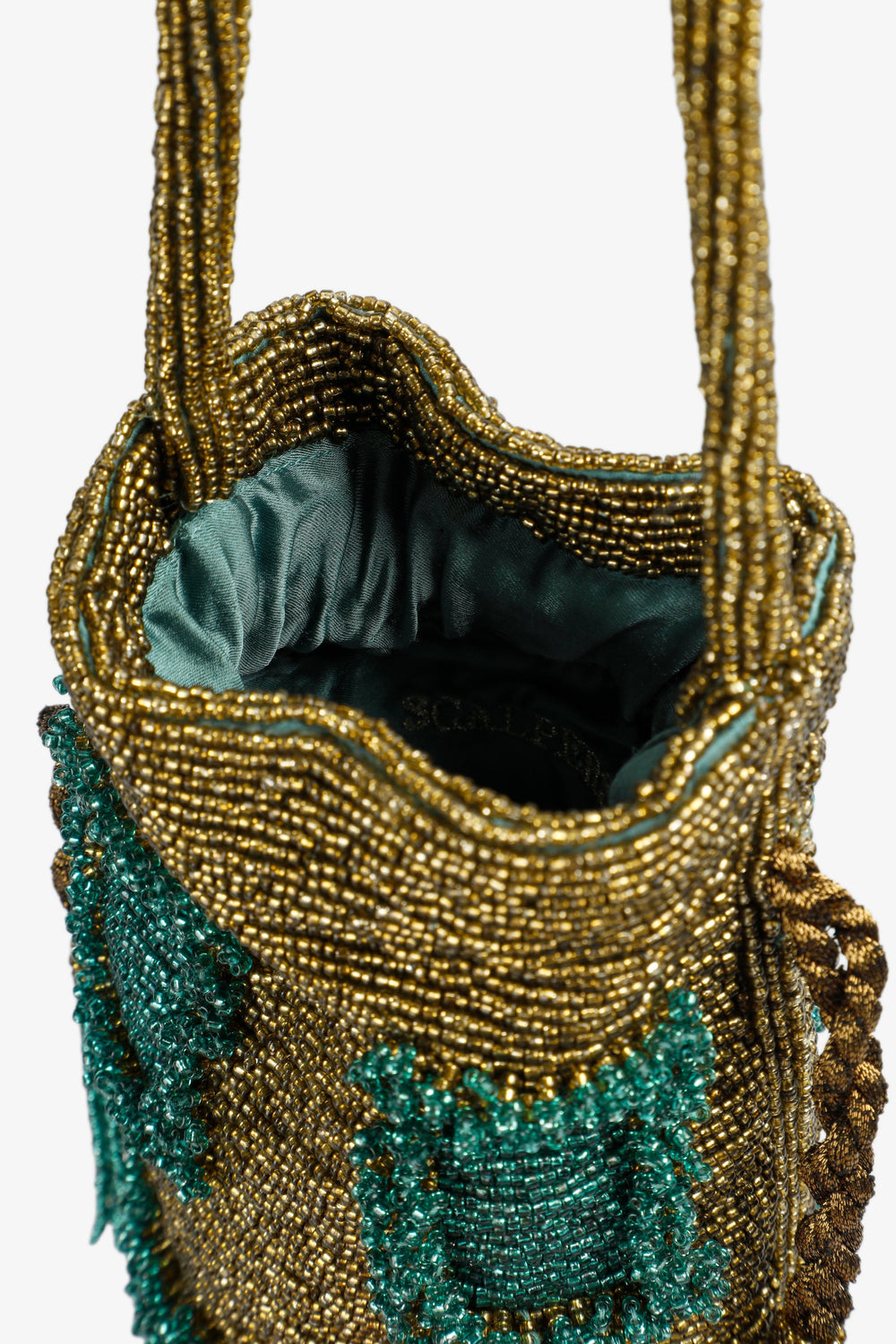 Bolso mini bicolor confeccionado con cuentas metalizadas. Forro interior. Asa larga. Cierre con cintas ajustables.