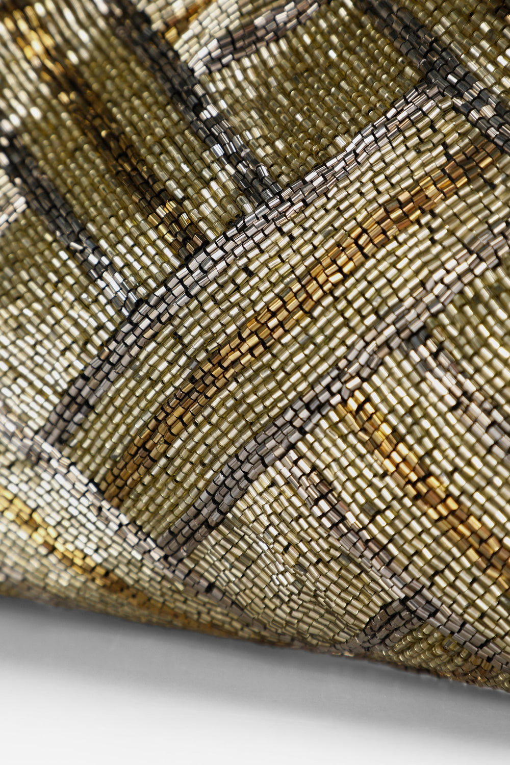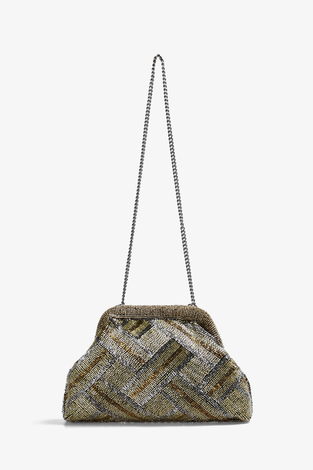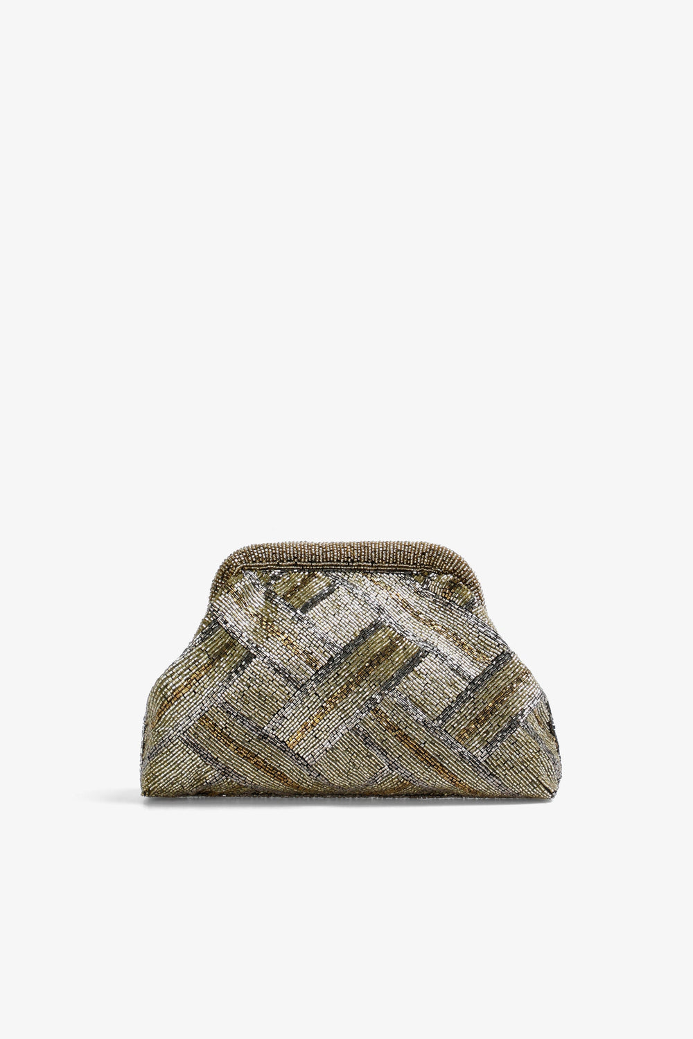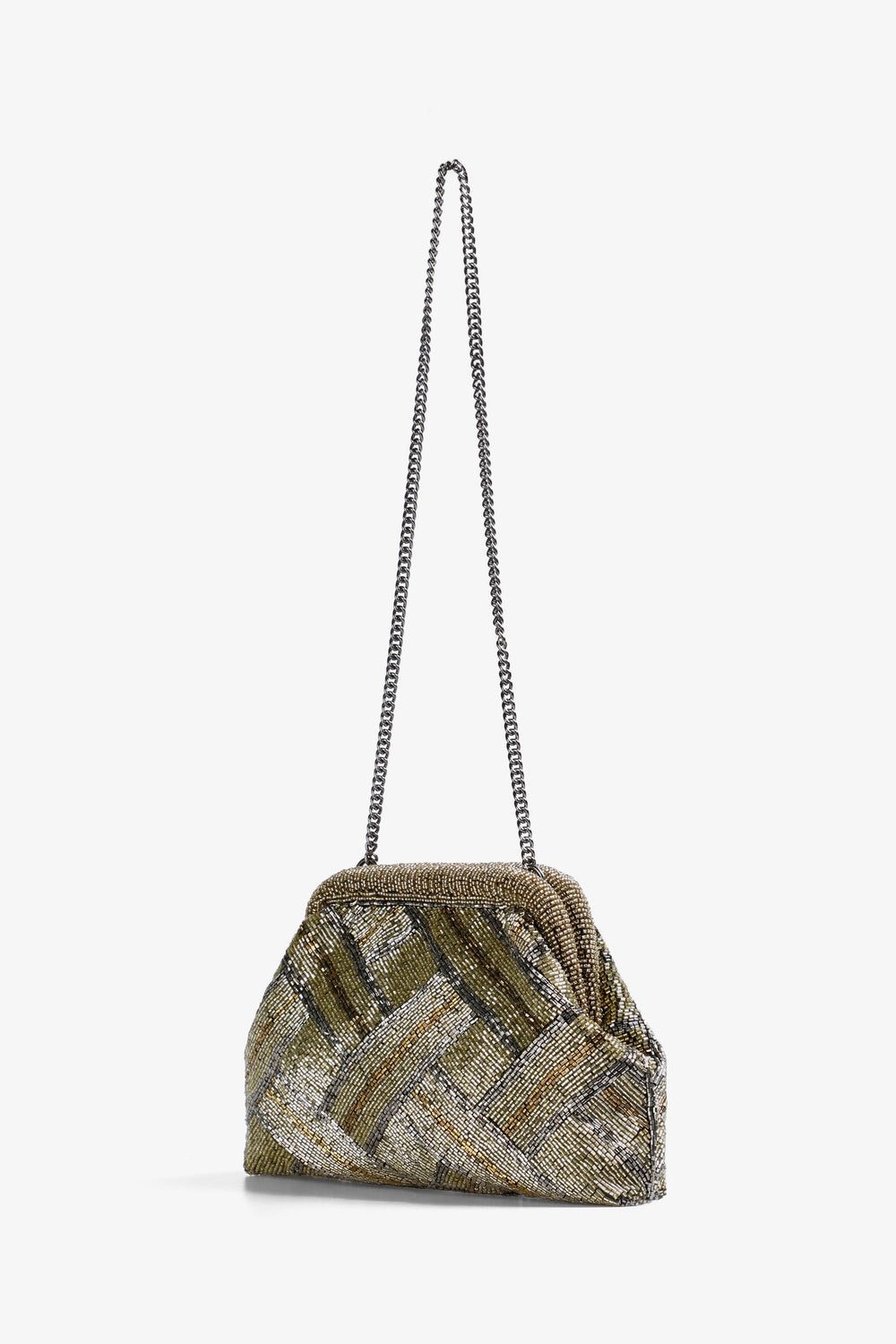 Bolso clutch confeccionado en algodón con detalle de print geométrico realizado en cuentas metalizadas. Forro interior y asa de cadena interior extraíble.