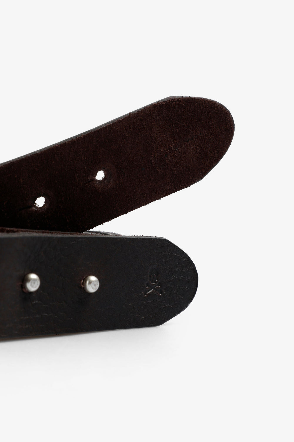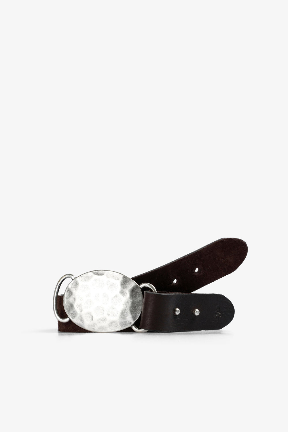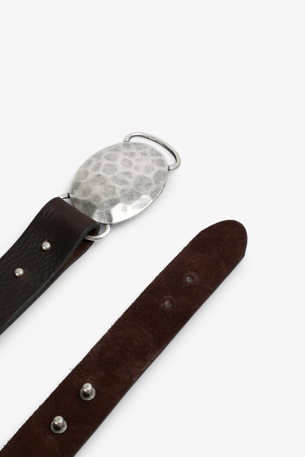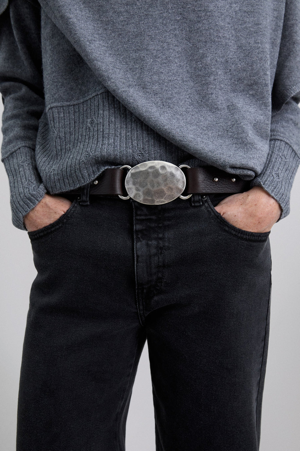 Cinturón confeccionado en 100% piel con hebilla metálica ovalada con textura irregular.