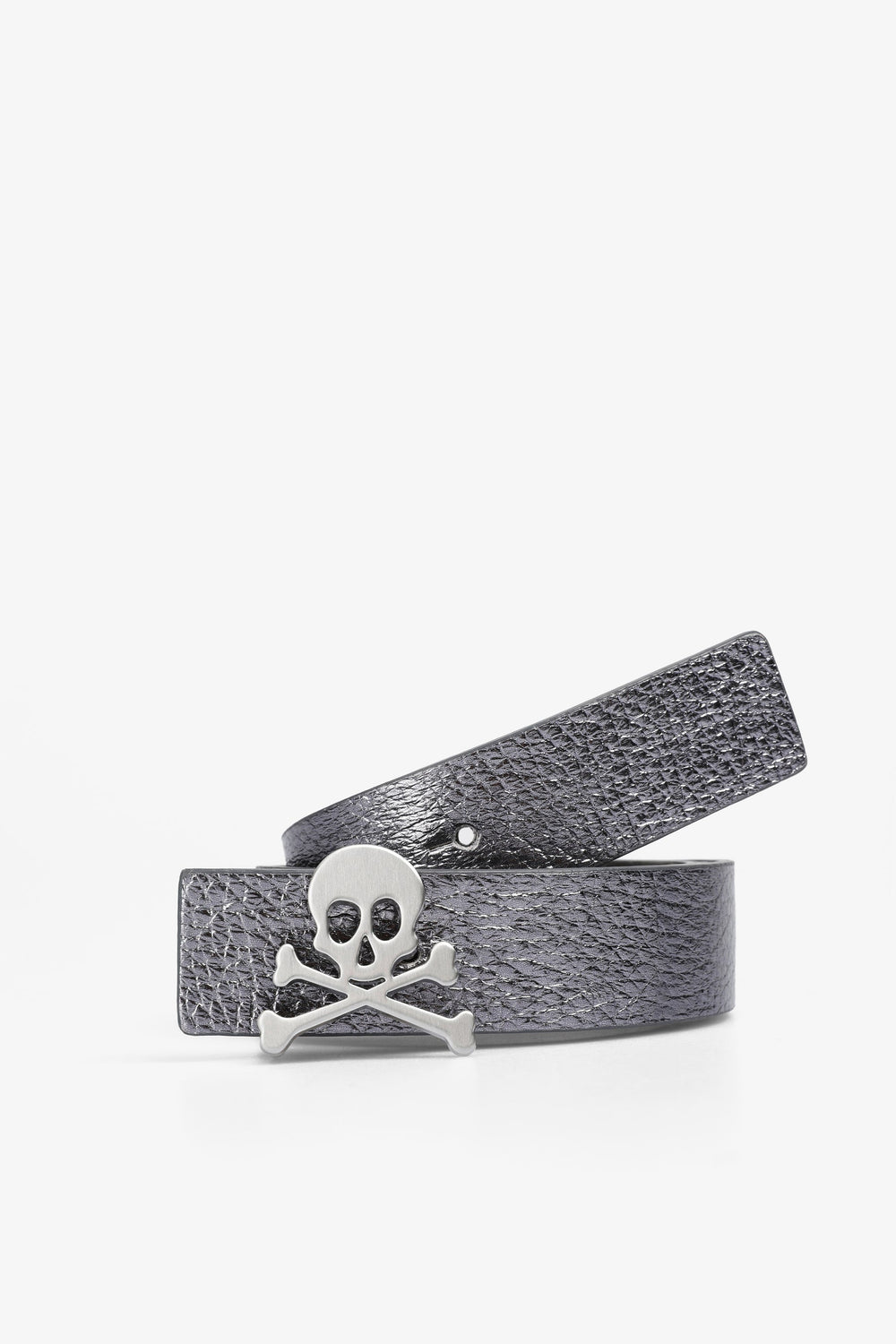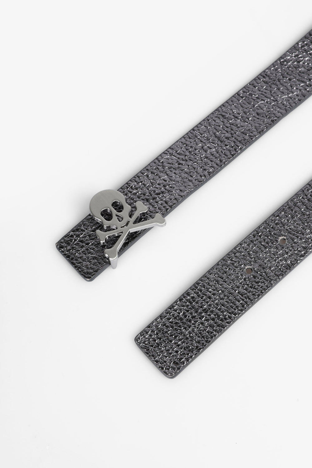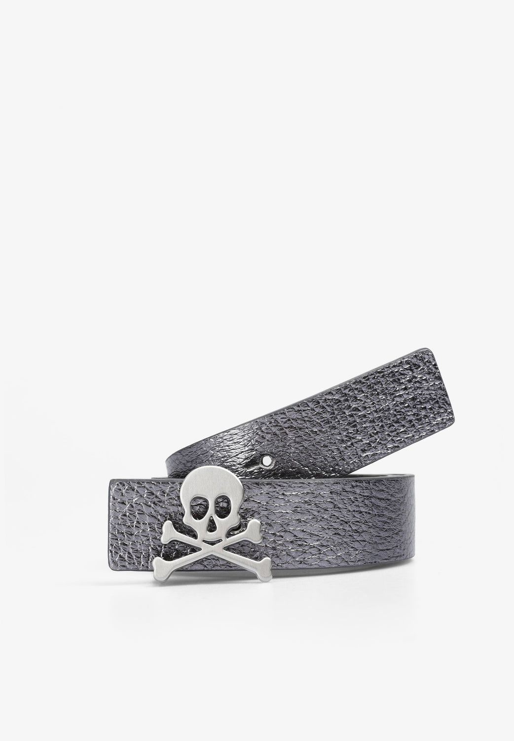 Cinturón confeccionado en 100% piel. Reversible ajustable. Detalle de calavera metalizada.