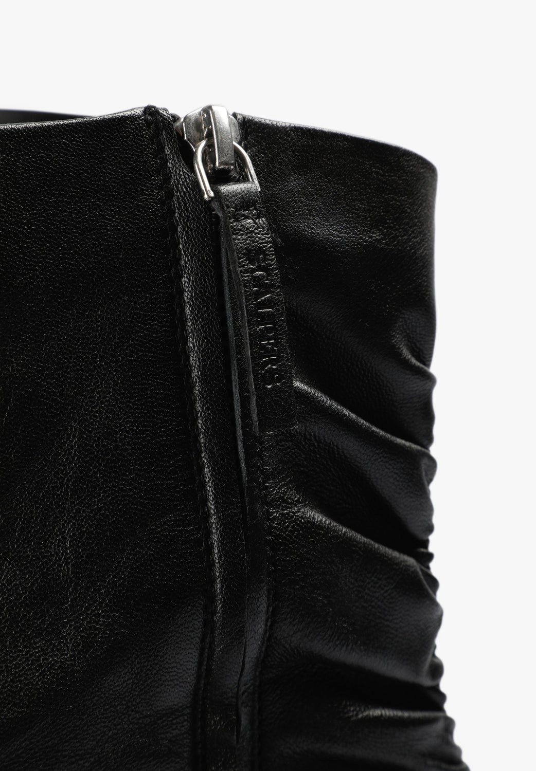 Botas confeccionadas en 100% piel. Tacón medio. Detalle de efecto drapeado en el centro delantero. Cierre con cremallera. Detalle de logo bordado en cremallera. Altura del tacón: 7,5 cm.
