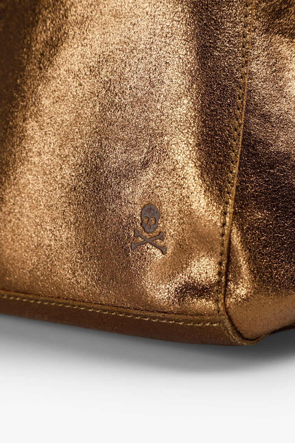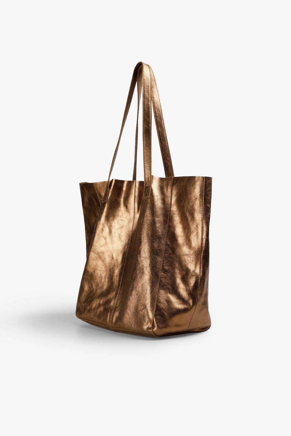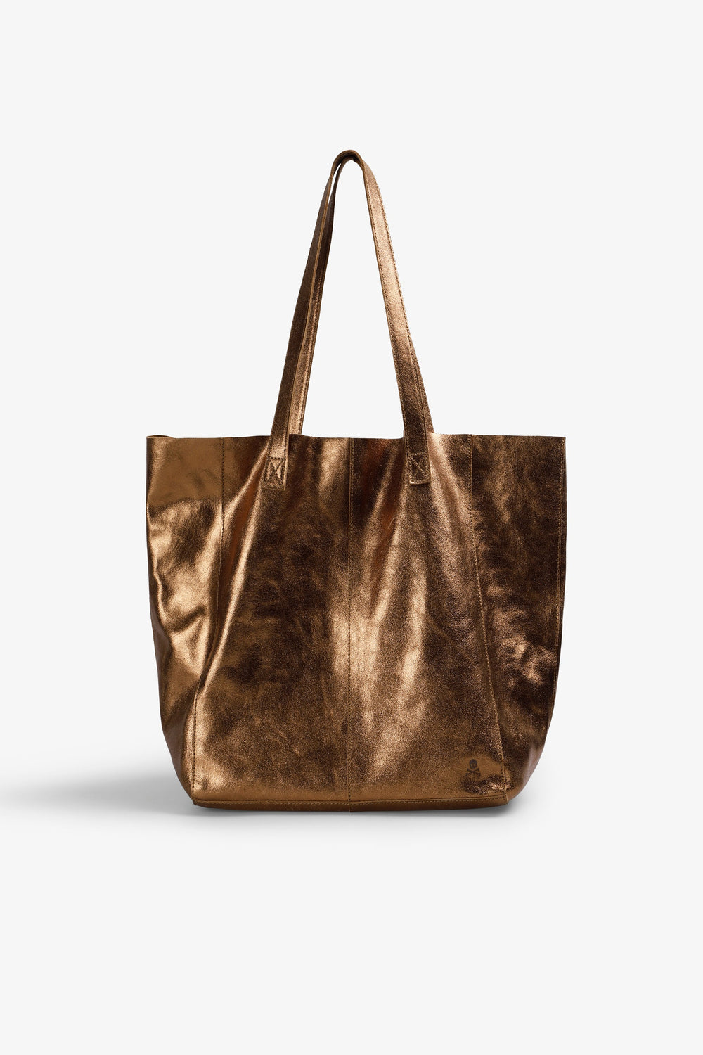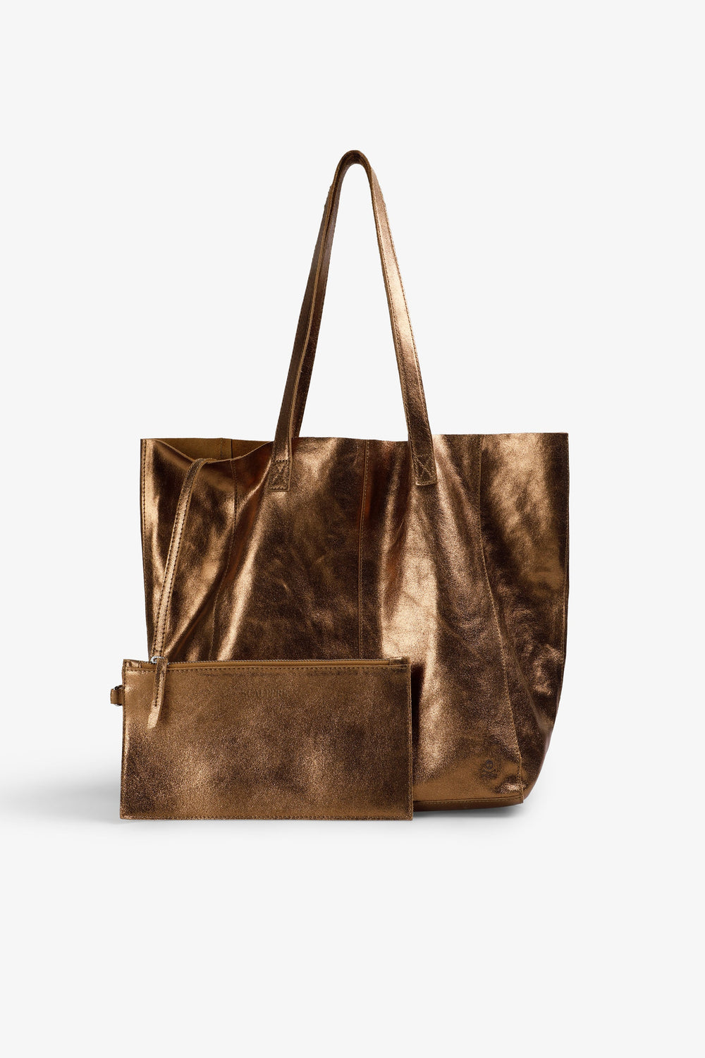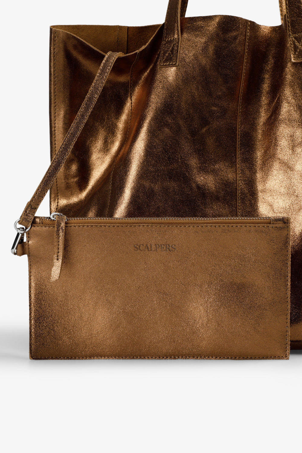 Bolso shopper confeccionado en 100% ante con acabado metalizado. Piel vuelta en interior y cartera a juego con cierre de cremallera.