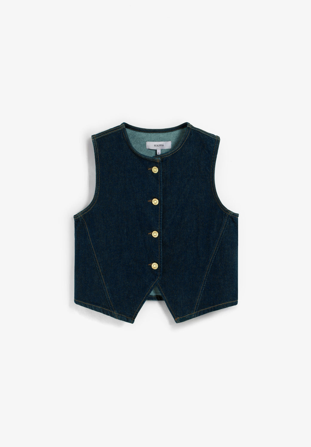 Chaleco denim confeccionado en algodón BCI ligeramente elástico. Slim fit, cropped con cuello redondo y manga en sisa. Cierre mediante botones y cut-out frontal y trasero.