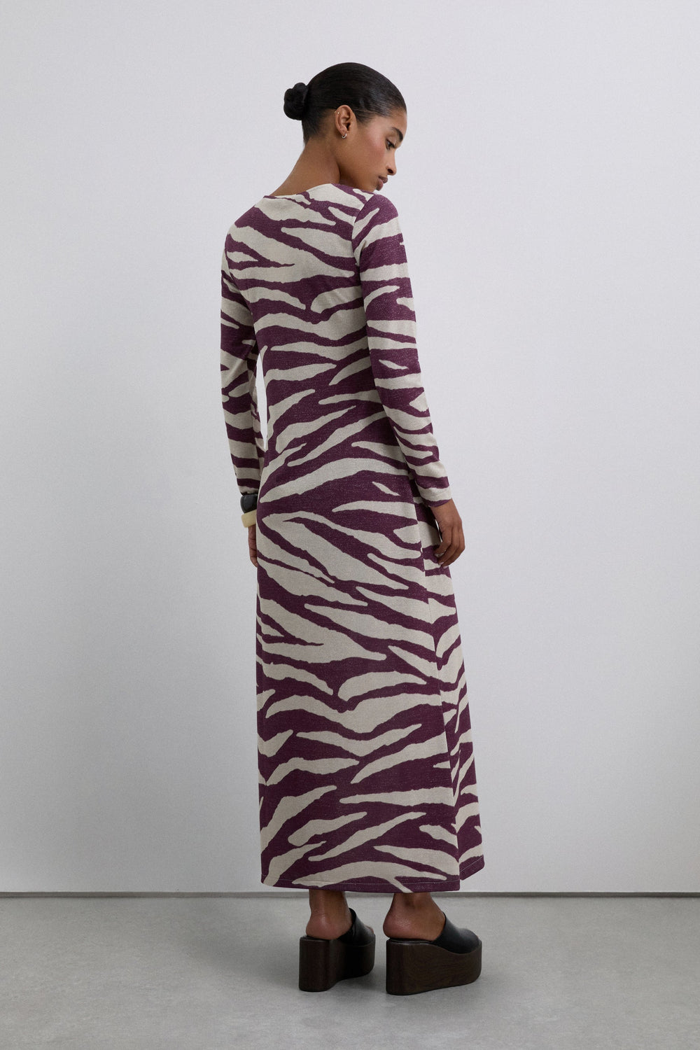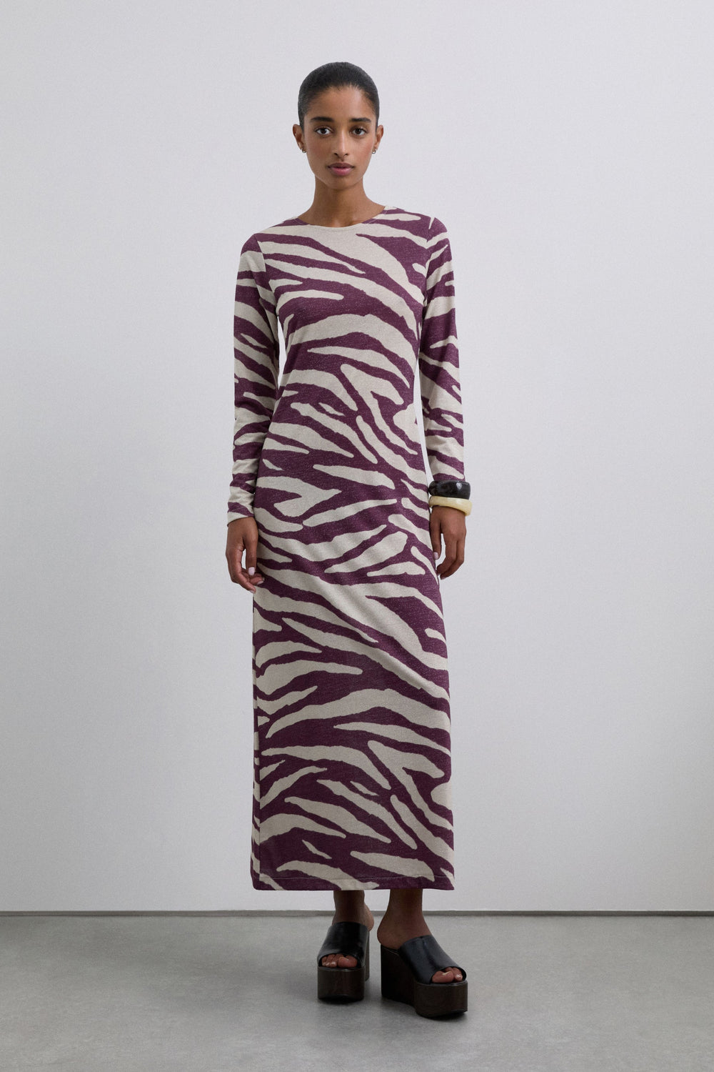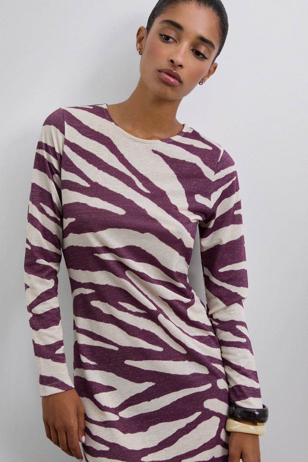 Vestido largo confeccionado en punto fino de lúrex ligeramente elástico. Estampado animal print. Cuello redondo y manga larga.