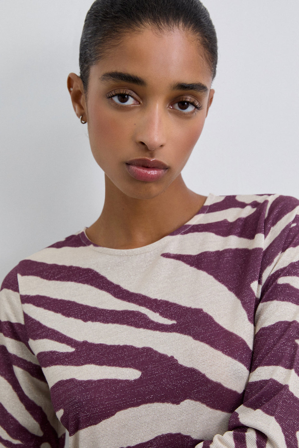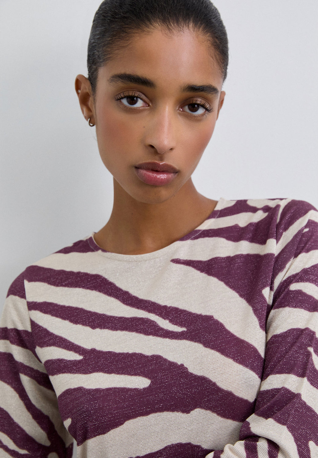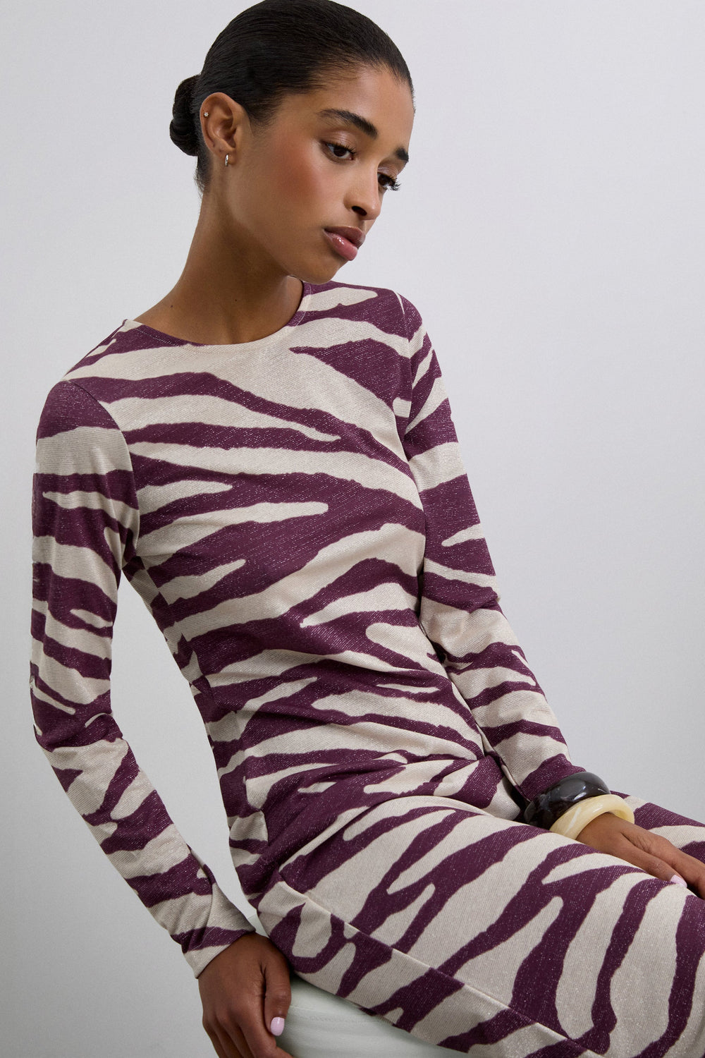 Vestido largo confeccionado en punto fino de lúrex ligeramente elástico. Estampado animal print. Cuello redondo y manga larga.